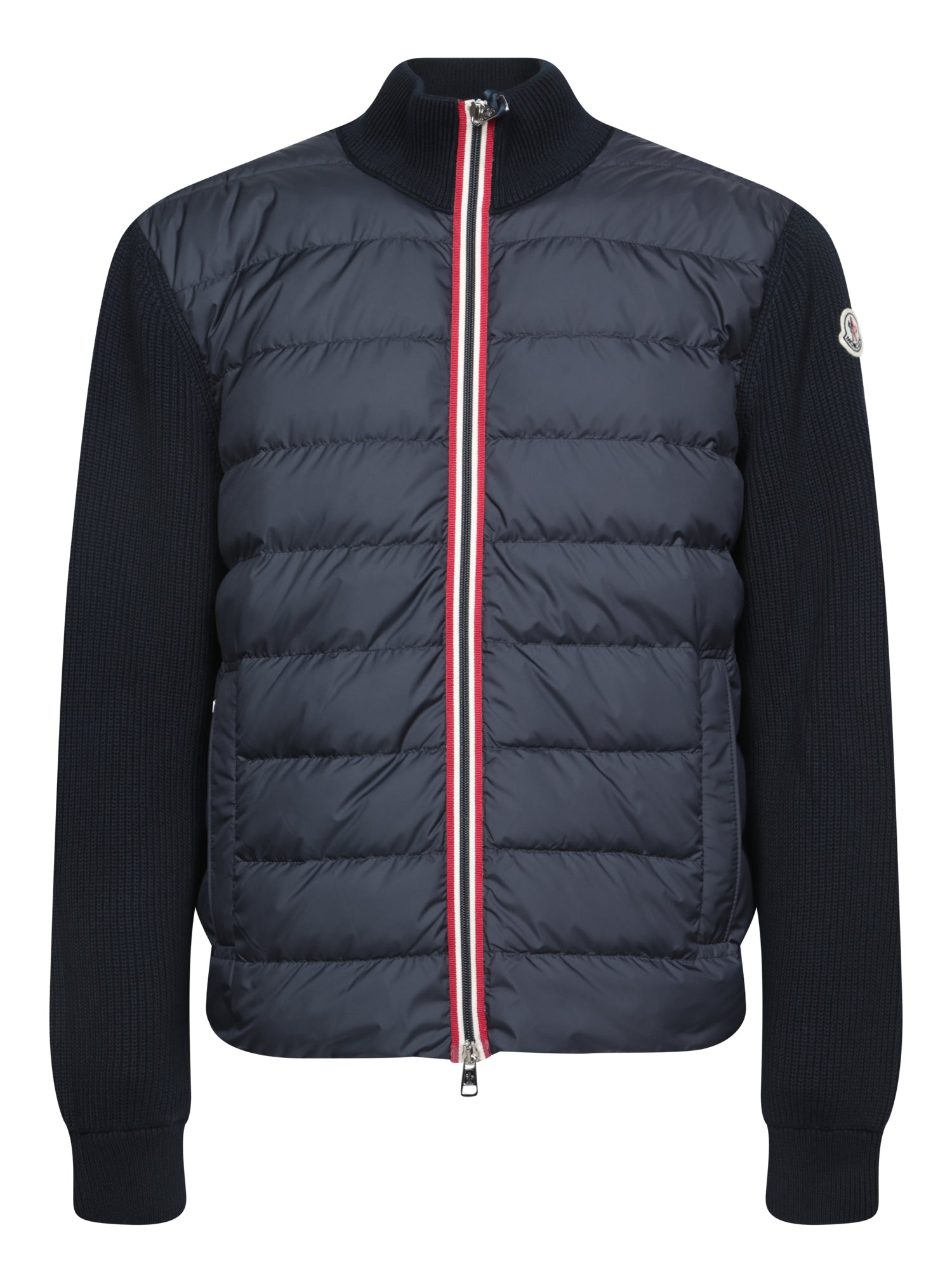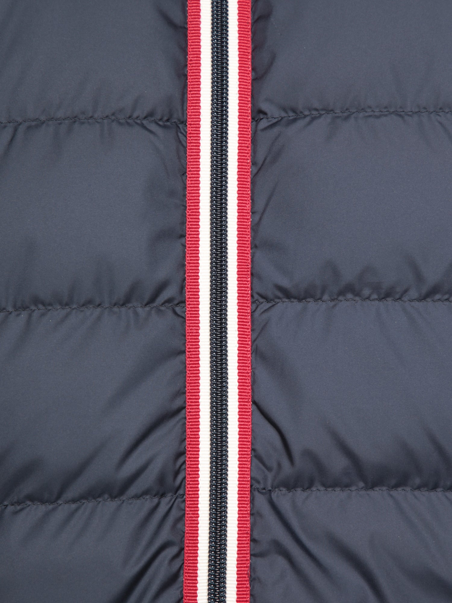 This exclusive Moncler cardigan jacket is crafted with high-quality padding and features a distinctive design with a front zip closure and stylish tricolor stripe.