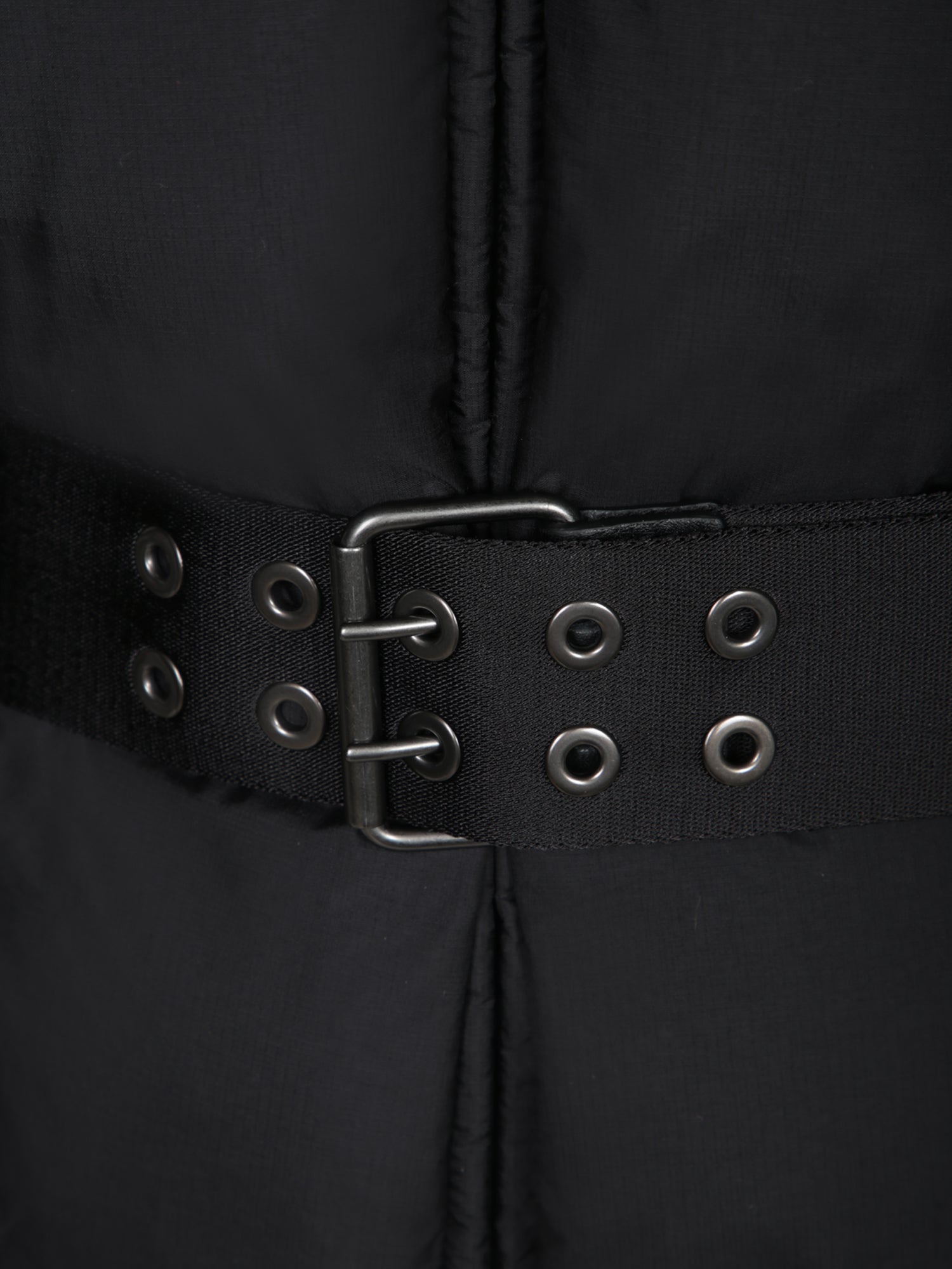 Down jacket with high hood, front zipper closure, and adjustable waist belt. Elastic cuffs and Moncler logo on the arm.