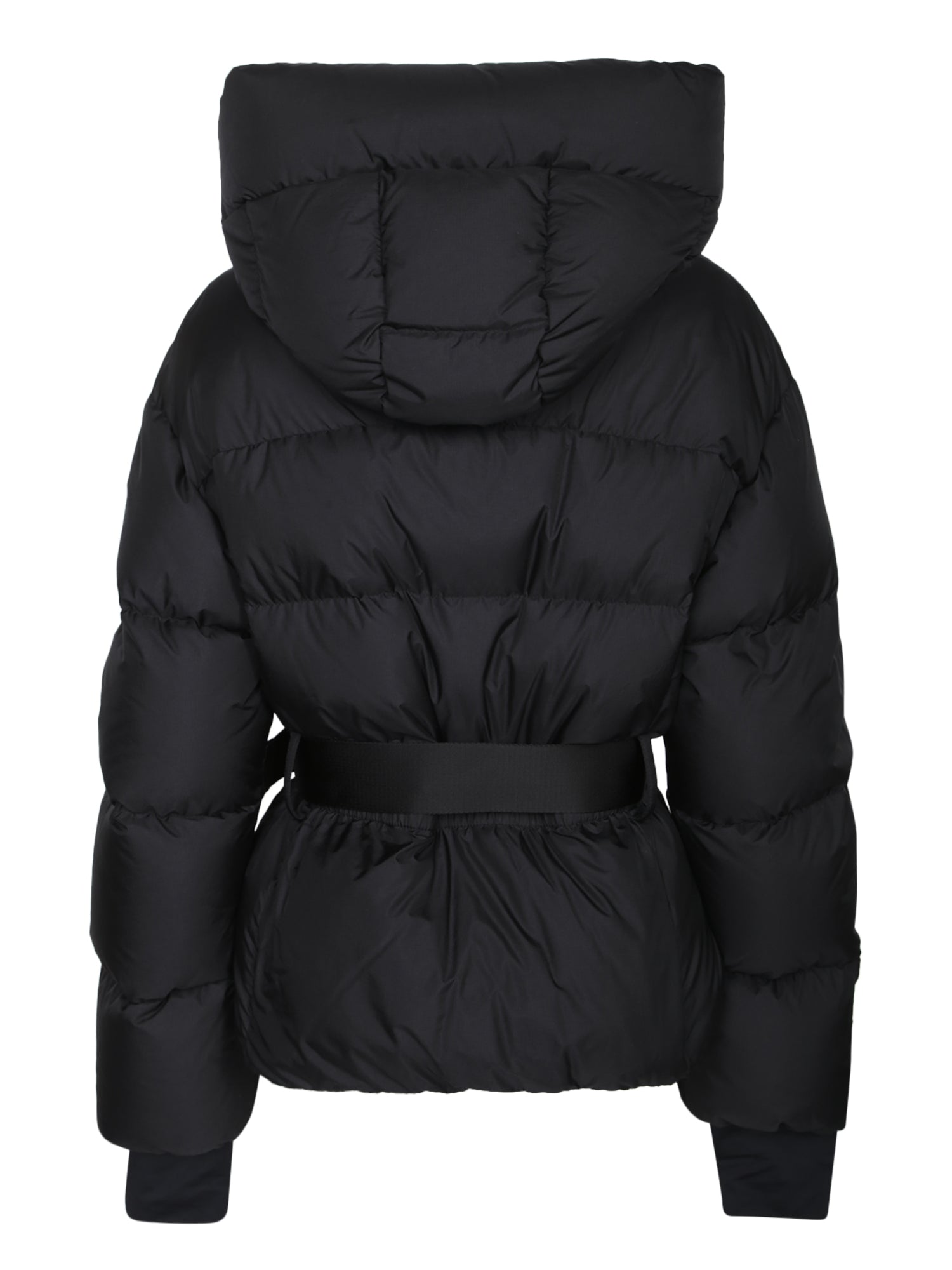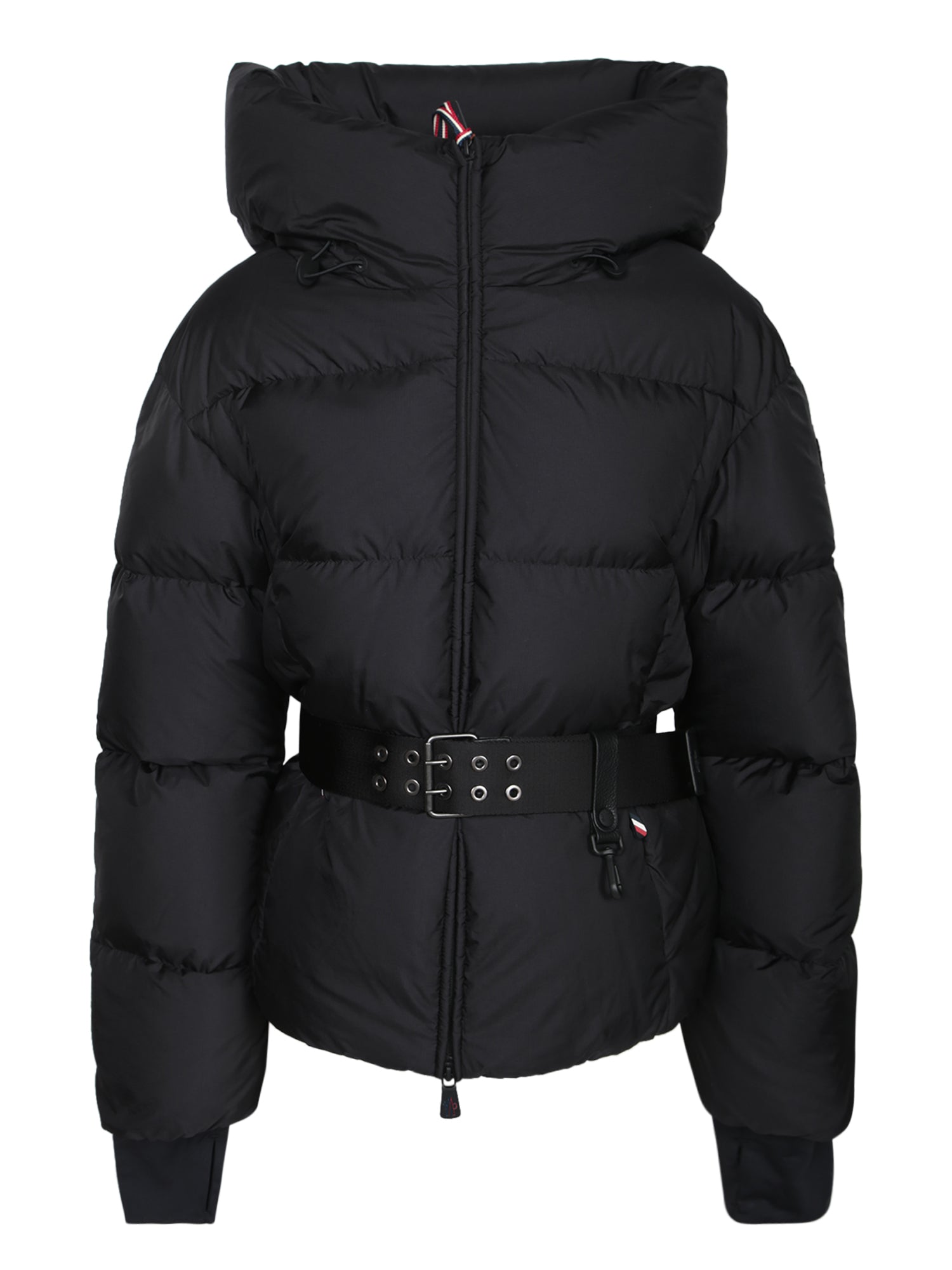 Down jacket with high hood, front zipper closure, and adjustable waist belt. Elastic cuffs and Moncler logo on the arm.