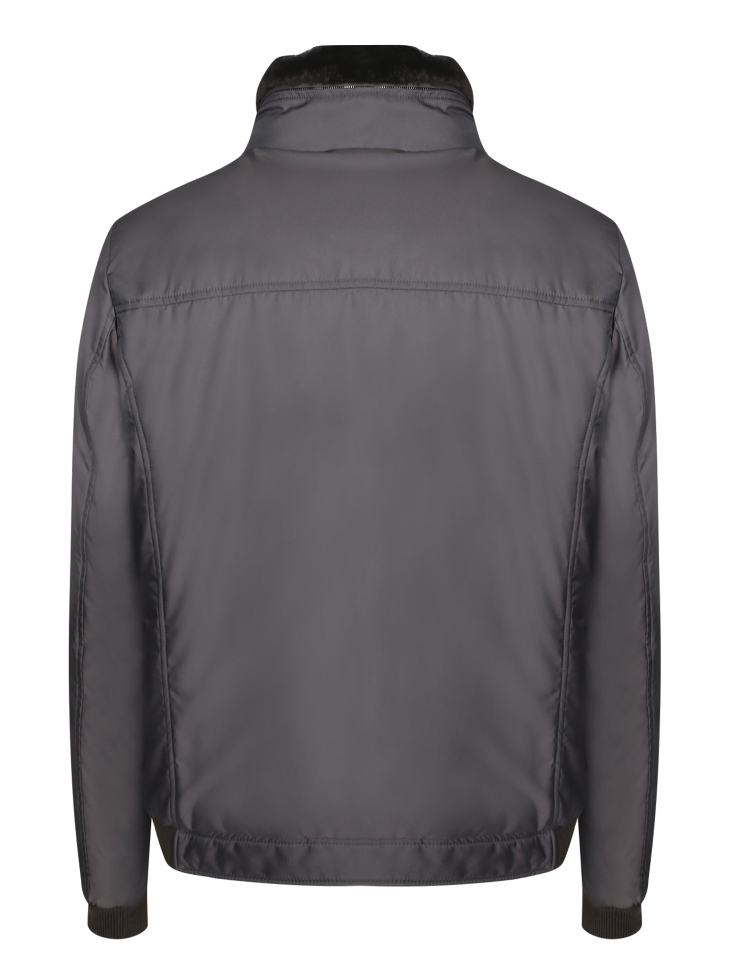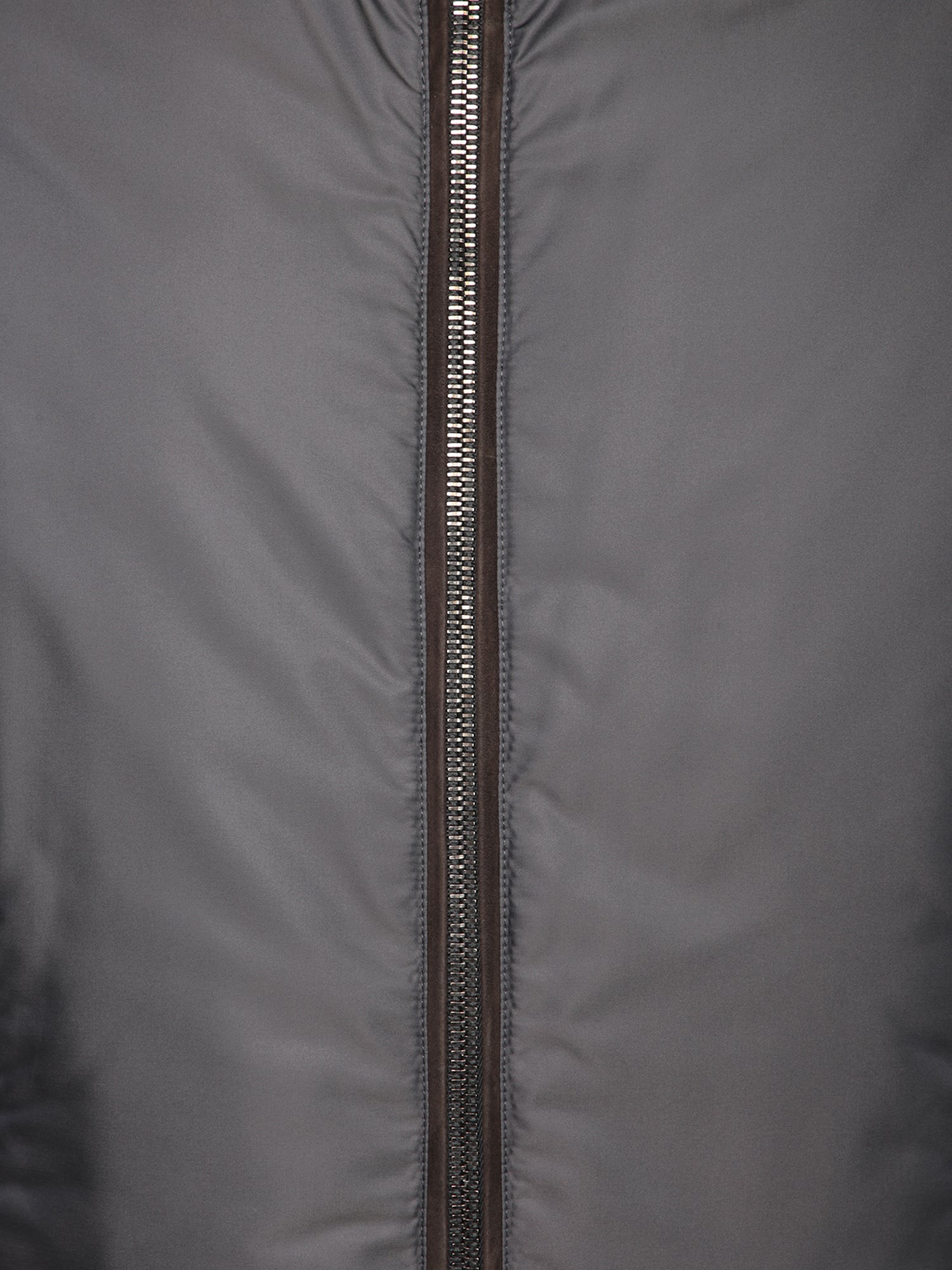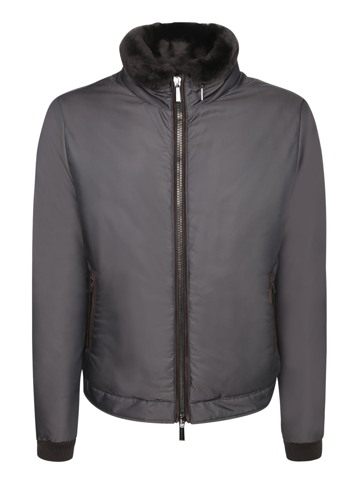 Nylon jacket with shearling lining. Central zip closure, high collar.