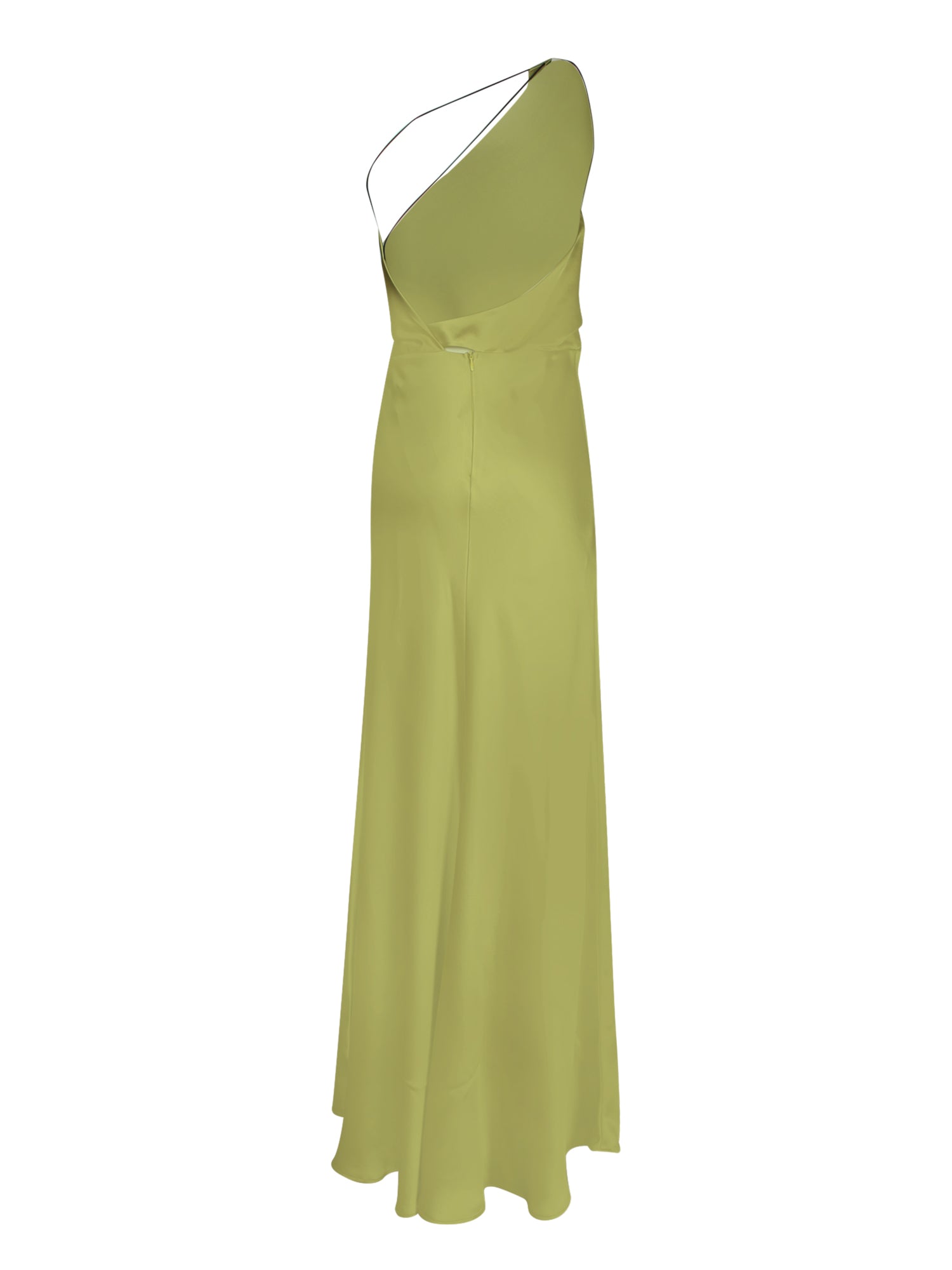 One-shoulder dress with asymmetrical cut. Central knot detail. Shiny satin fabric.