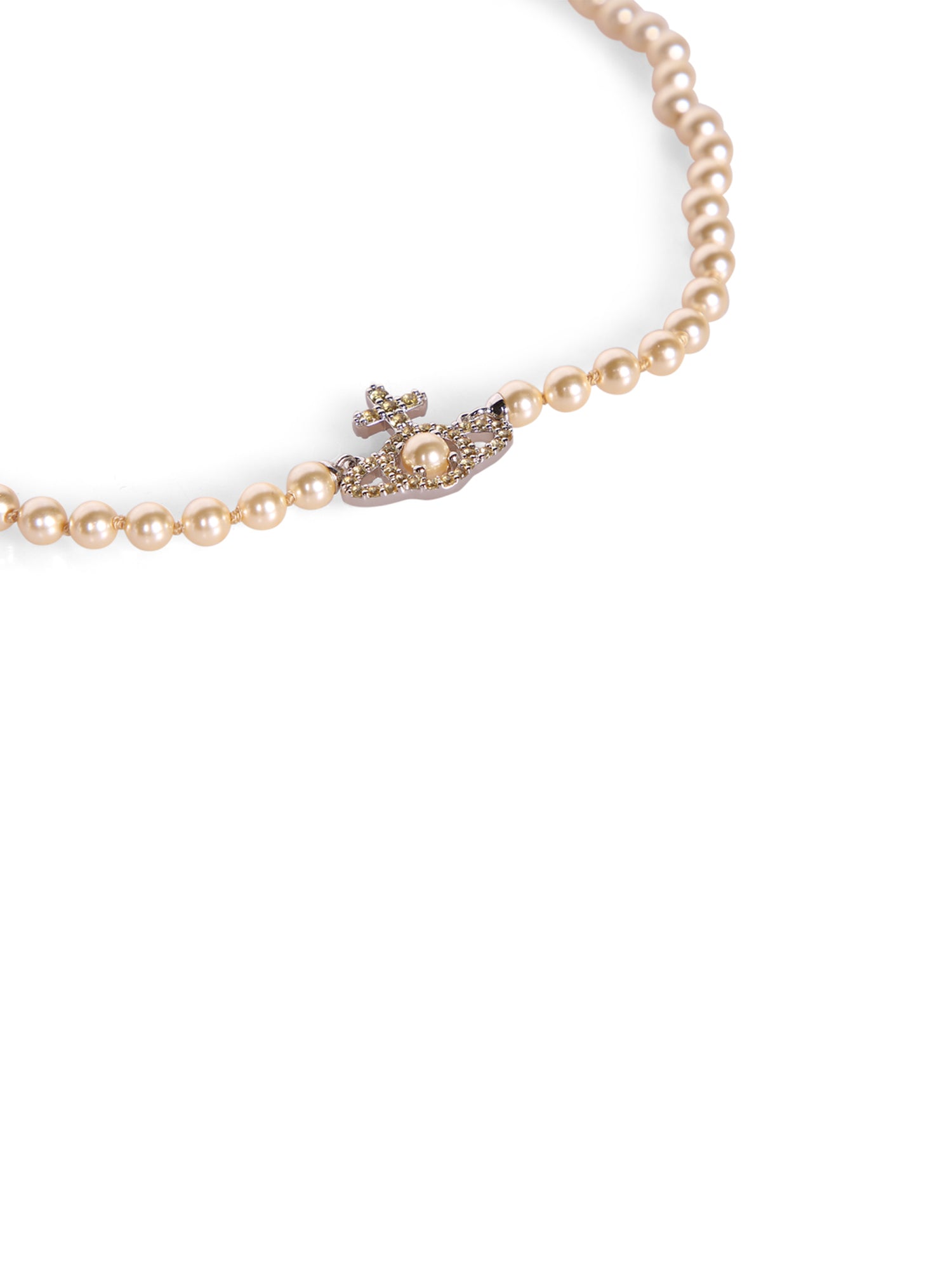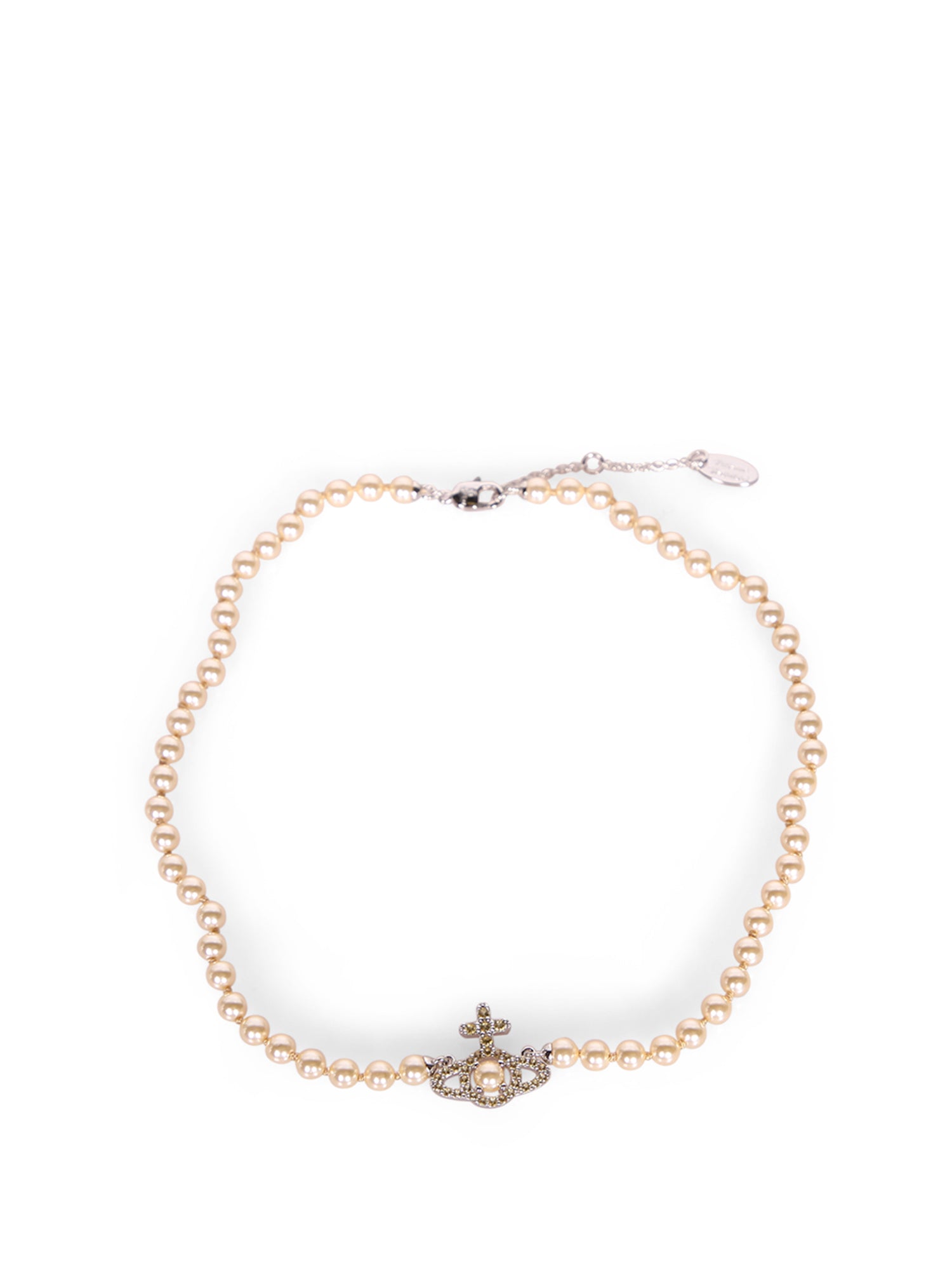 Champagne-colored synthetic pearl necklace. Central crown-shaped pendant encrusted with crystals.