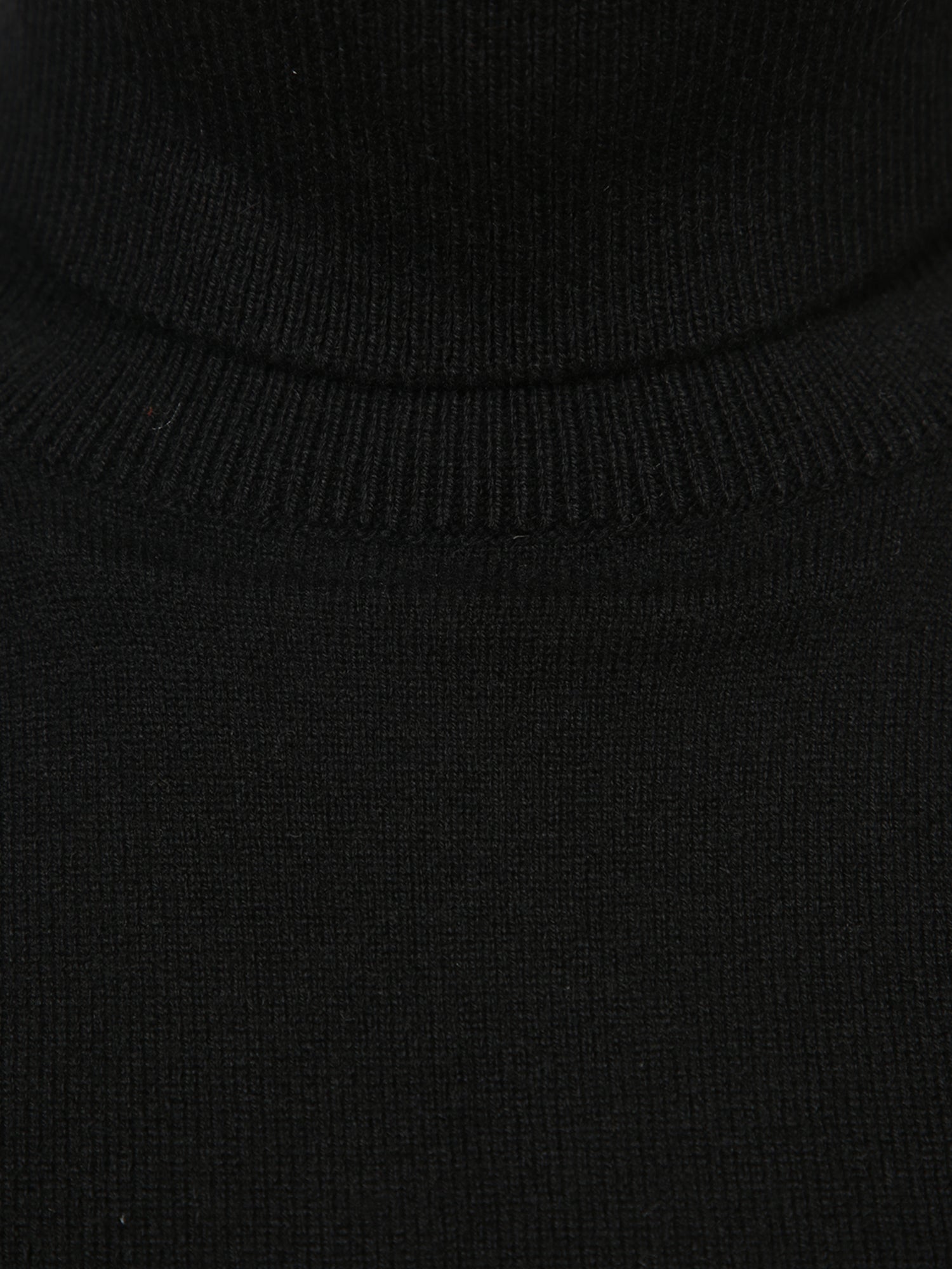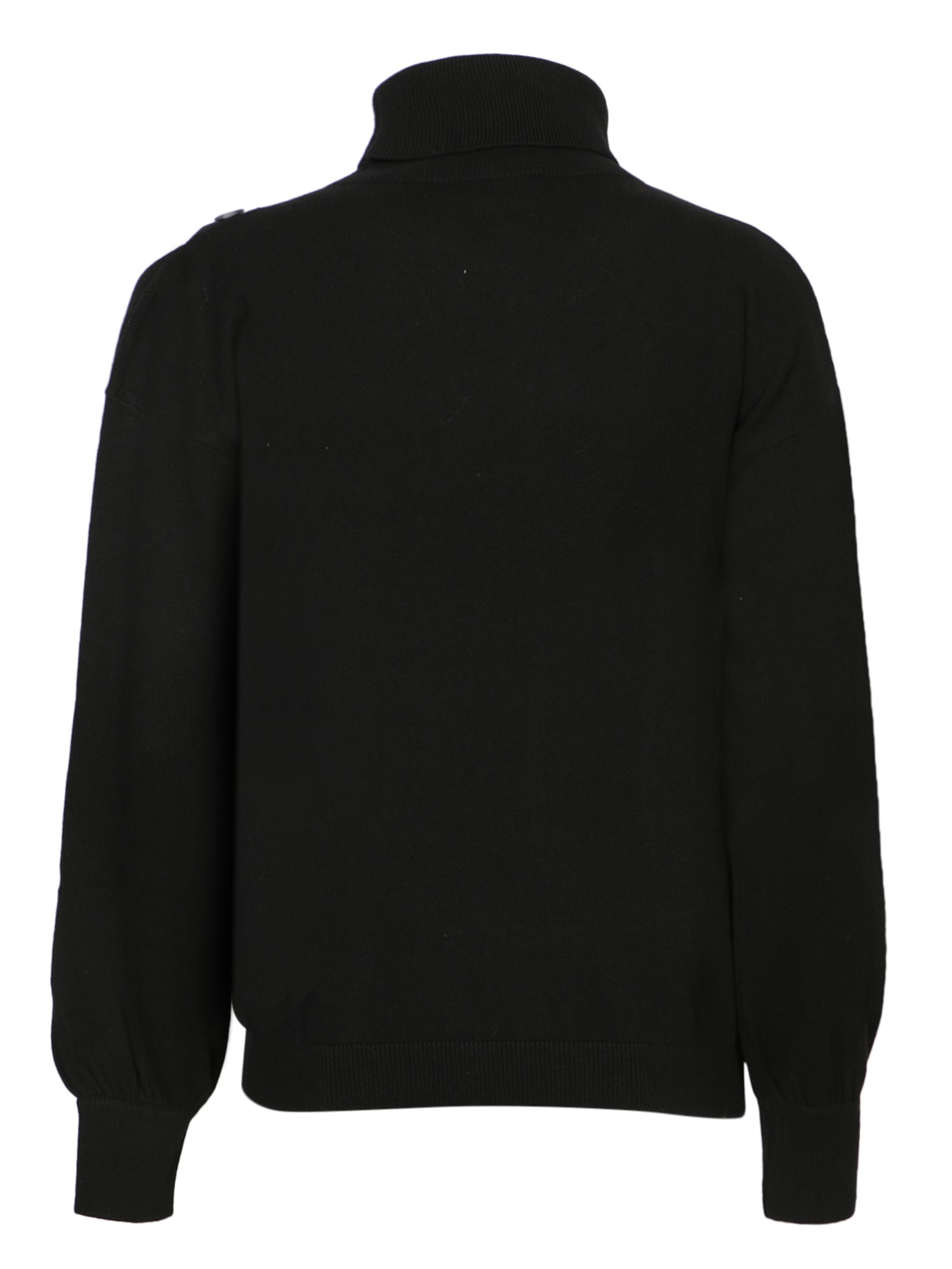 This black sweater from Blanca Vita features a unique open shoulder design highlighted by chic metallic buttons, providing a modern and sophisticated twist to classic knitwear.