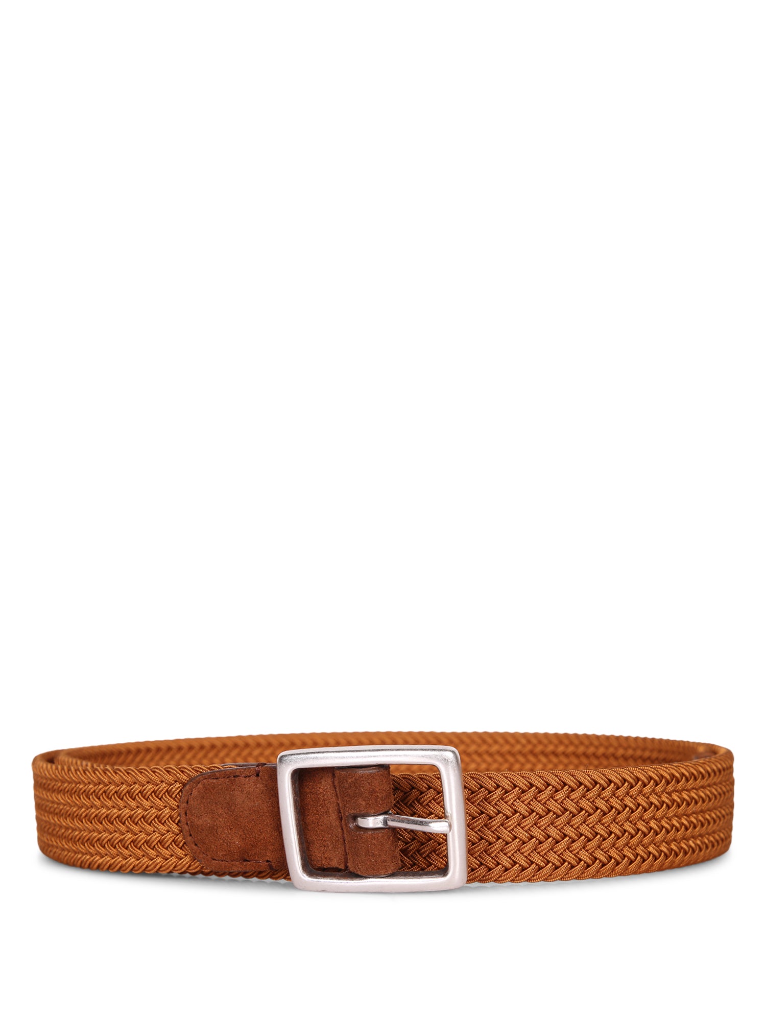 Braided elastic belt with rectangular metal buckle. Brown leather detailing.