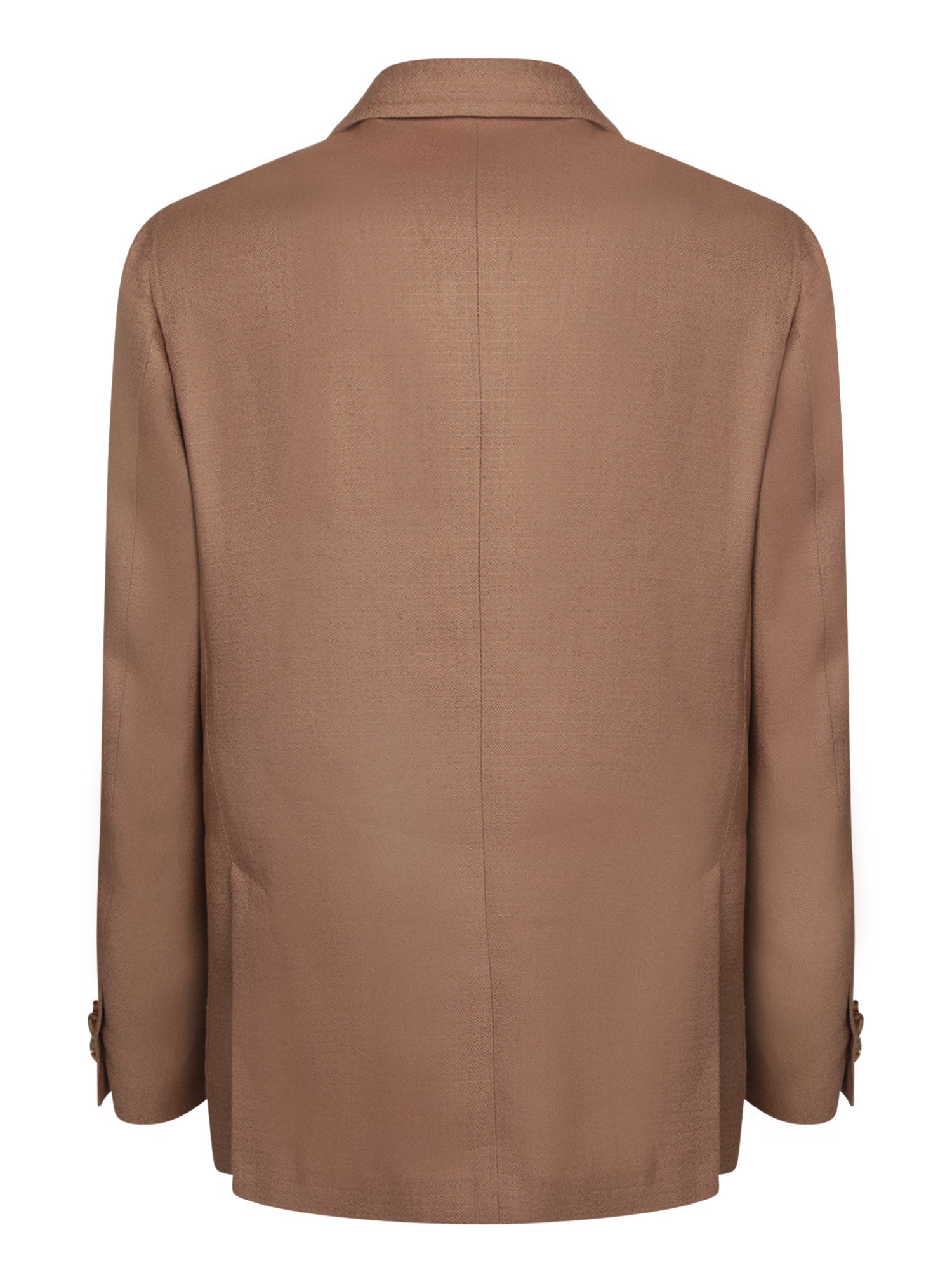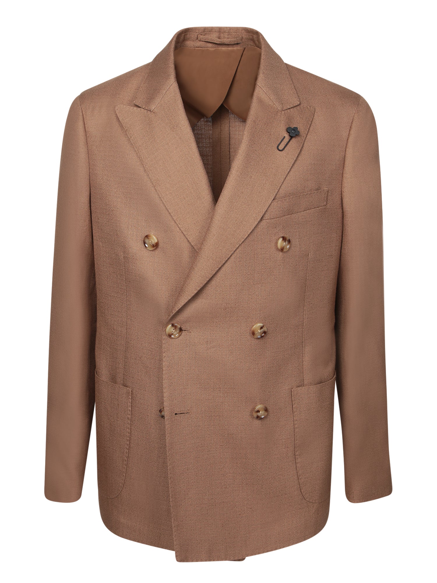 This Lardini double-breasted jacket features refined beige Oxford fabric with elegant details such as golden buttons adding a touch of sophistication. The structured design with flap pockets and a decorative lapel pin further enhances the garment.