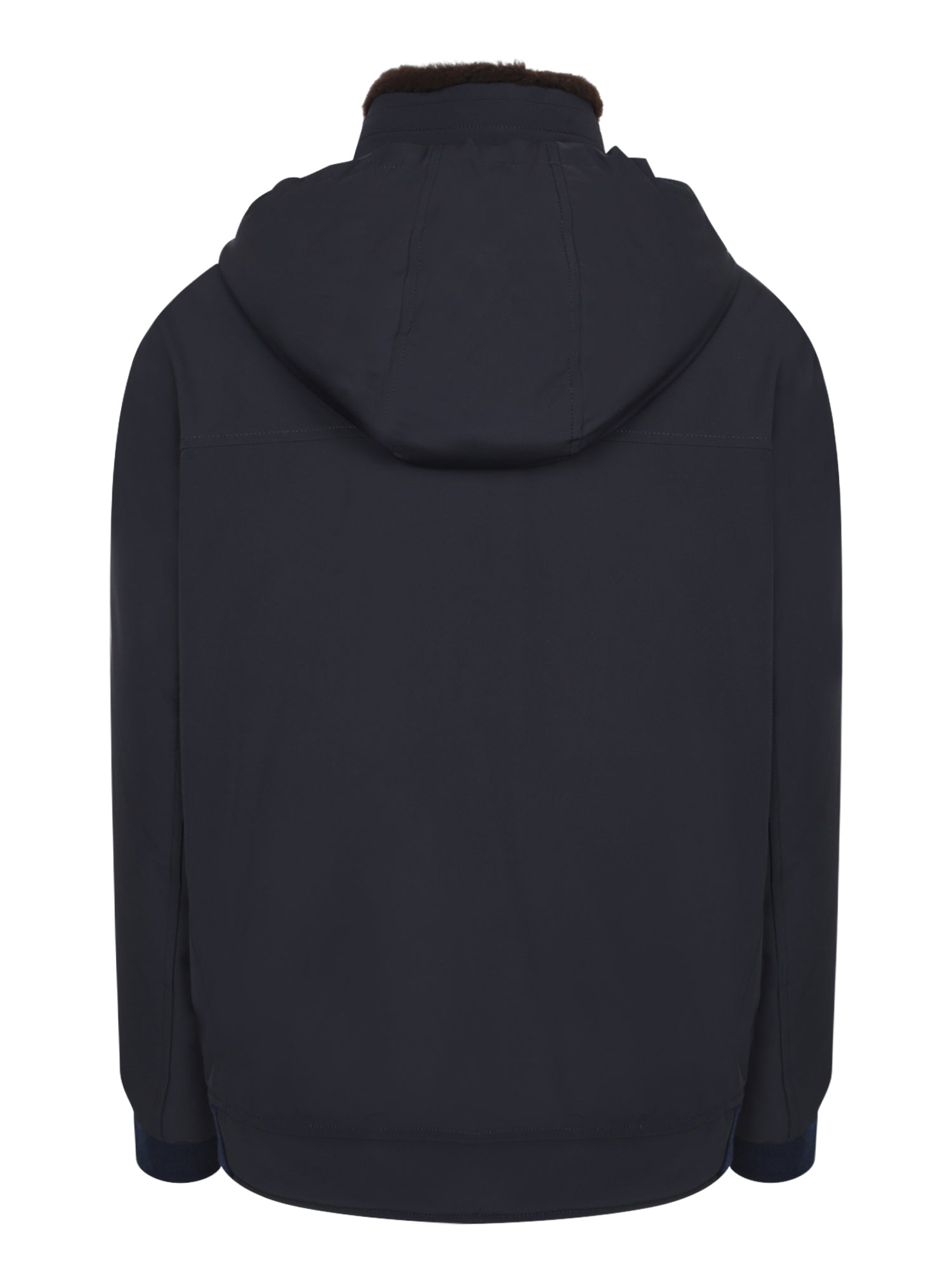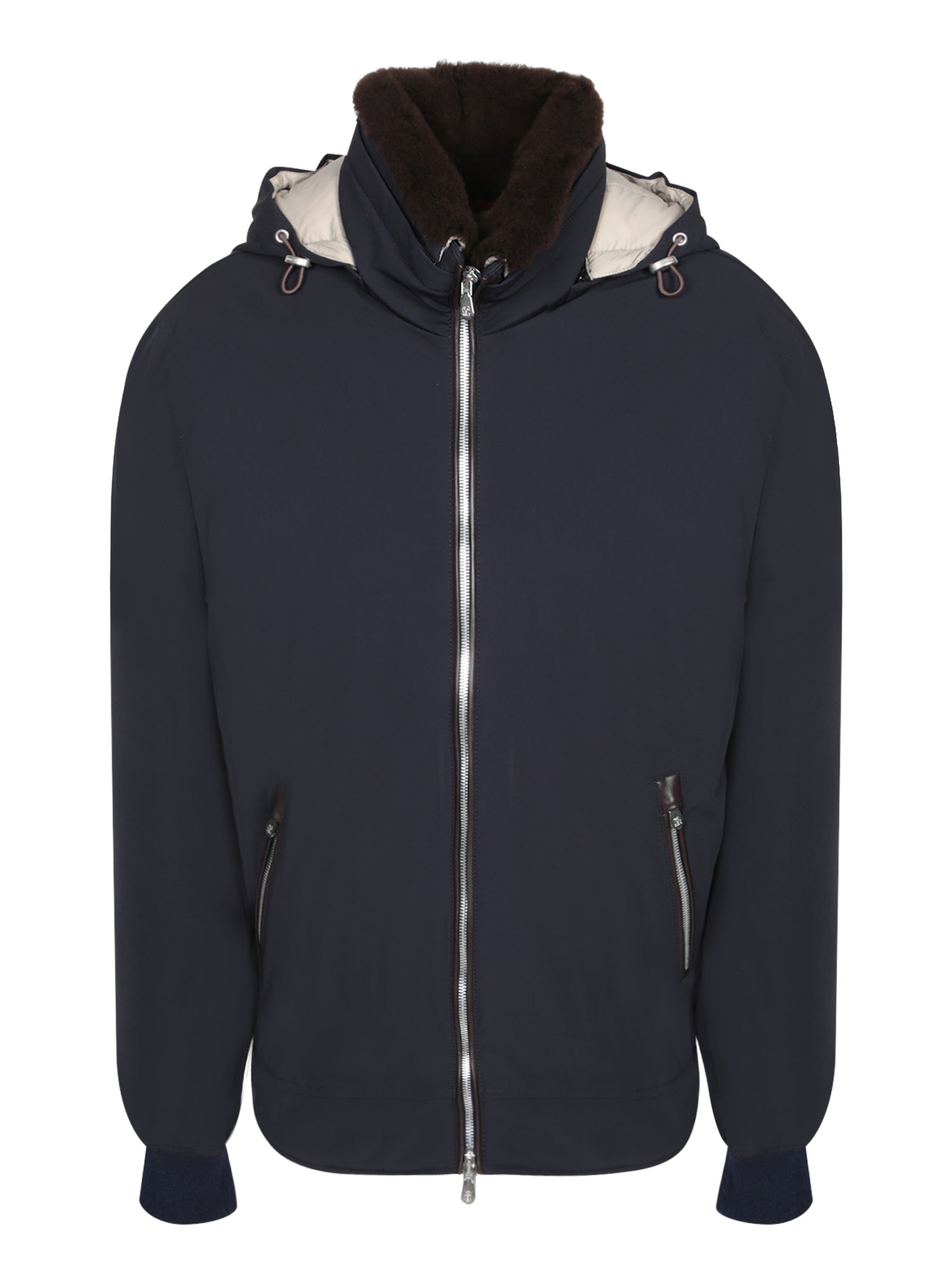 Hood with shearling interior. Silver central zipper closure. Side zipper pockets.