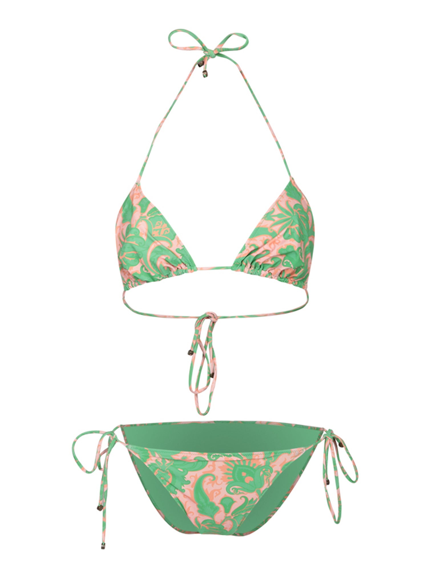 Triangle bikini with neck and back ties. Adjustable side tie briefs. Paisley print.