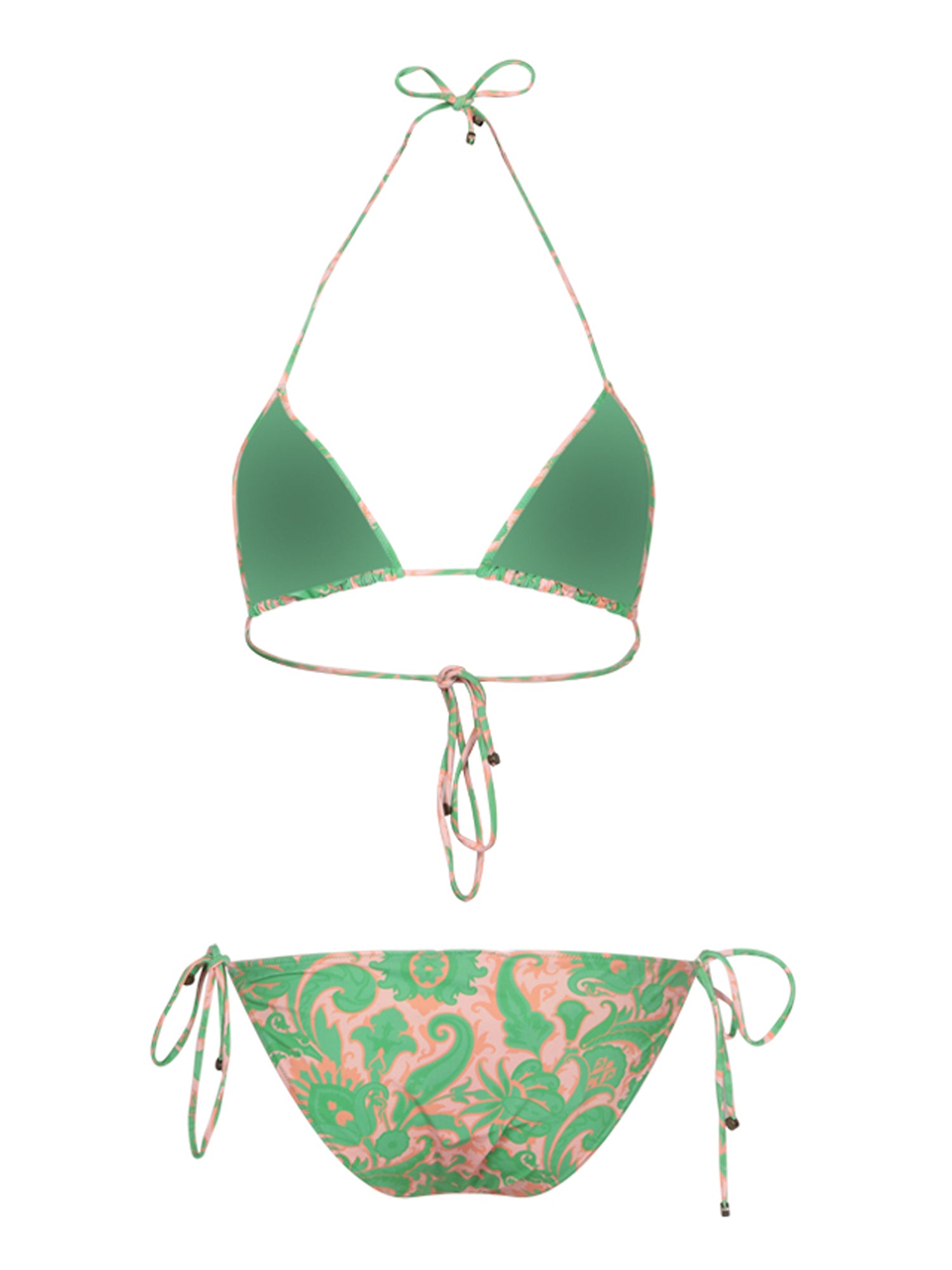 This ETRO bikini, featuring a sophisticated pink and green paisley print, is perfect for enhancing elegance at the beach or poolside. Completed by practical adjustable ties, it offers a comfortable fit to the body.