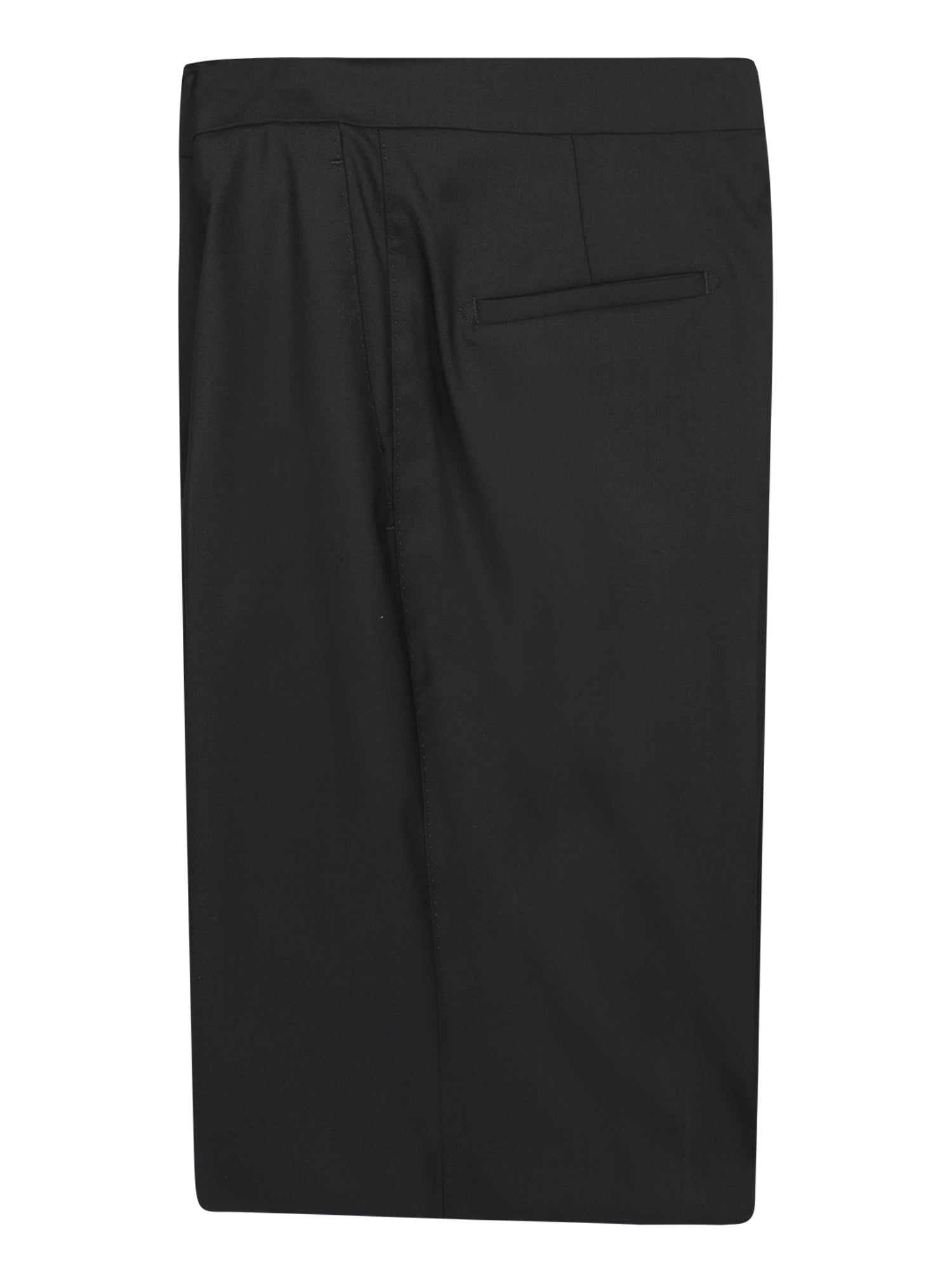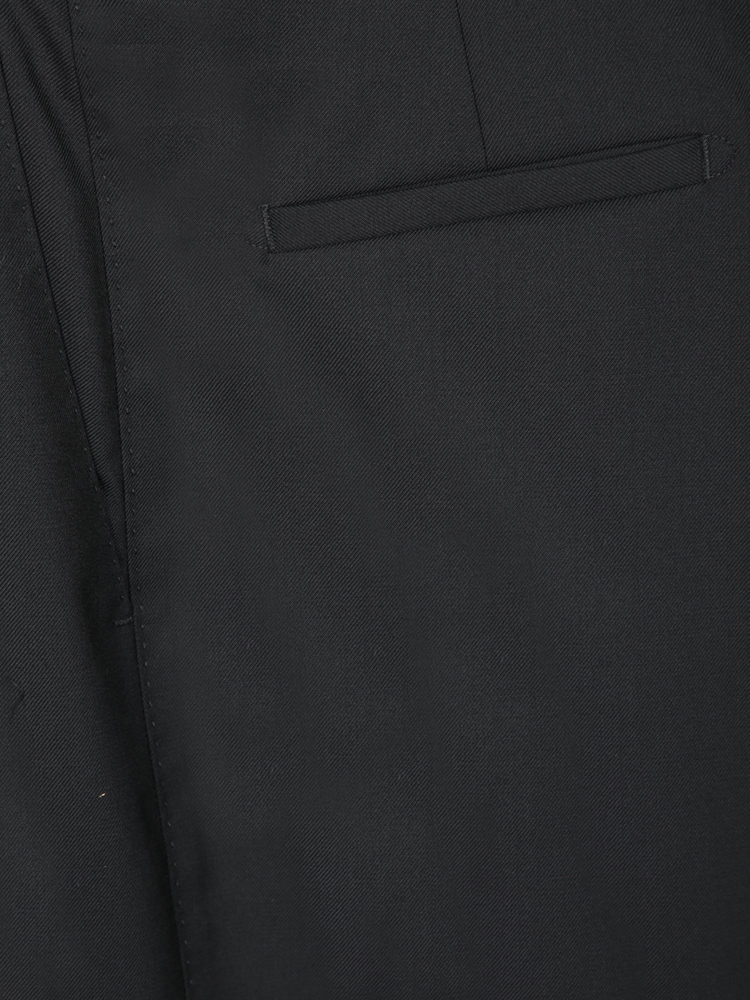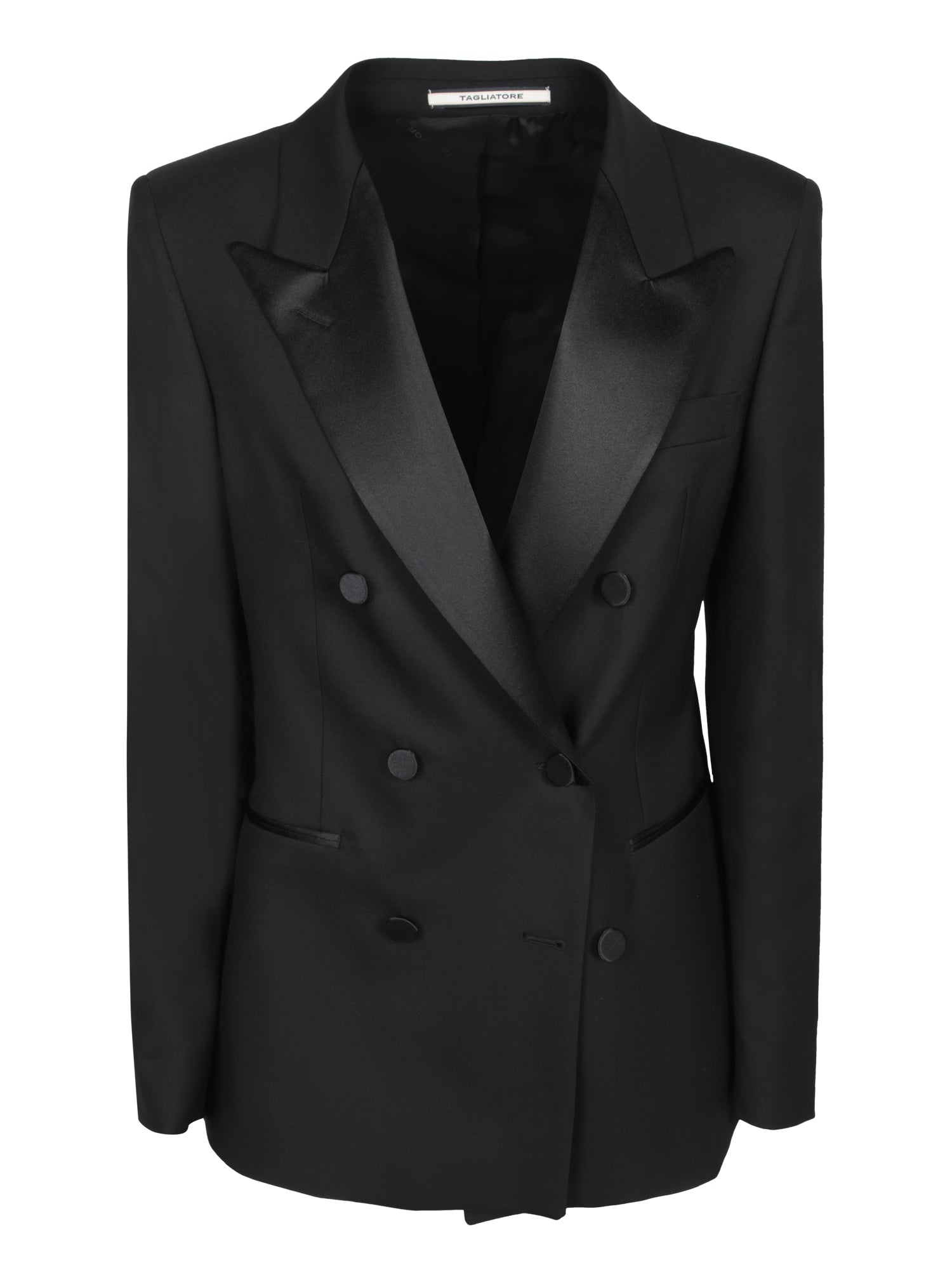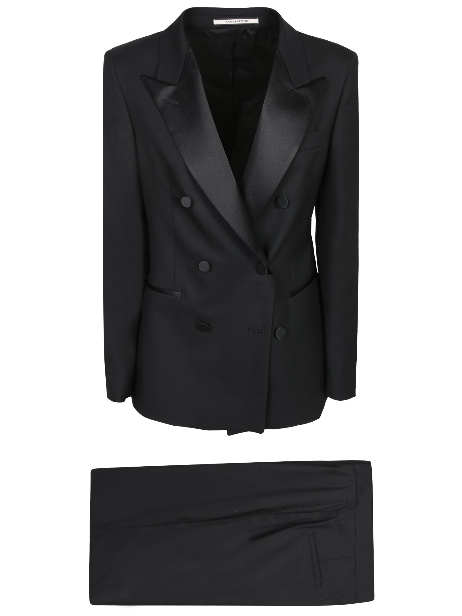 Double-breasted black satin tuxedo with peak lapels. Flap pockets and button closure.