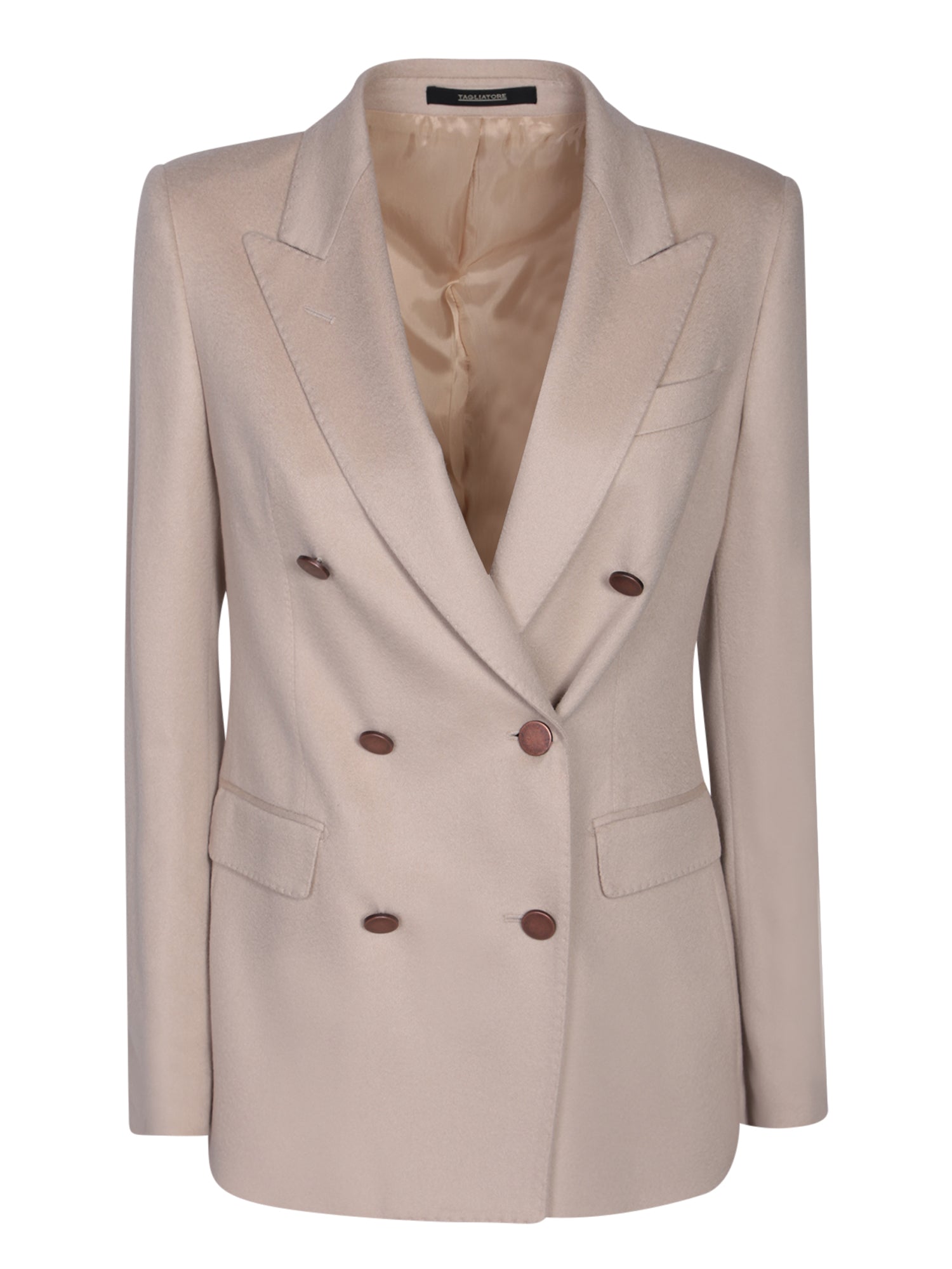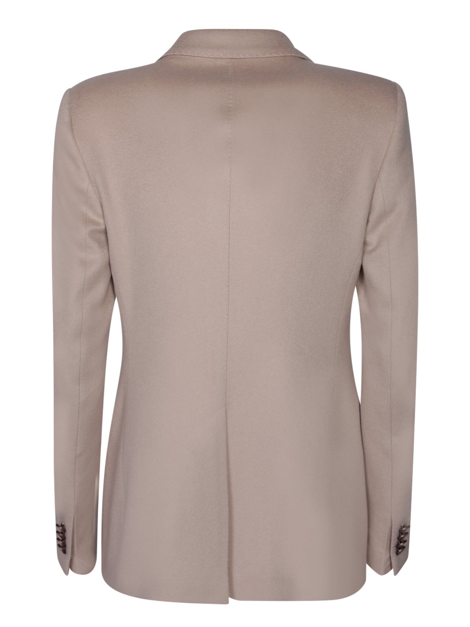 Elegant ivory cashmere Parigi jacket featuring a double-breasted design with dark-toned buttons, peak lapels, and a tailored structure.