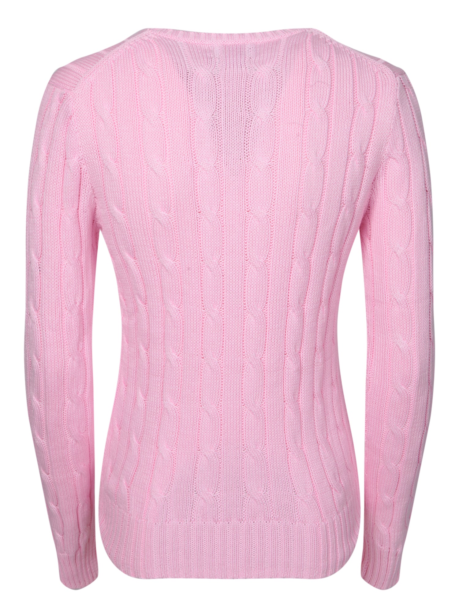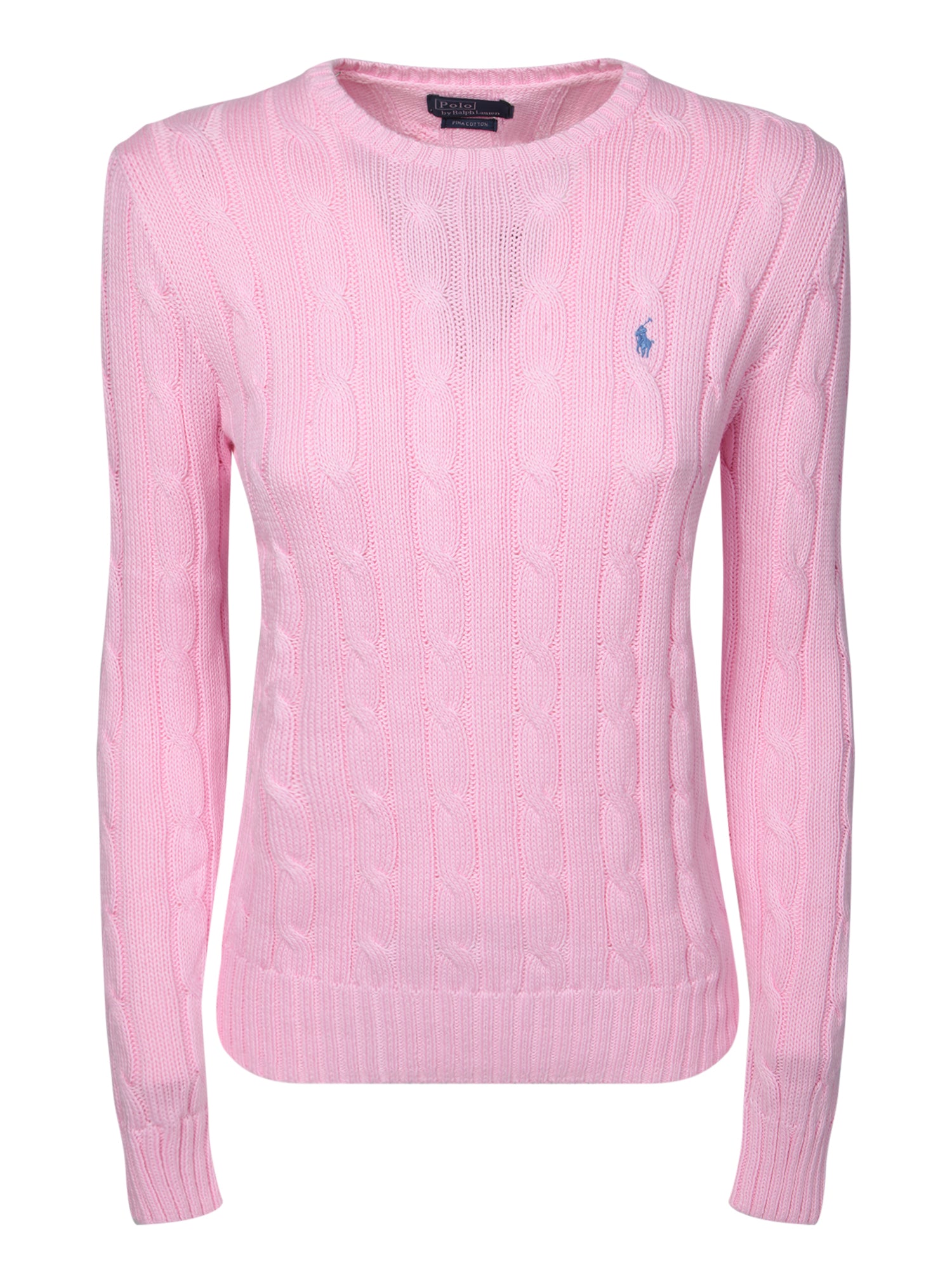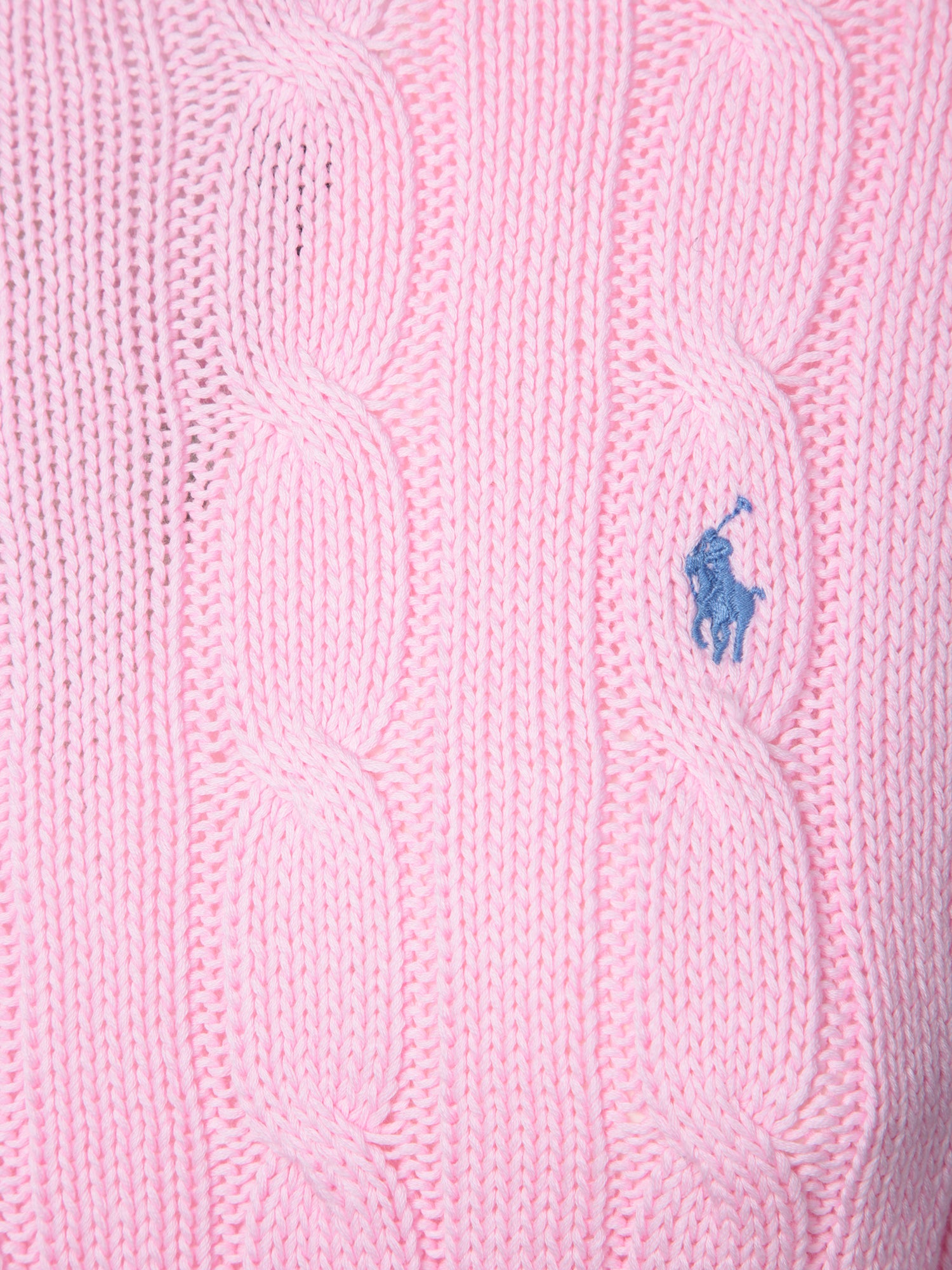 This elegant Polo Ralph Lauren sweater is crafted in fine pink cable knit fabric, enhanced with a delicate blue embroidered logo. Perfect for a sophisticated look in casual settings.