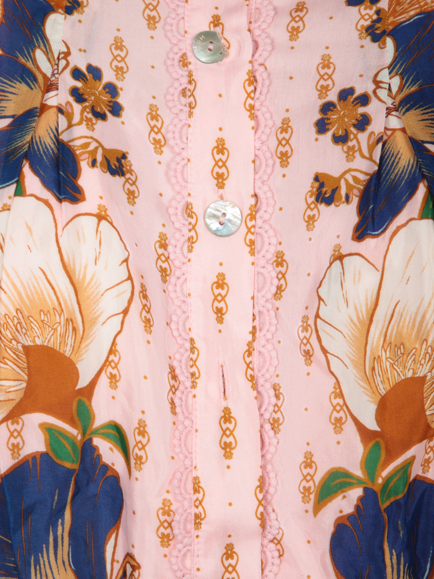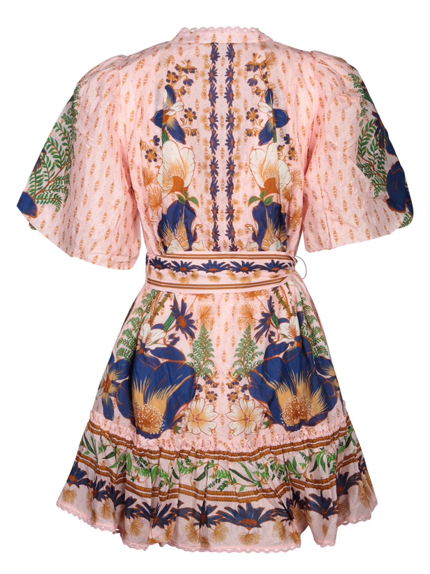 This charming Farm Rio dress features a bold floral pattern on pink fabric, highlighted by a jewel belt that enhances the silhouette. Completed with delicate ruffles at the hem, it’s perfect for special summer occasions.