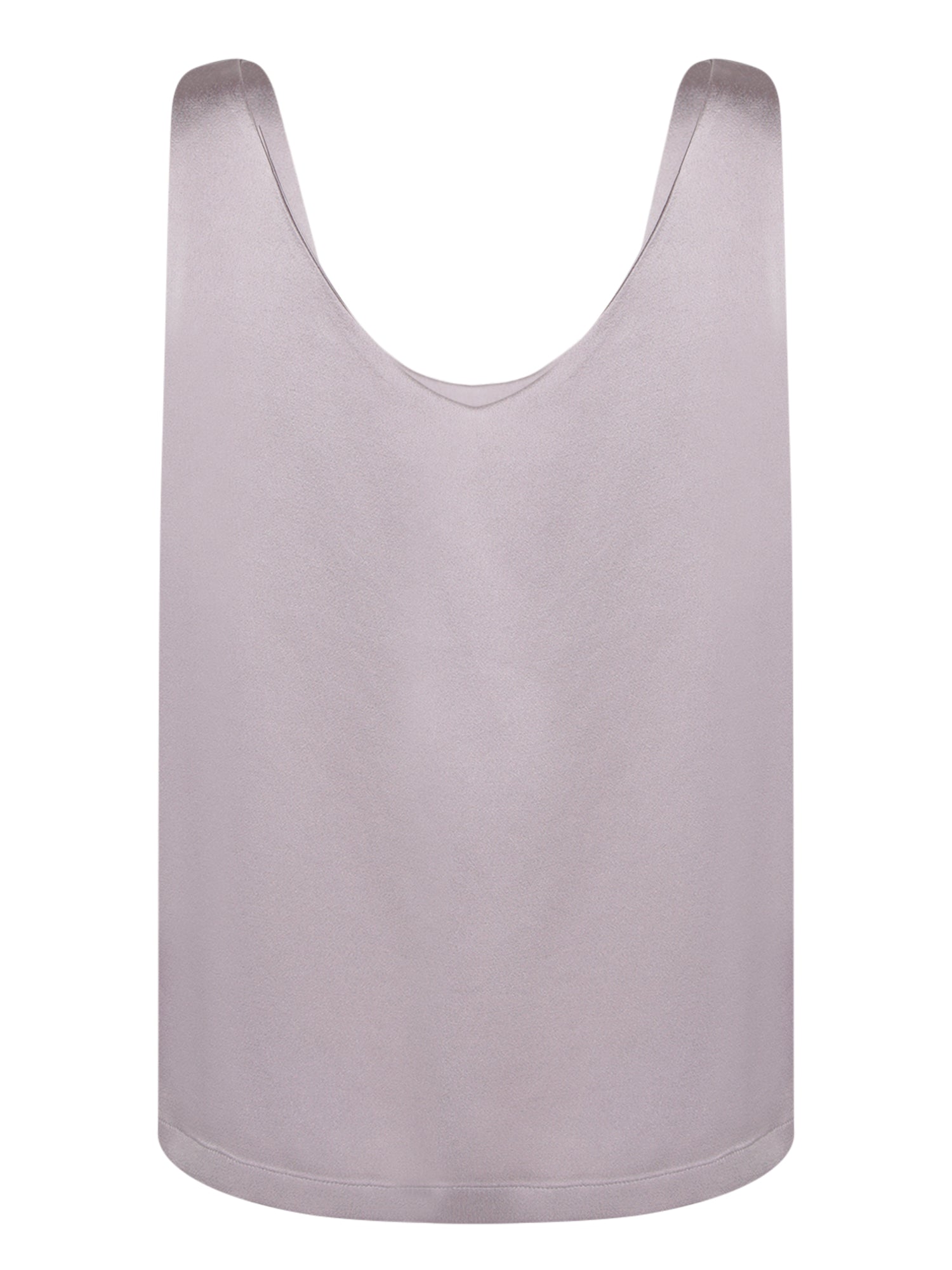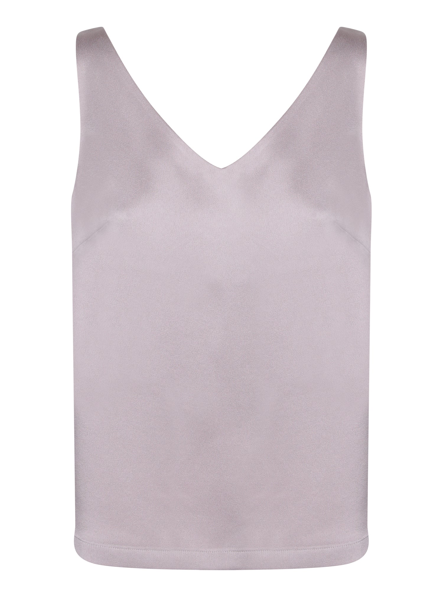 Sleeveless top. Satin silk fabric. Deep V-neckline.