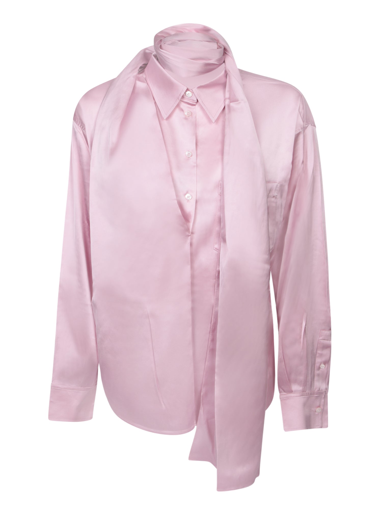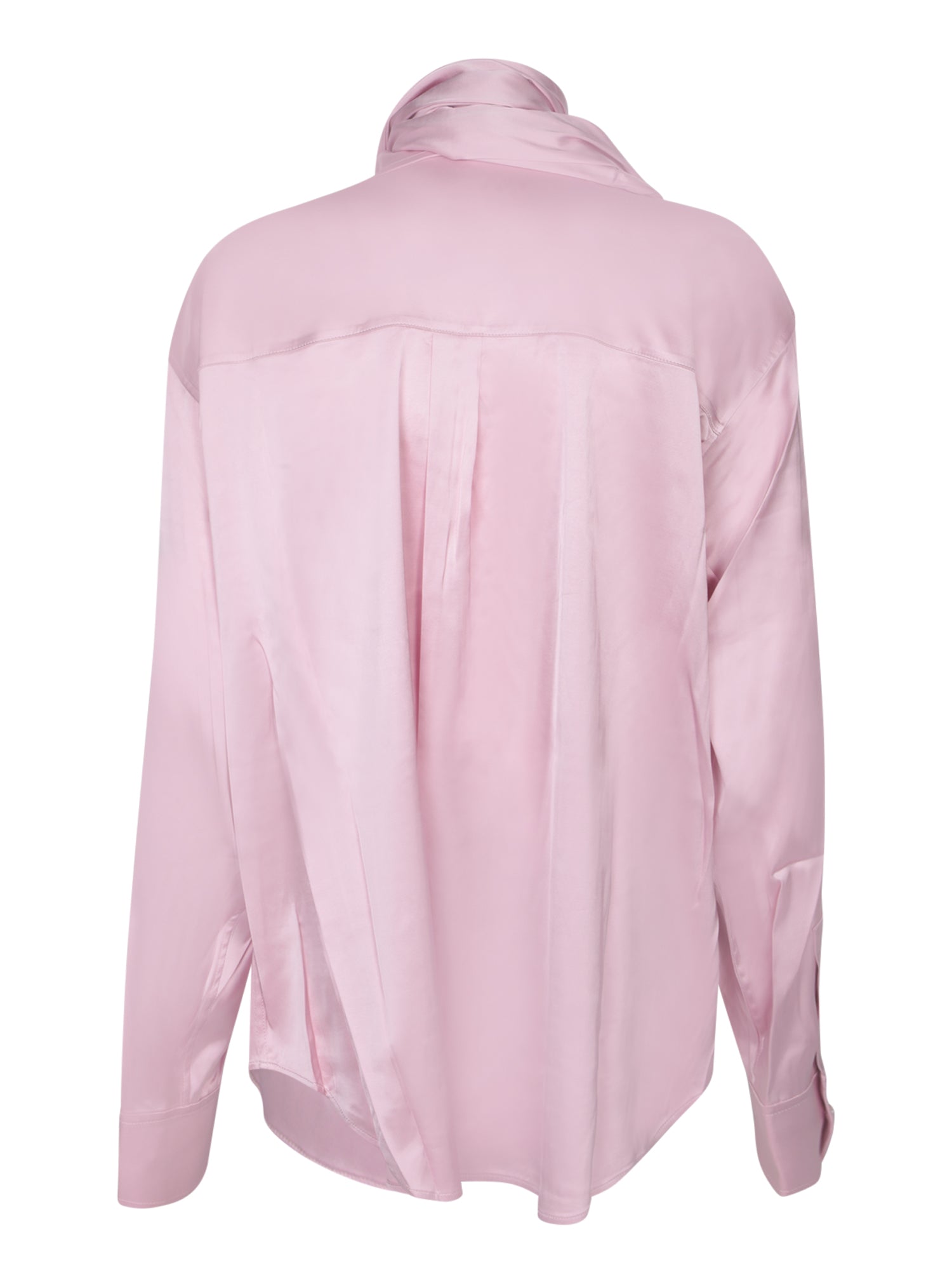 Pink blouse with long sleeves, classic collar, and front button closure.