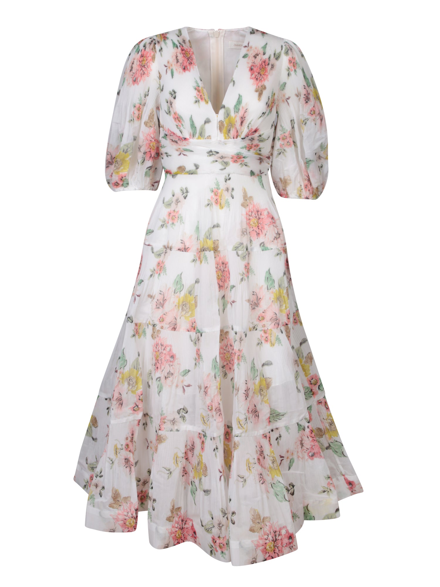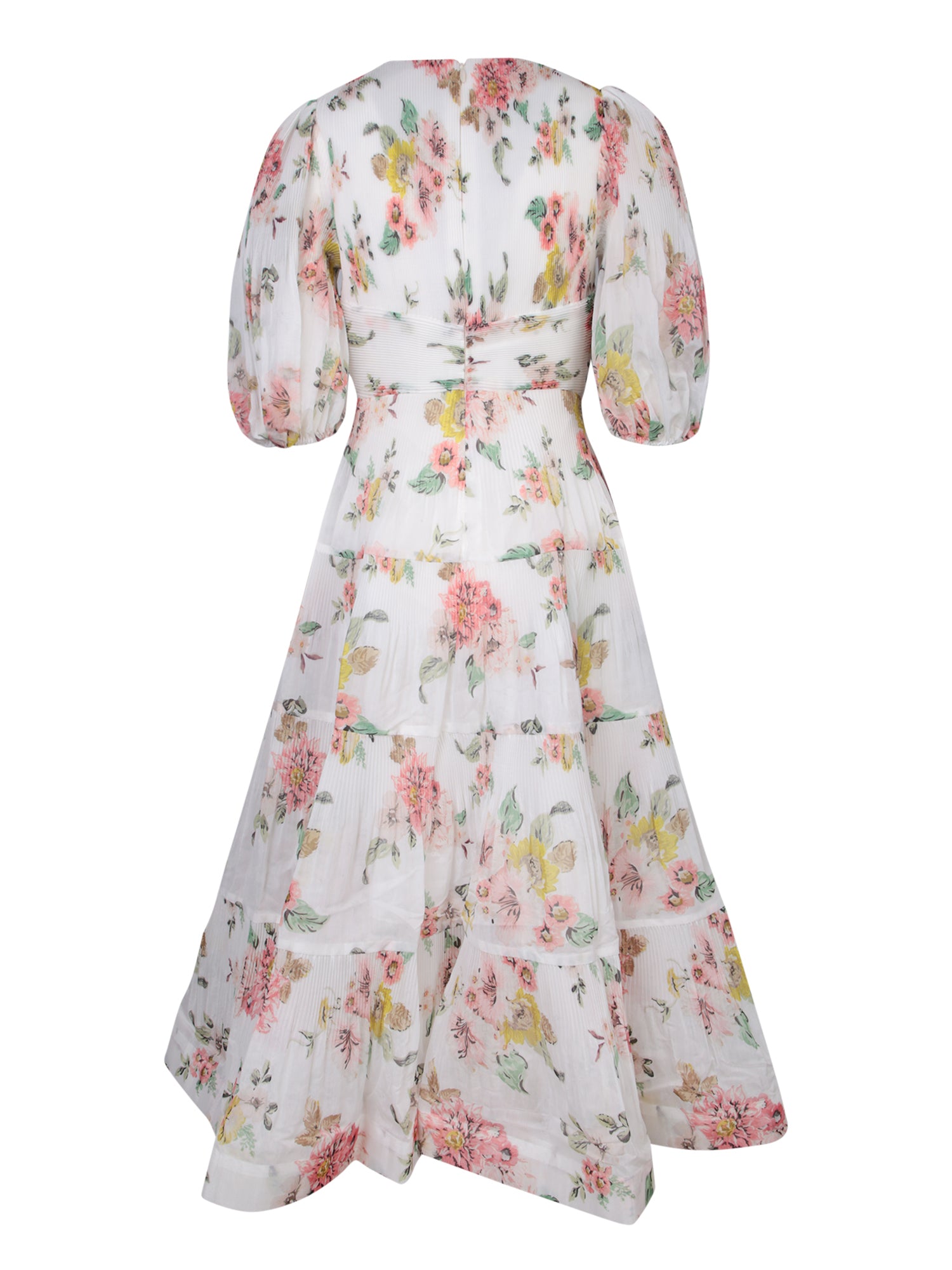 Floral midi dress with three-quarter sleeves, V-neckline, and accentuated waist. Made from a lightweight, sheer fabric with pleated detailing.