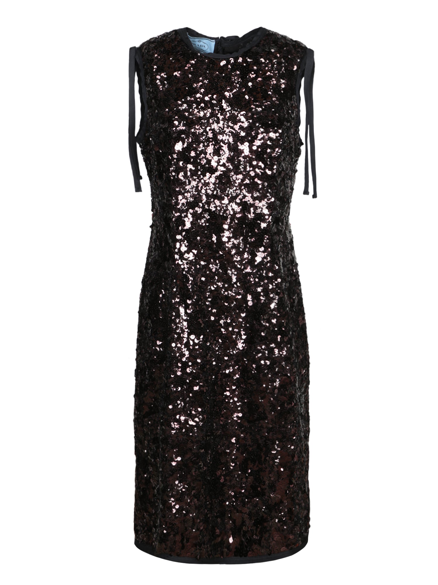 This exclusive Prada dress epitomizes modern luxury and elegance, embellished with sparkling plum sequins for a stunning finish, perfect for prestigious evening events.
