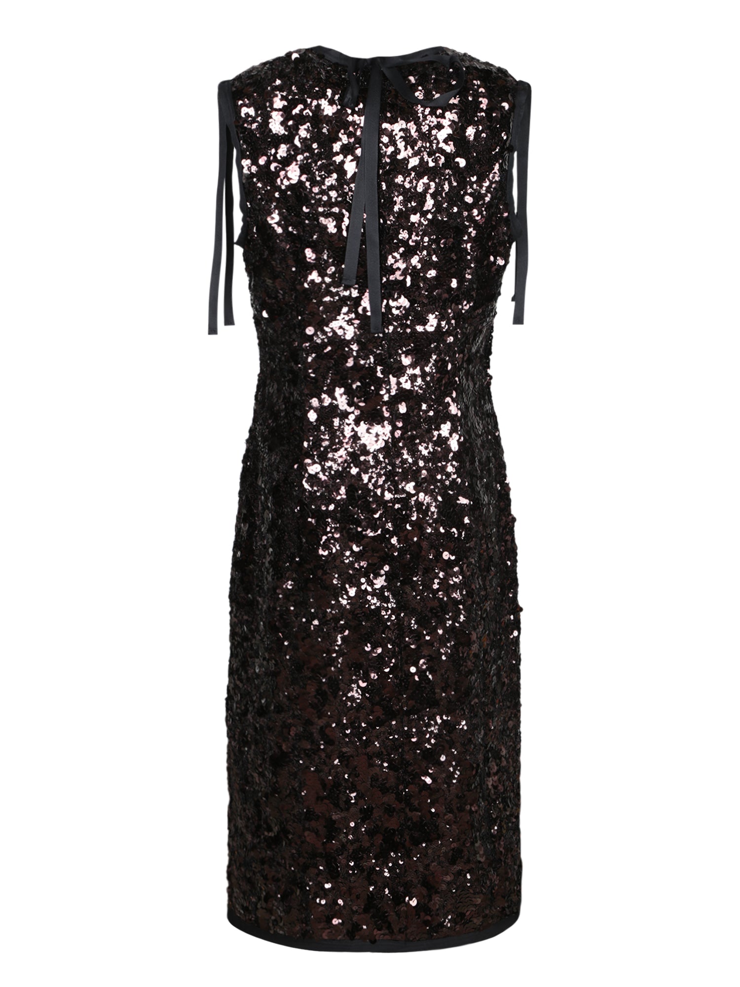 Sleeveless midi dress. Made with plum-colored sequins. Side tie closure.