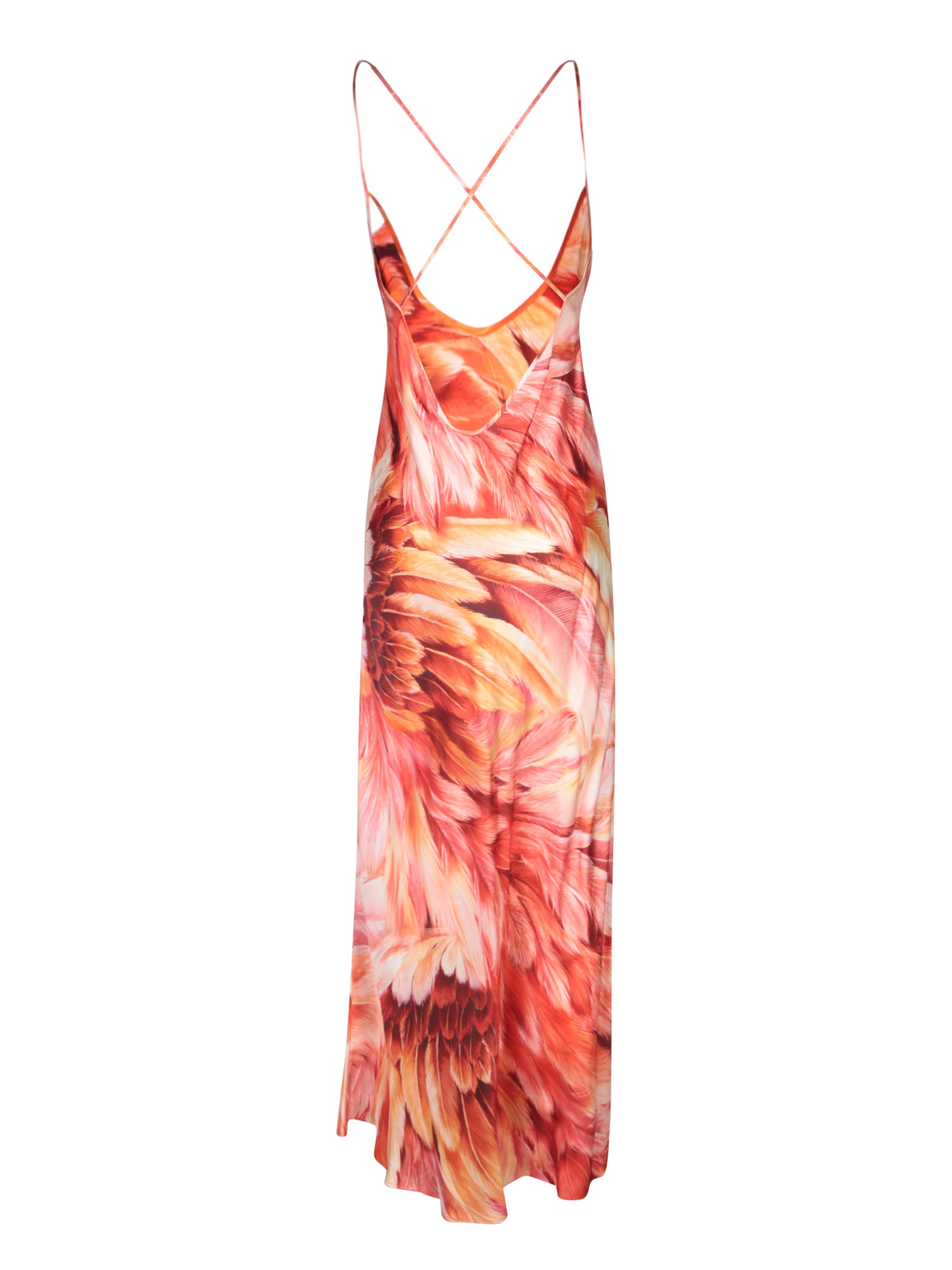 Spaghetti straps. Cross back straps. Open back. Tonal stitching.