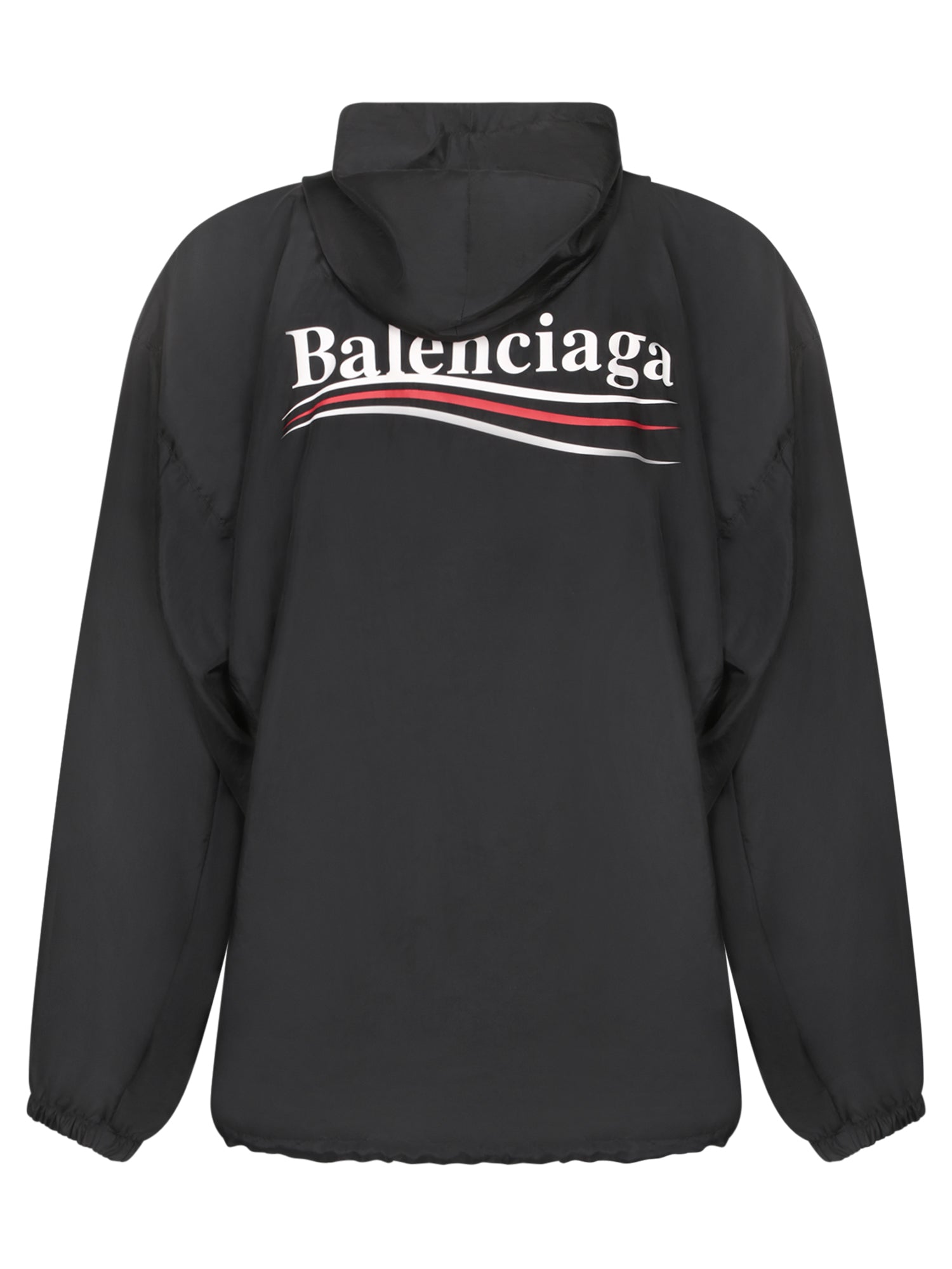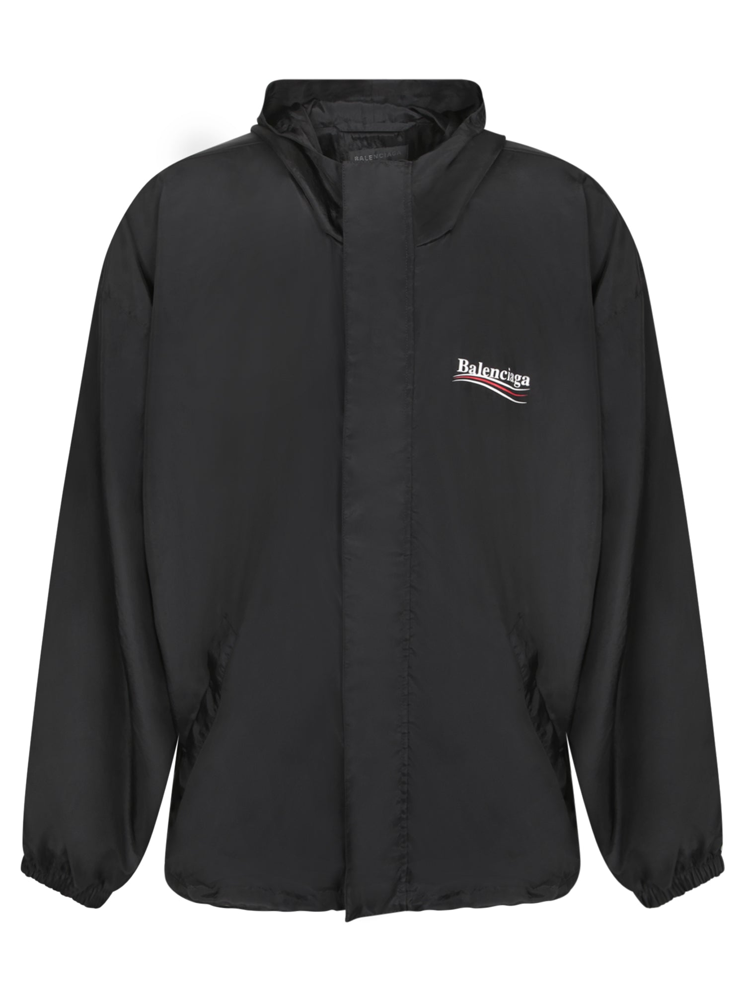 Waterproof jacket with hood. Contrasting Balenciaga logo printed on the chest. Front zip closure.