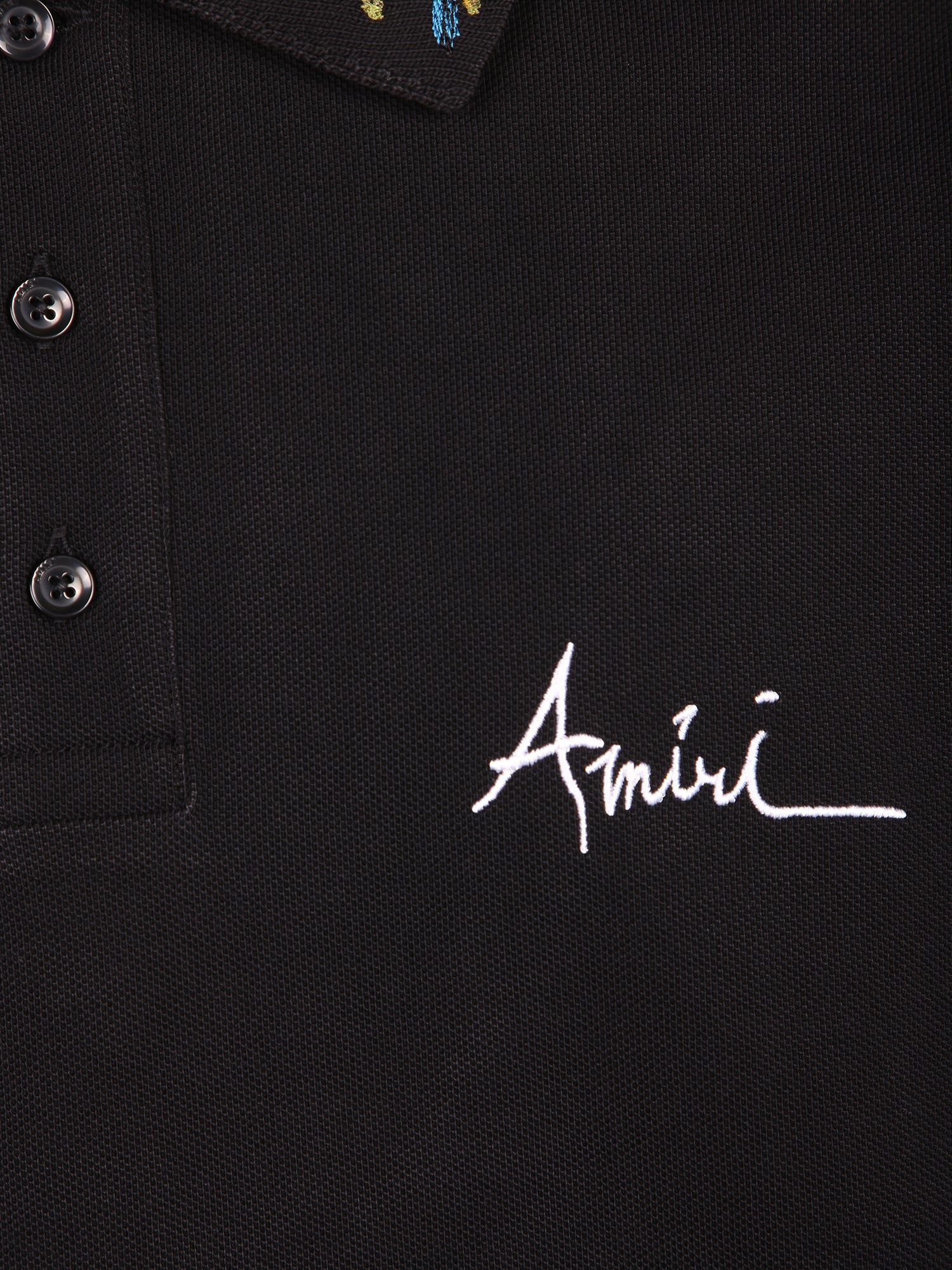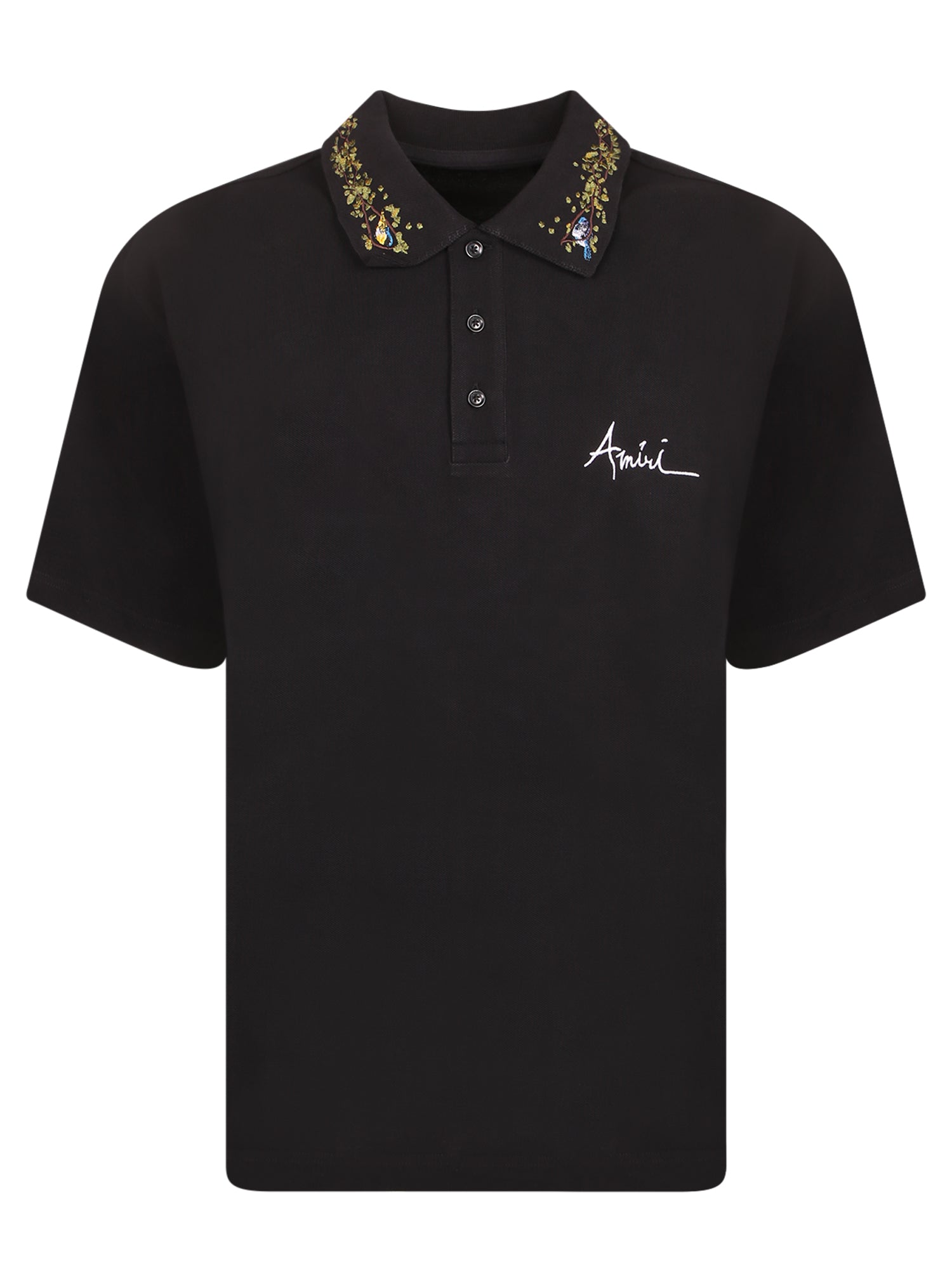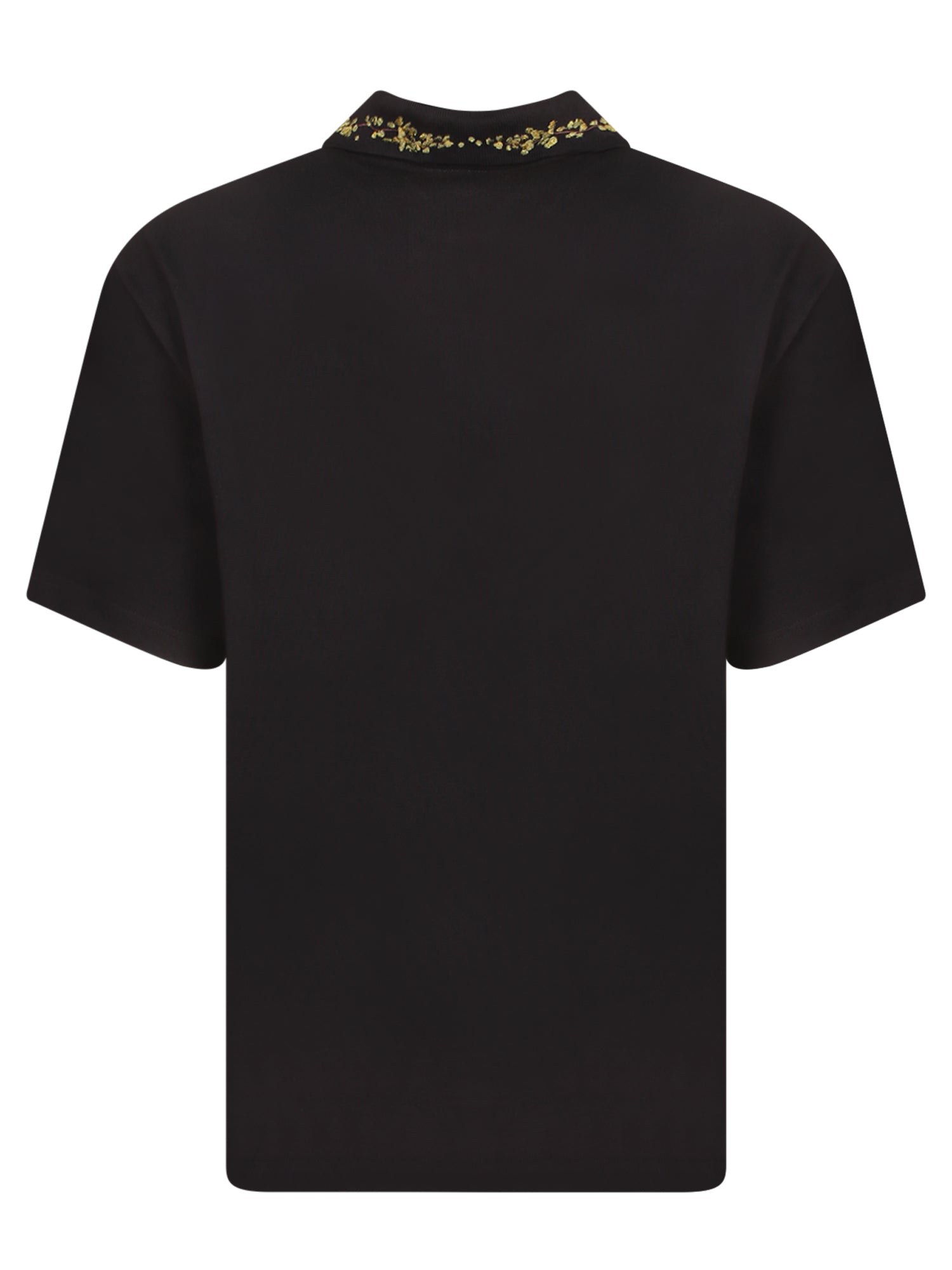 Black cotton polo. Embroidered floral collar. Button closure. Embroidered logo.