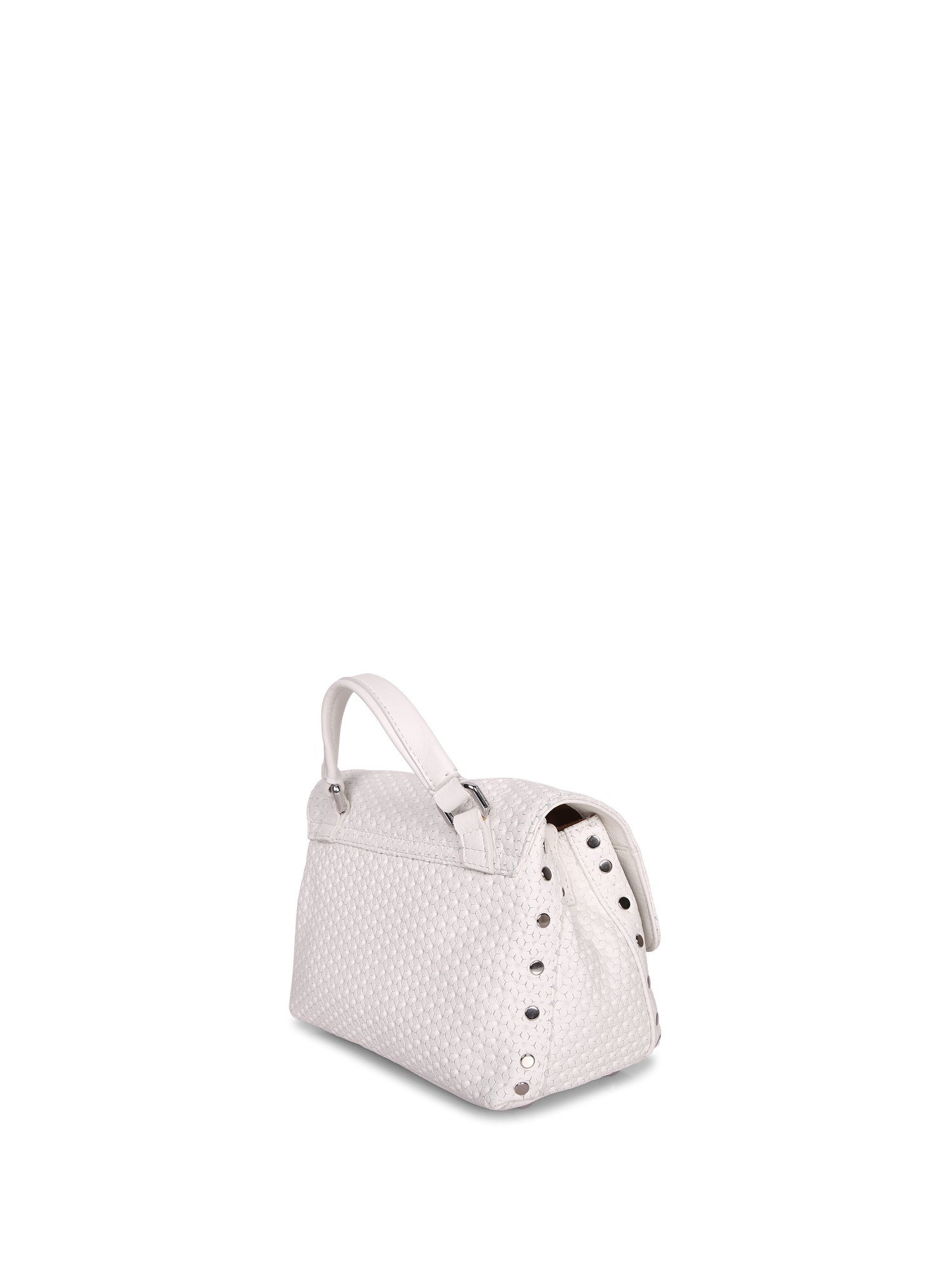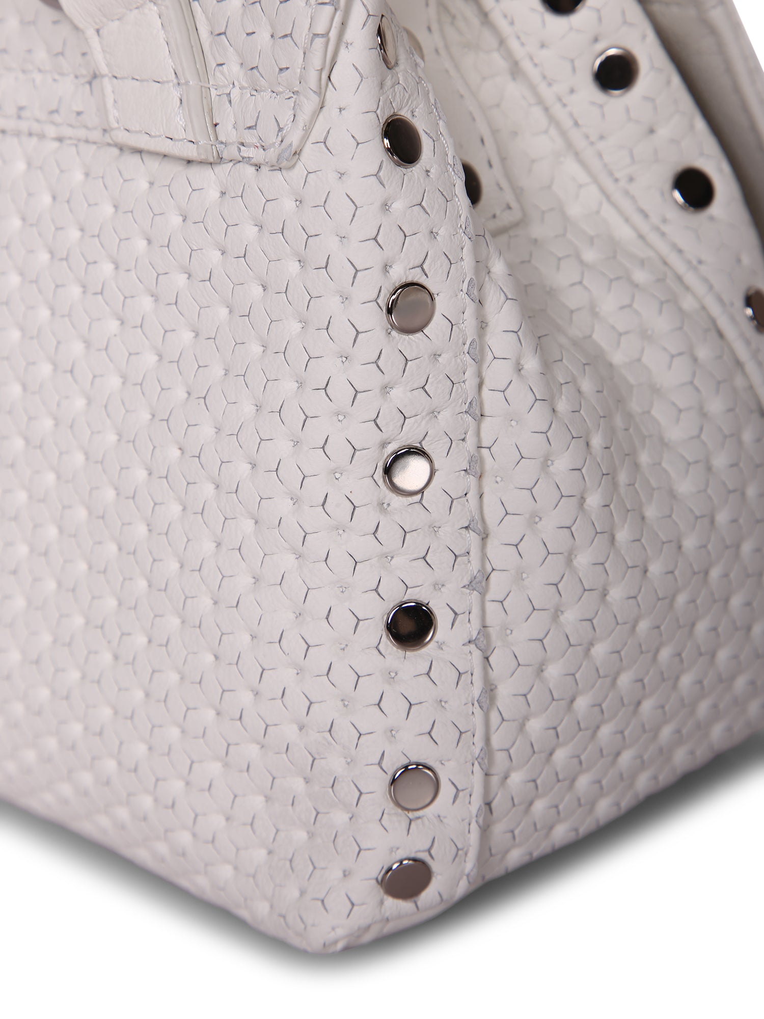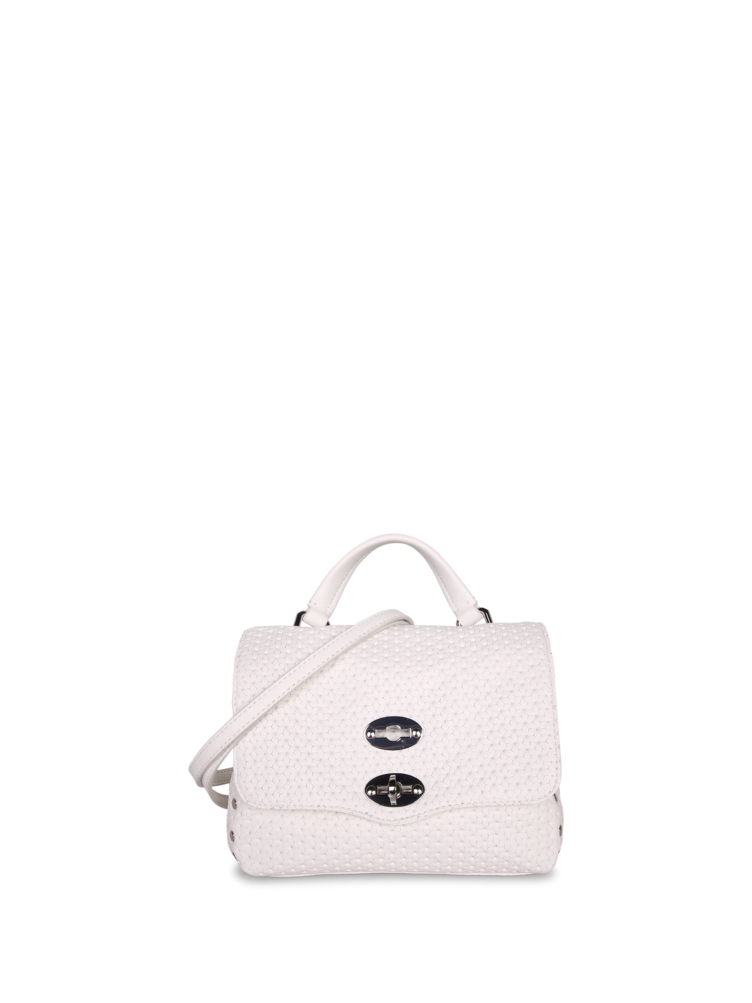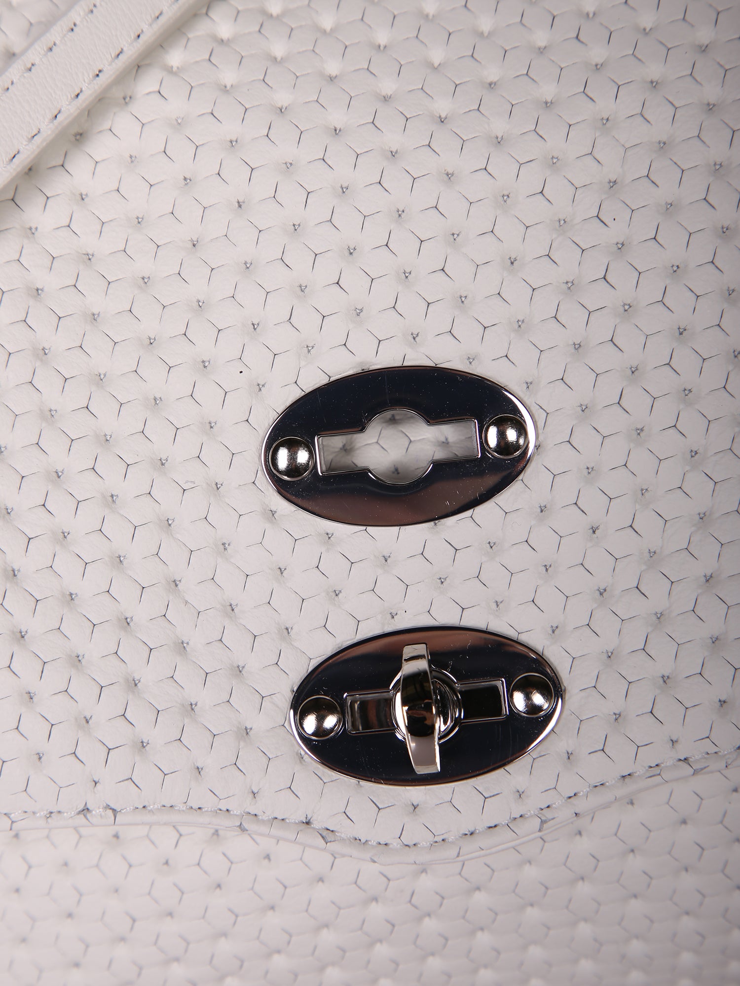 White textured leather, adjustable and removable shoulder strap, flap closure with iconic lock.