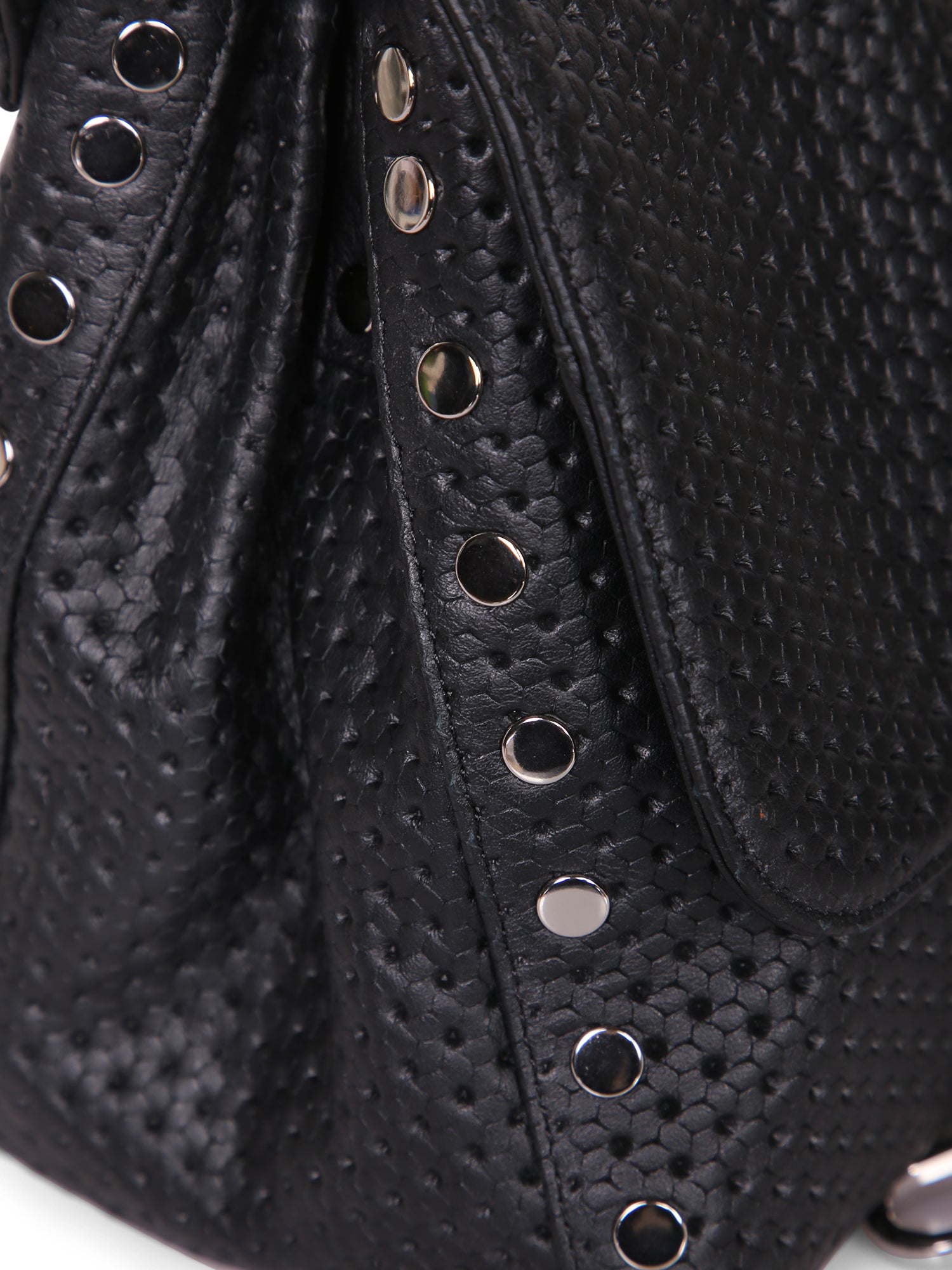 Adjustable and detachable shoulder strap. Snap top closure. Embossed texture.