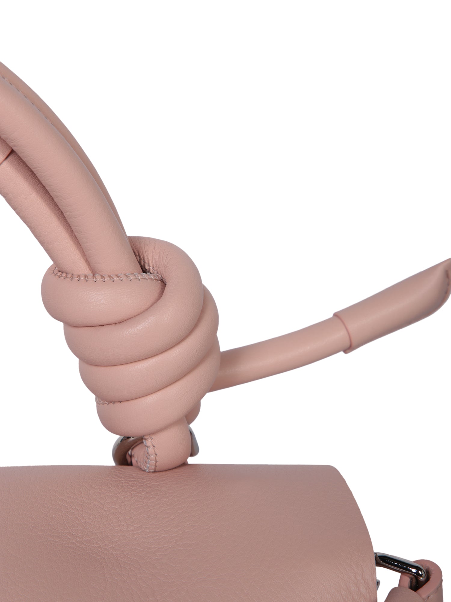 Knot detail handle. Adjustable detachable shoulder strap. Front fastening. Size: 29 x 20 x 15 cm