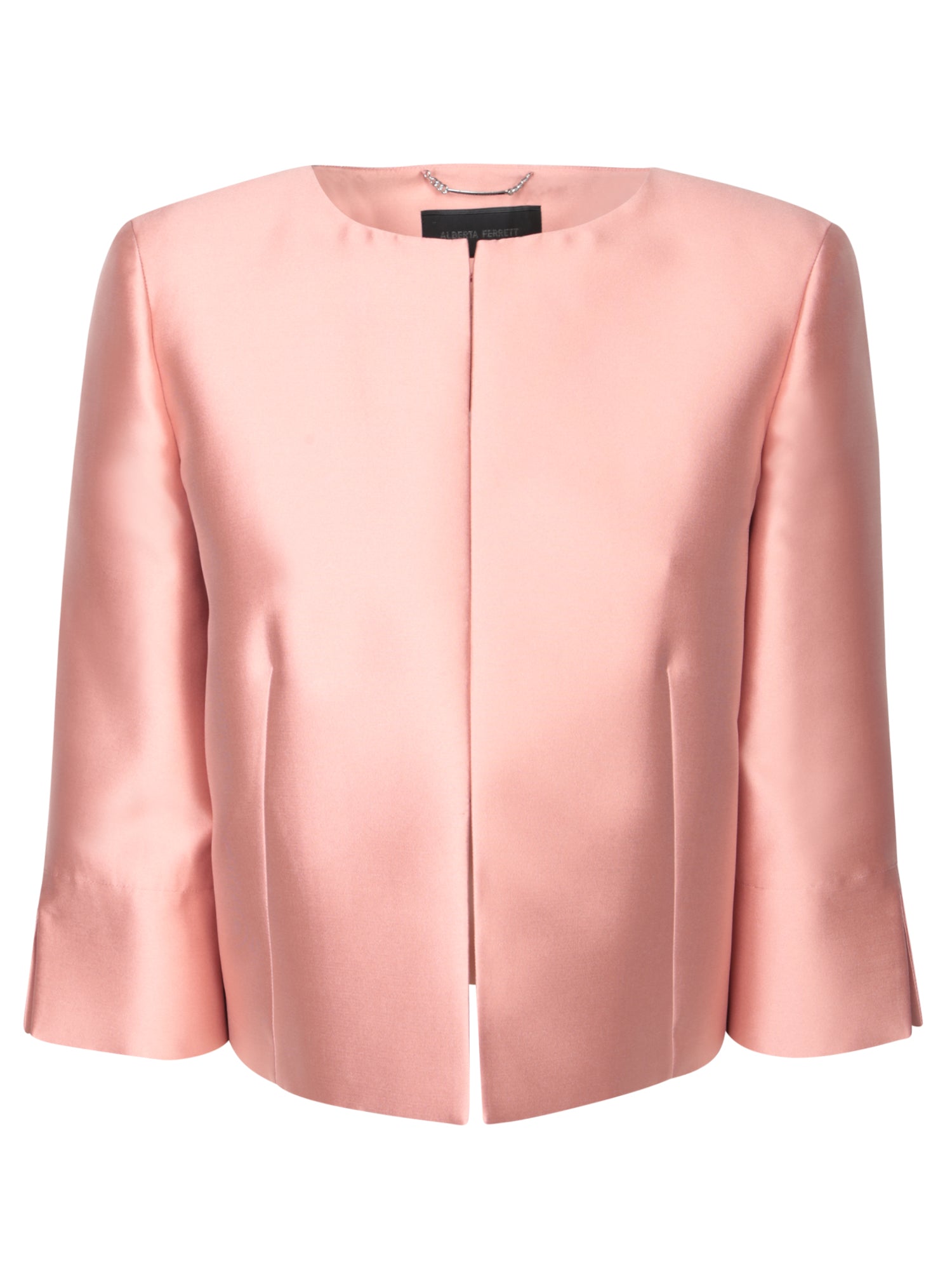 A modern reinterpretation of the classic cropped jacket by Alberta Ferretti, crafted in luxurious powder pink mikado fabric, featuring a clean and minimal design with a hidden front closure for a sophisticated silhouette.