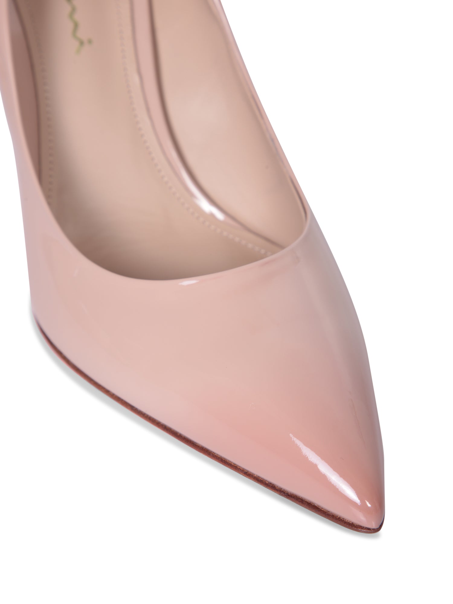 Glossy patent upper. 10 cm stiletto heel. Pointed toe.