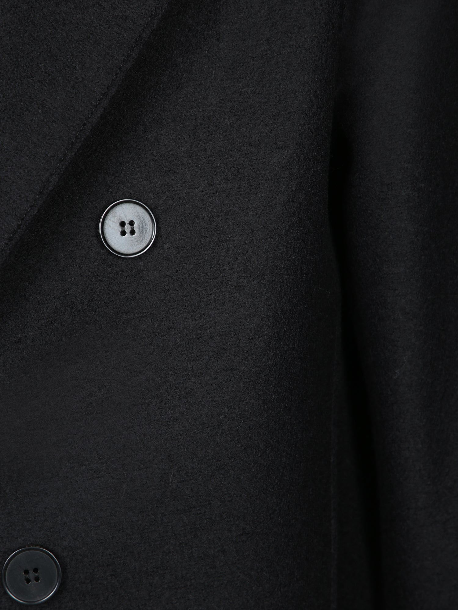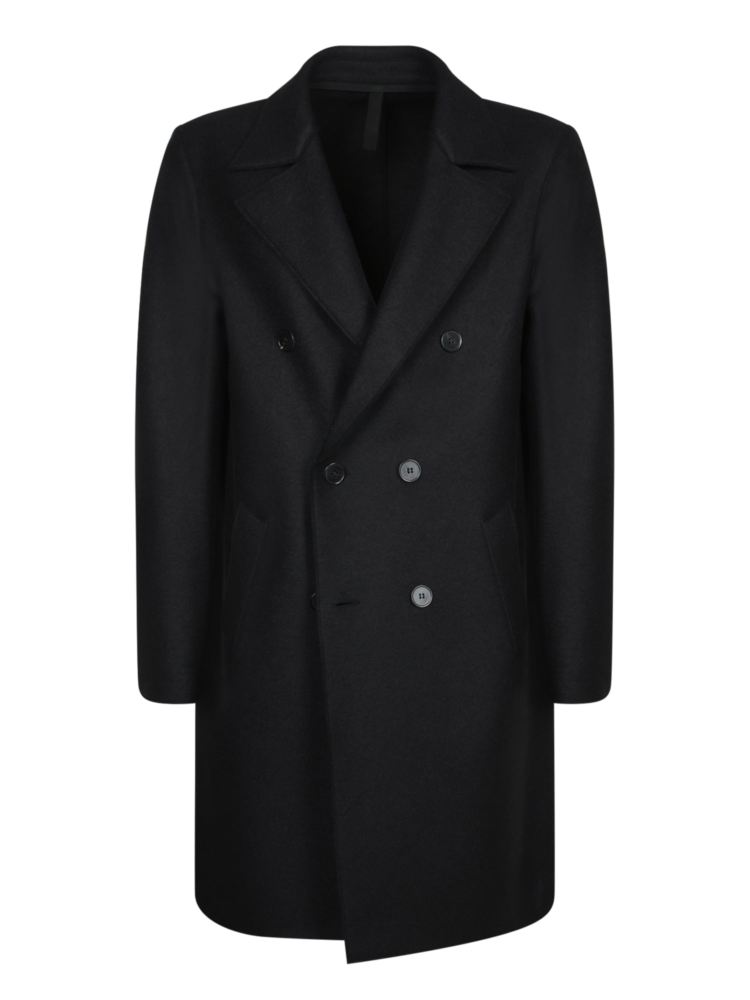 Double-breasted coat. Made from pressed wool. Classic lapel collar.