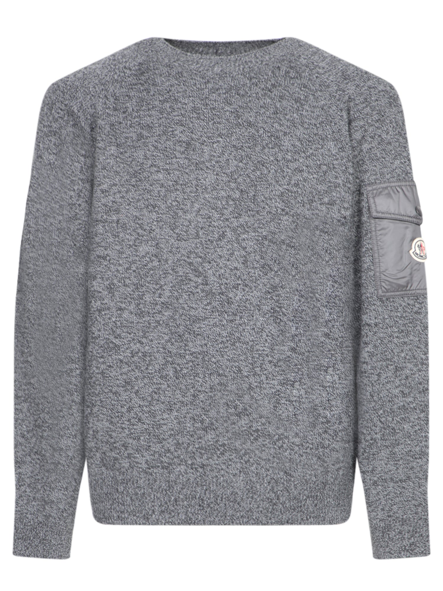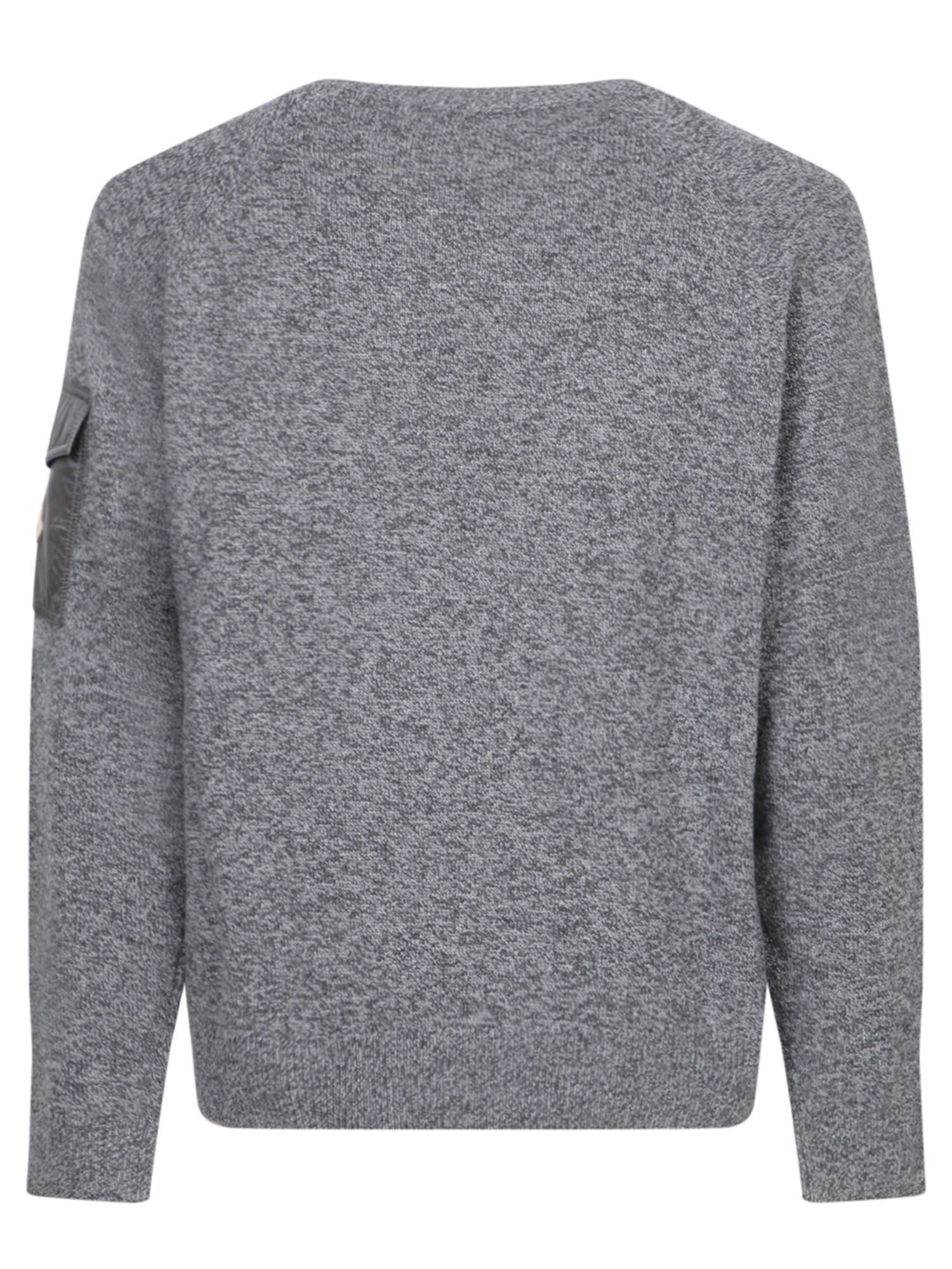 Long sleeve grey knit sweater. Logo patch on the left sleeve.