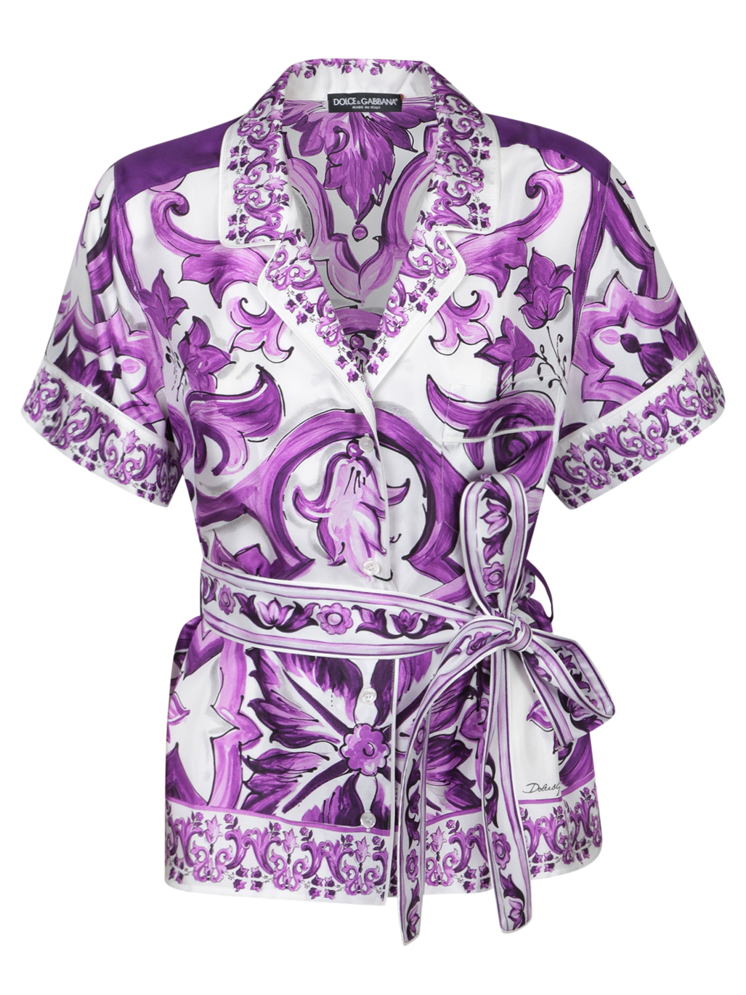 This Dolce & Gabbana shirt features an exclusive maiolica print in shades of purple on a white base, adorned with a fabric belt that elegantly defines the silhouette.