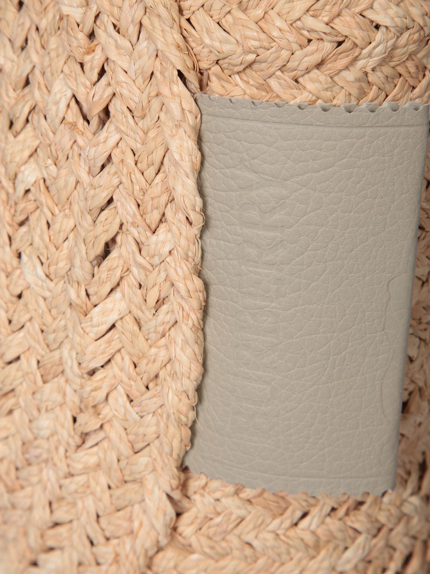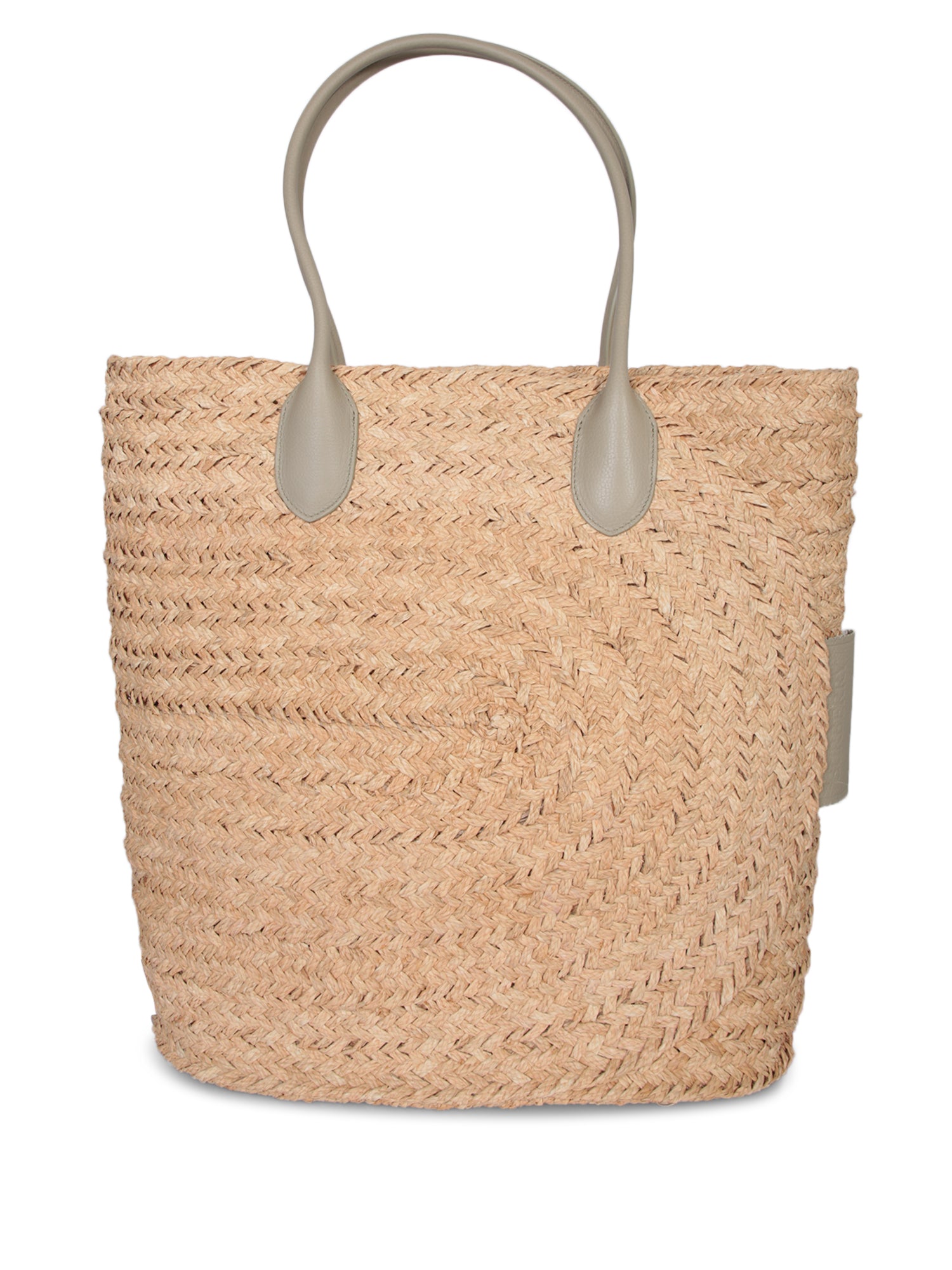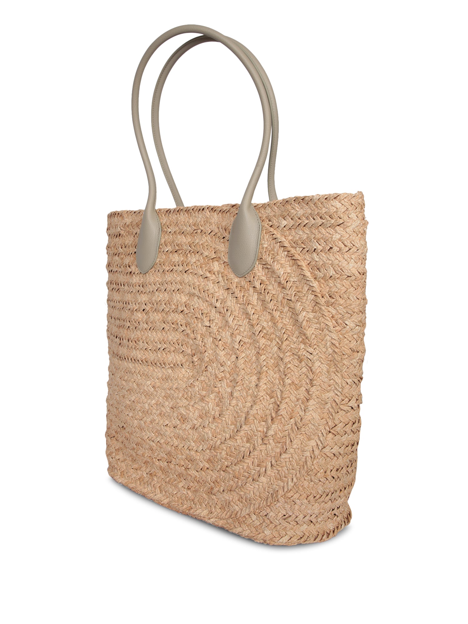 Crafted from interwoven raffia with natural leather handles. Spacious and durable.