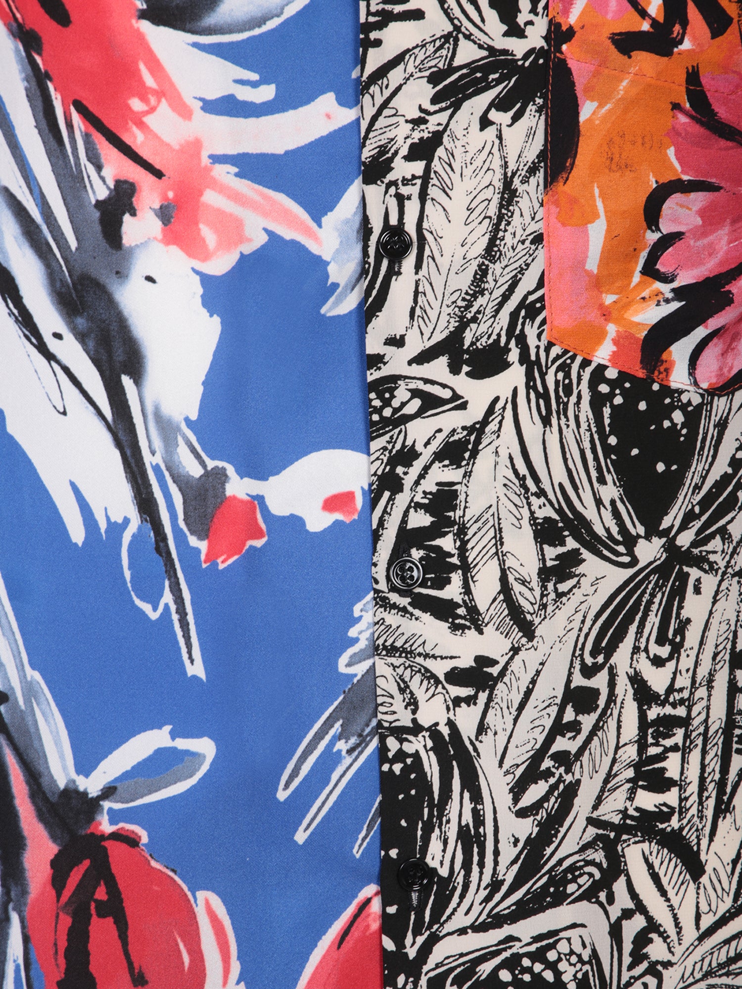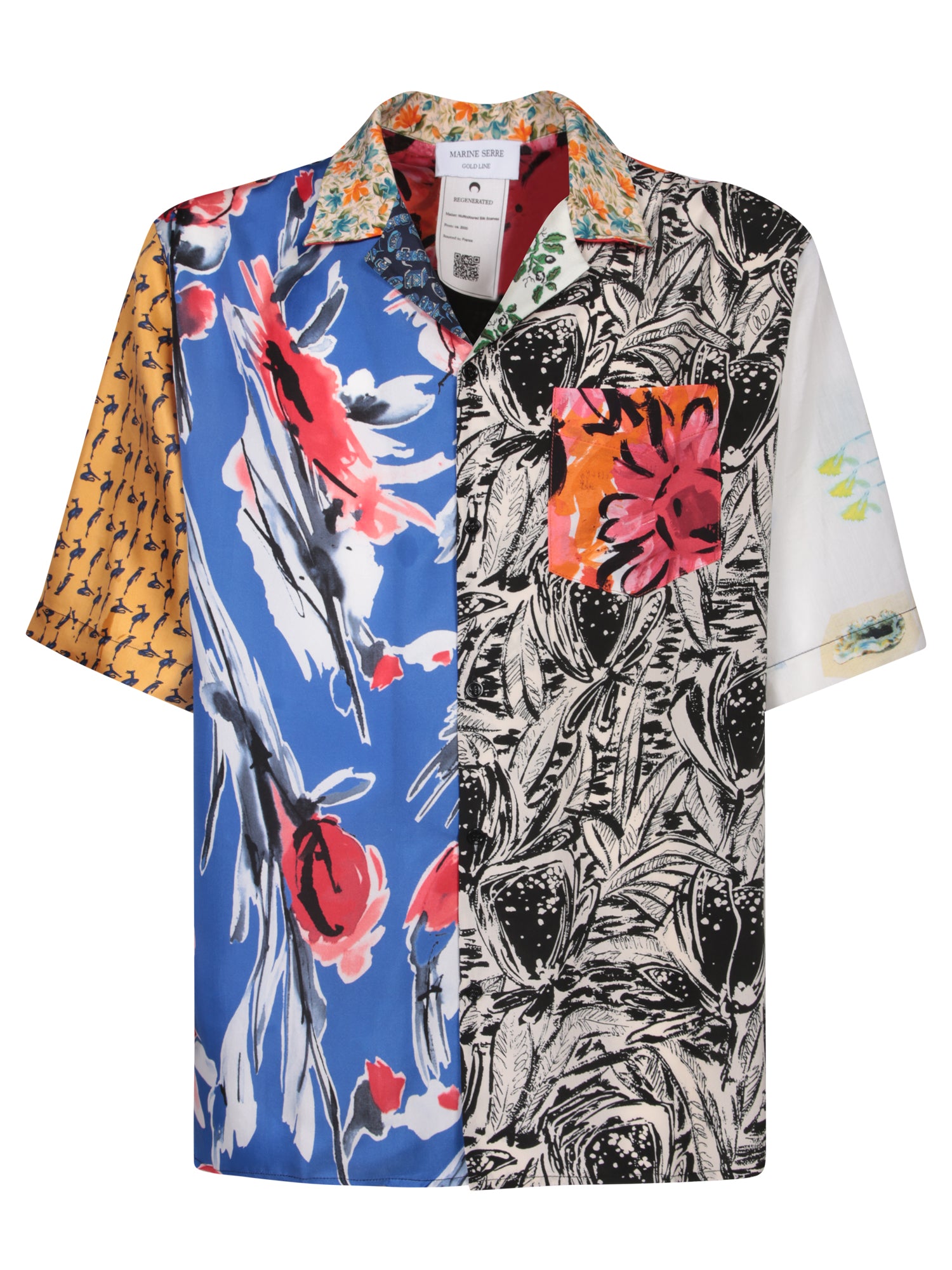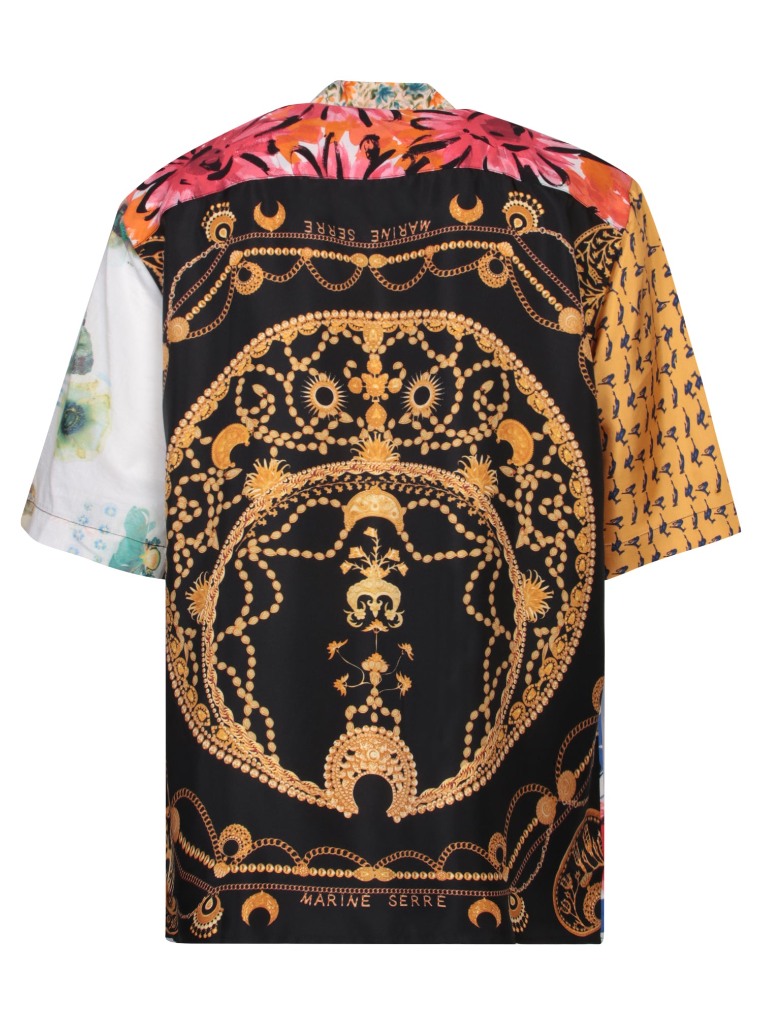 Short sleeve shirt, multifunctional with various prints combined in patchwork. Classic collar and front button closure.