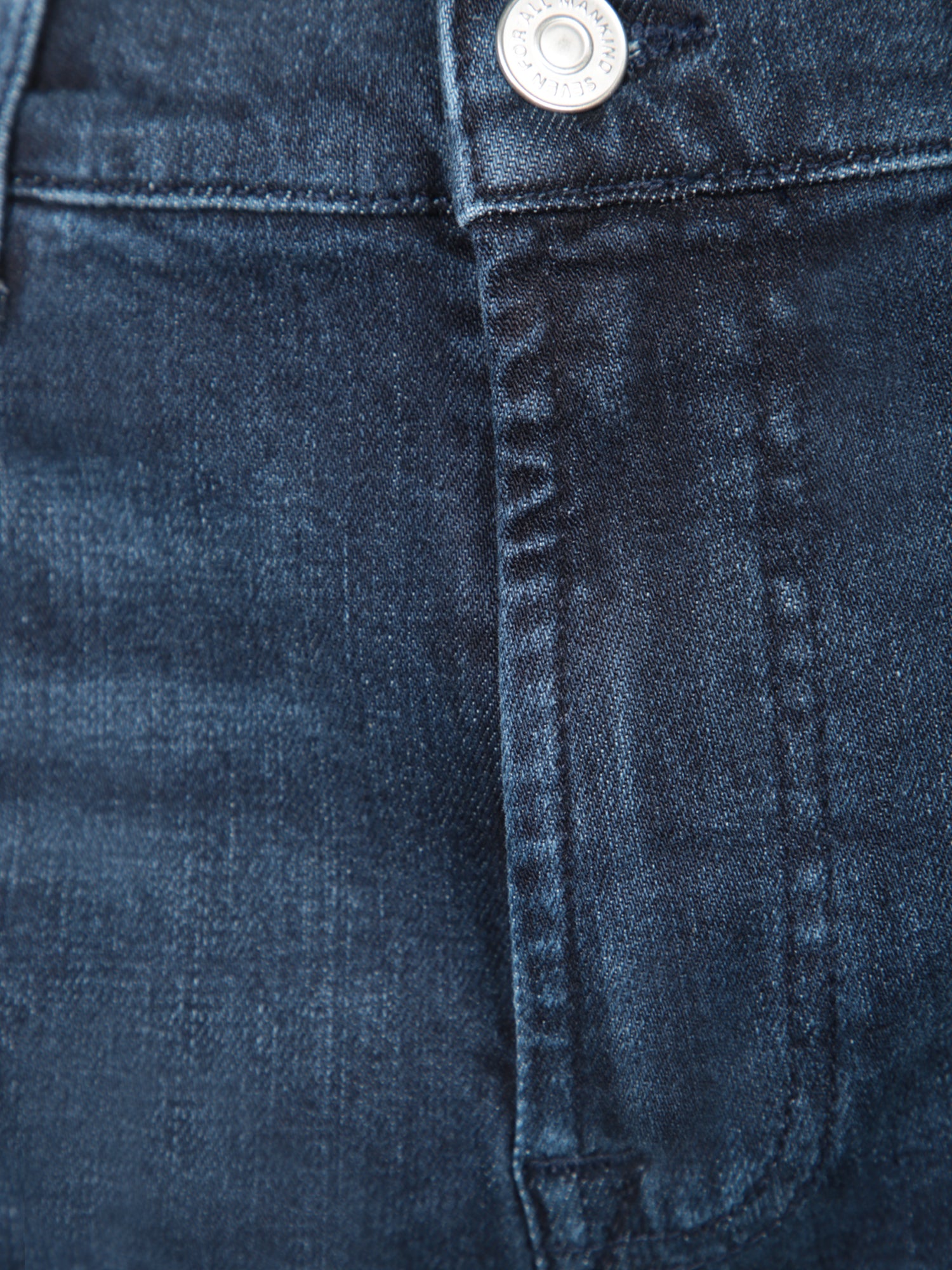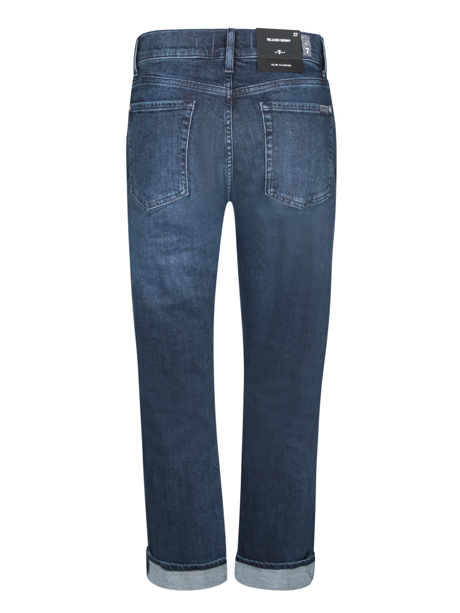 Relaxed skinny fit. Front zip and button closure. Five-pocket style.