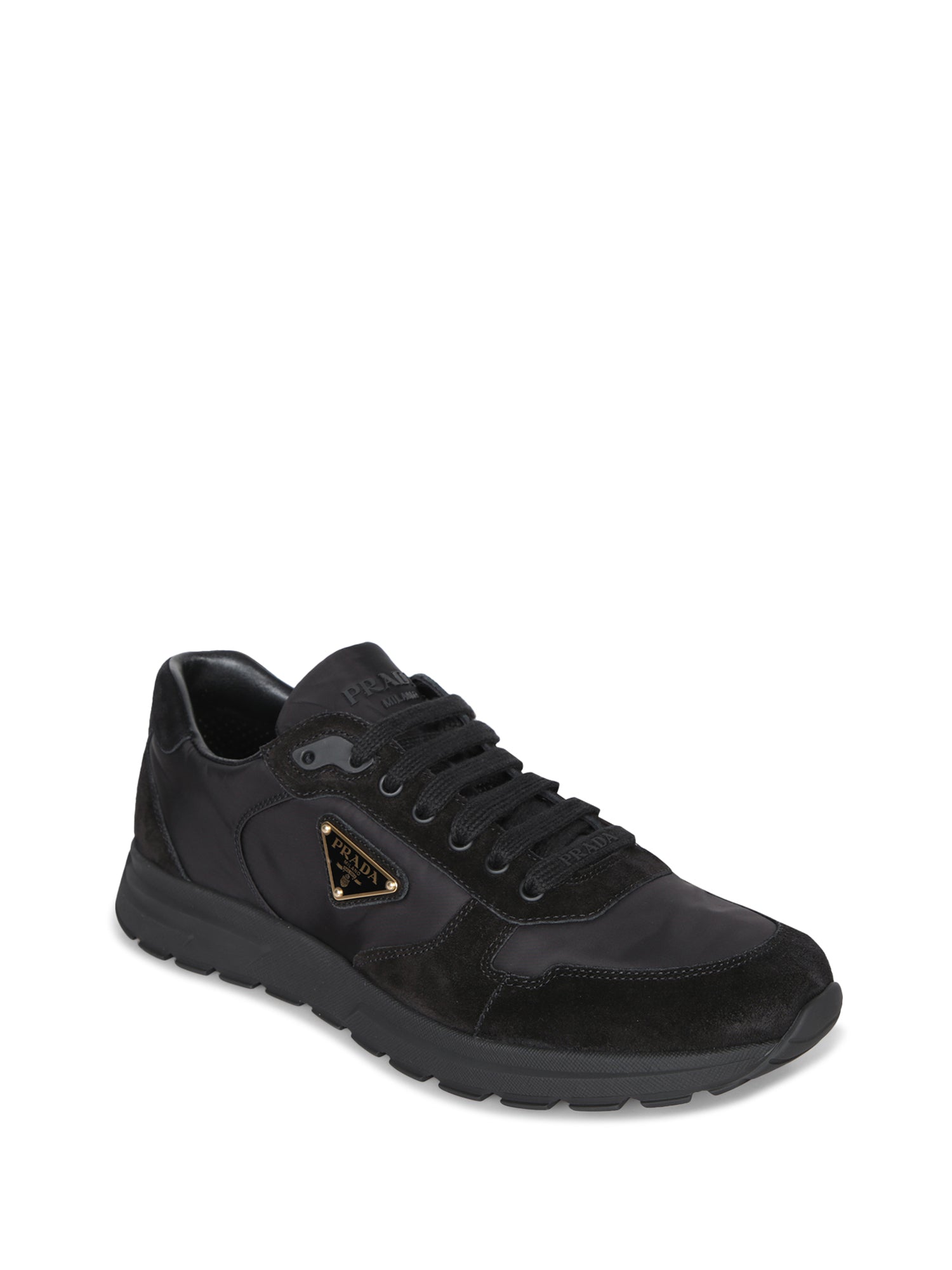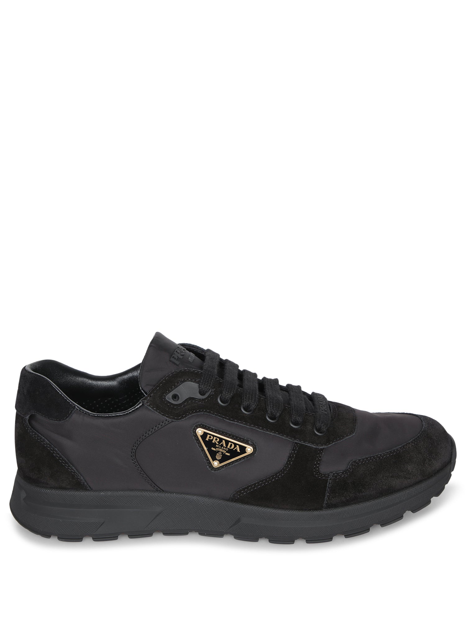 Sneakers made of recycled nylon and suede. PRADA metal logo. Rubber sole.