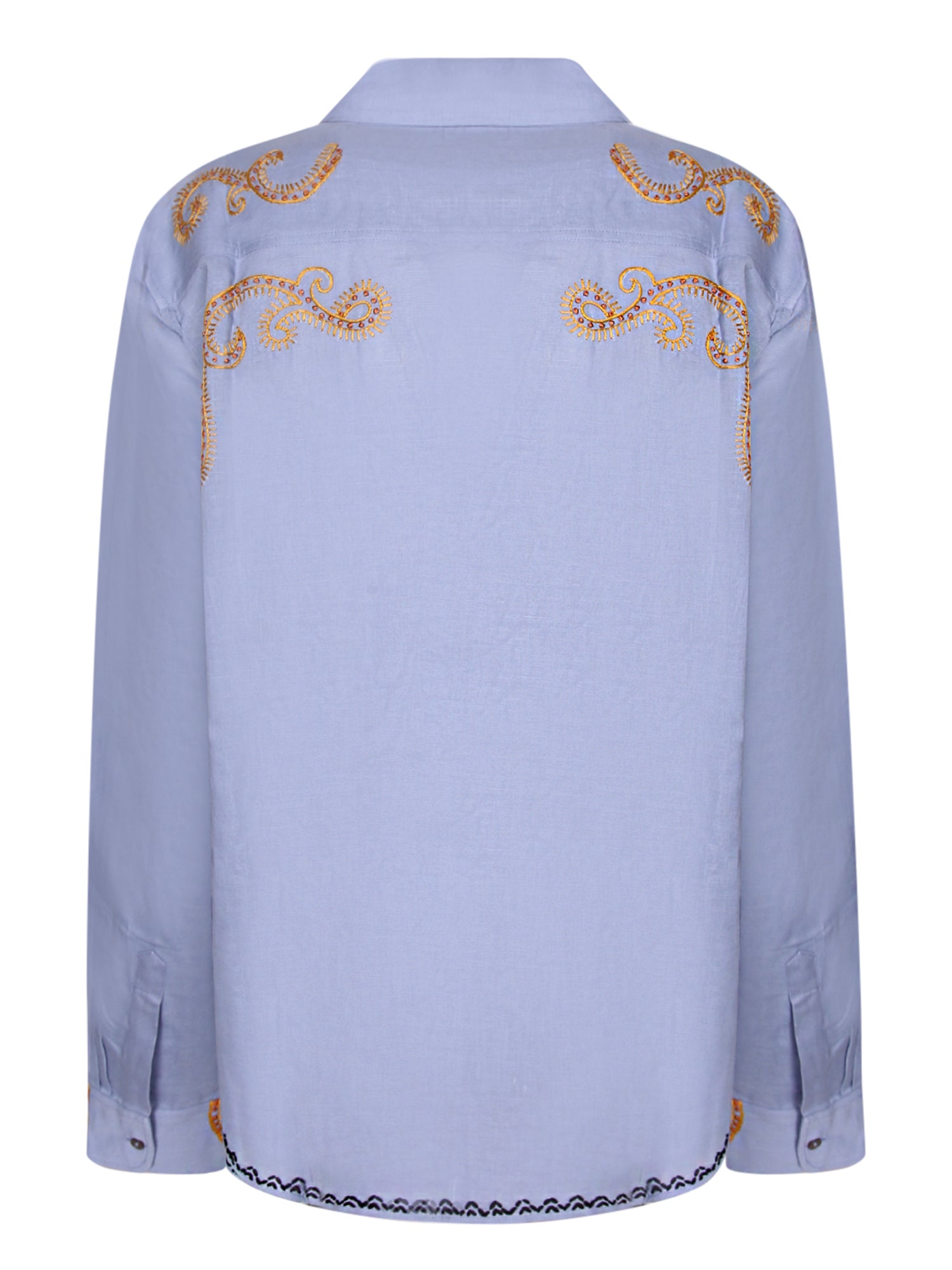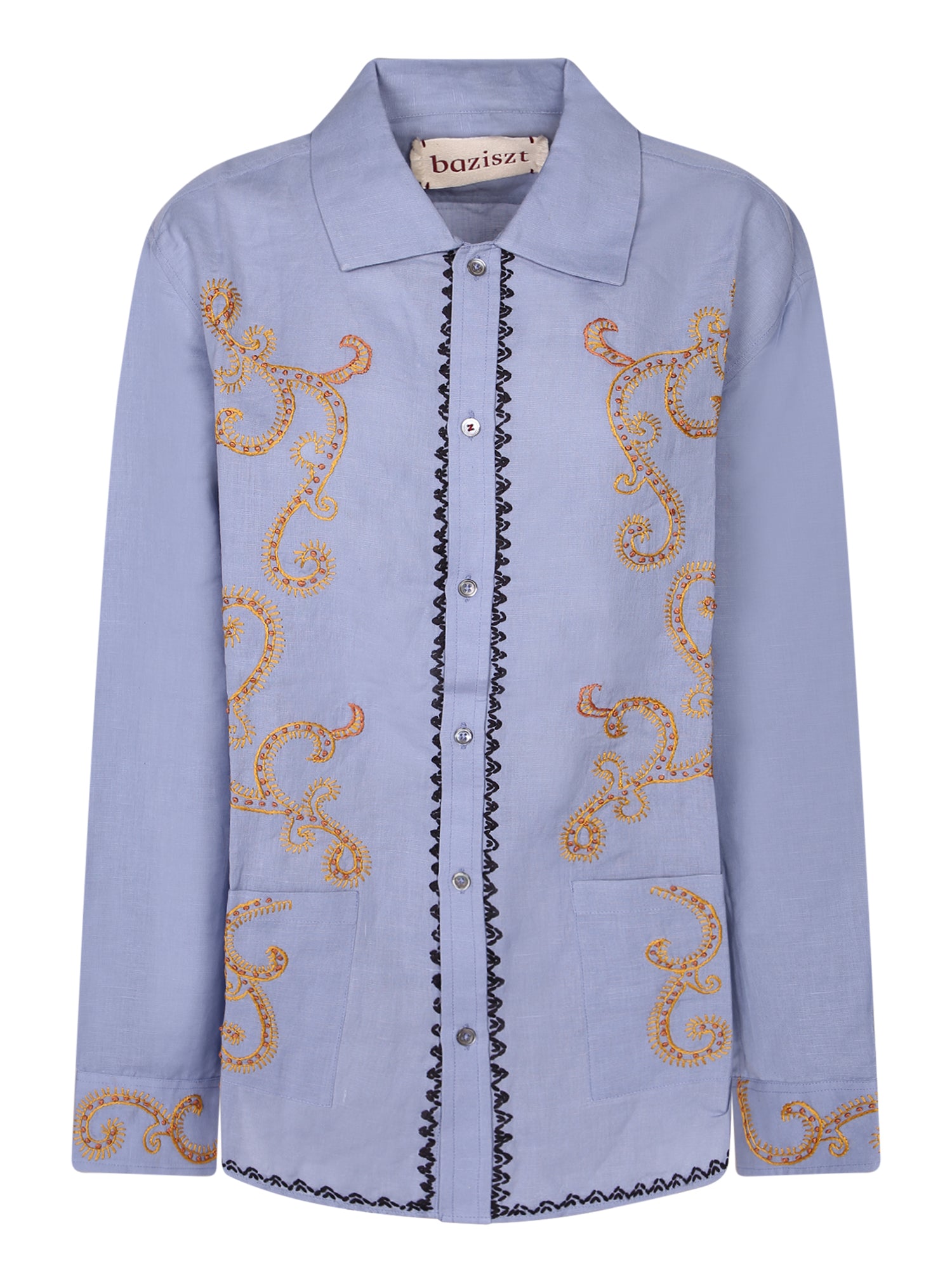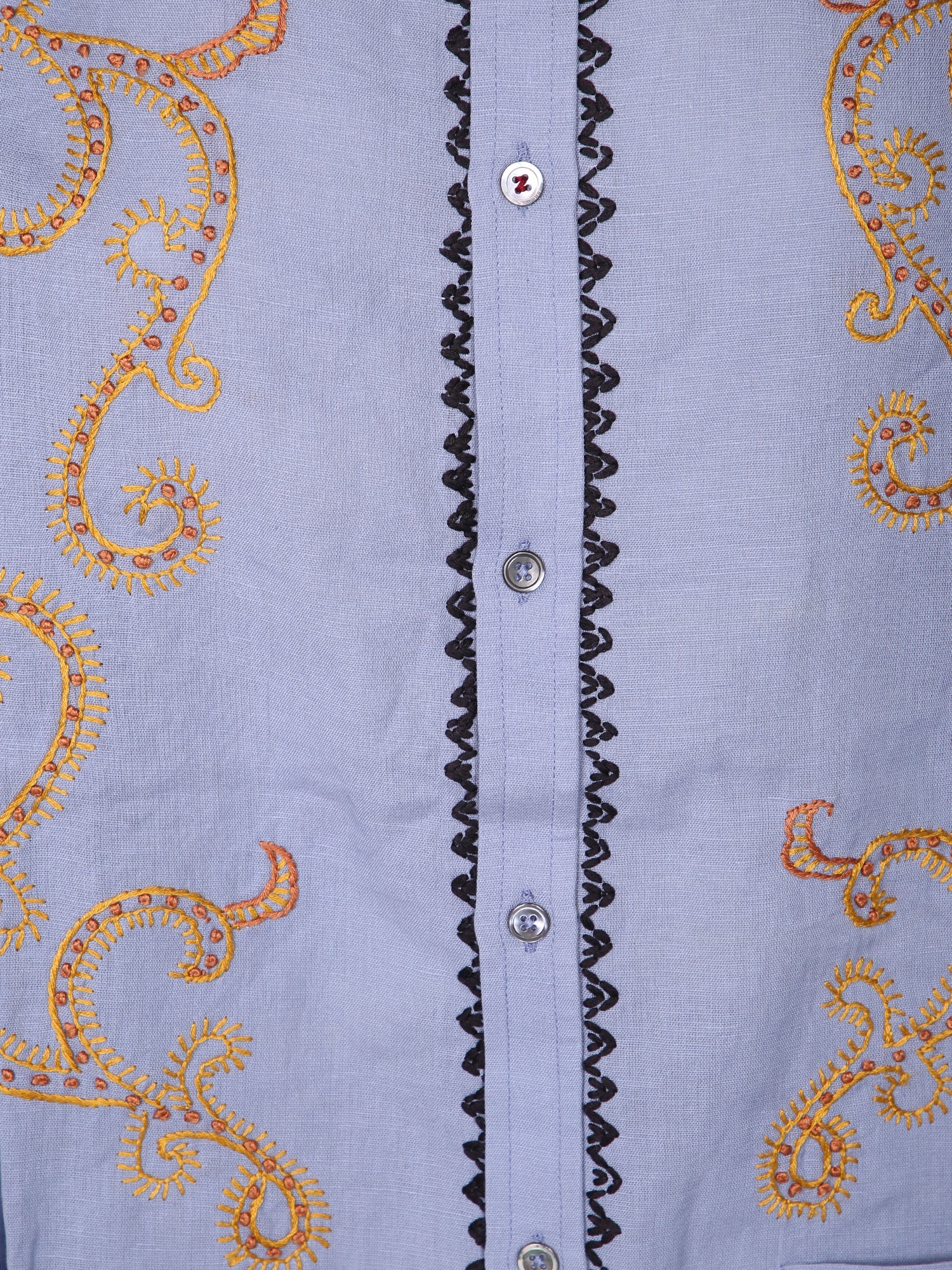 Long sleeves, golden embroidery, front button closure.