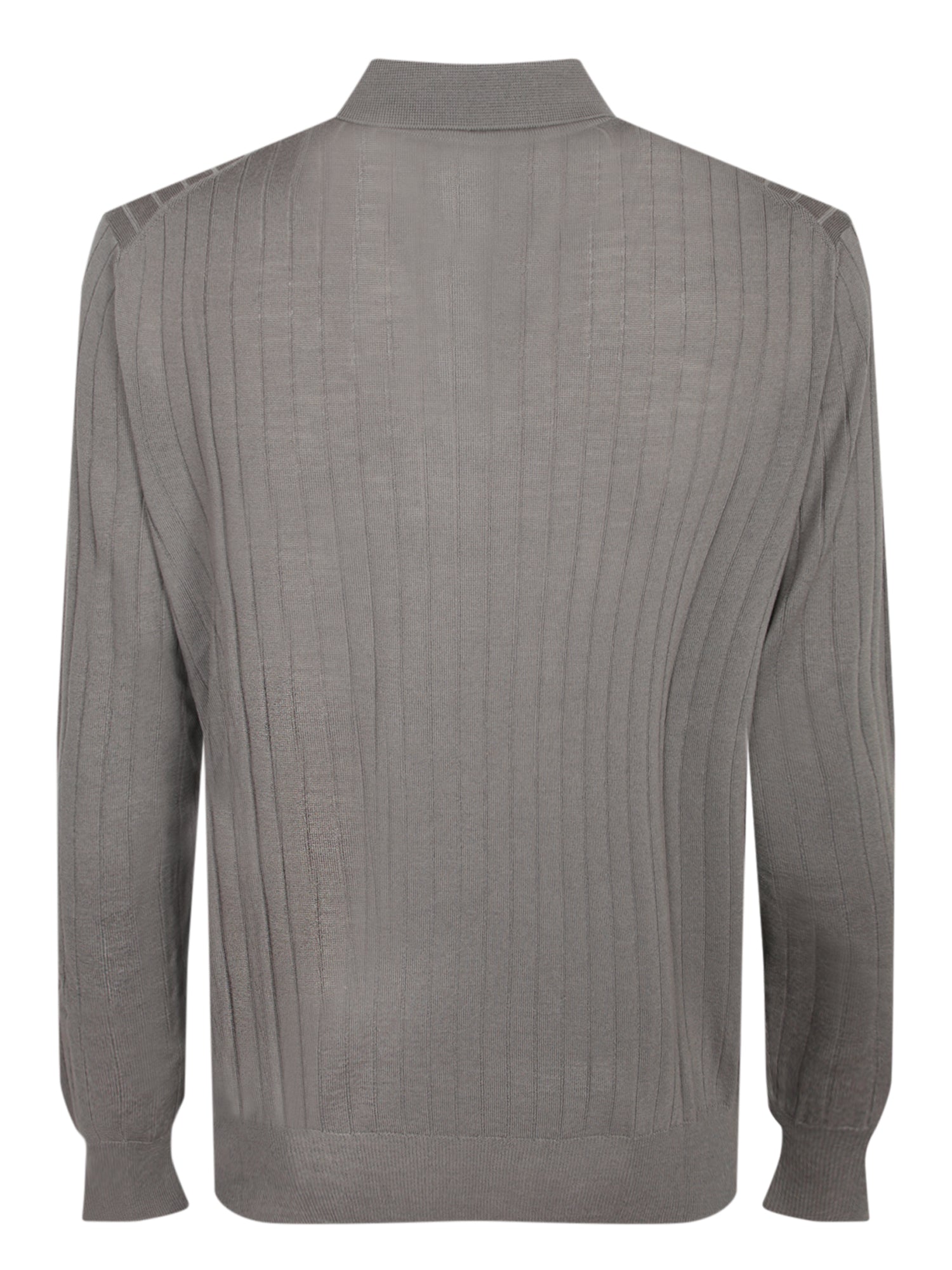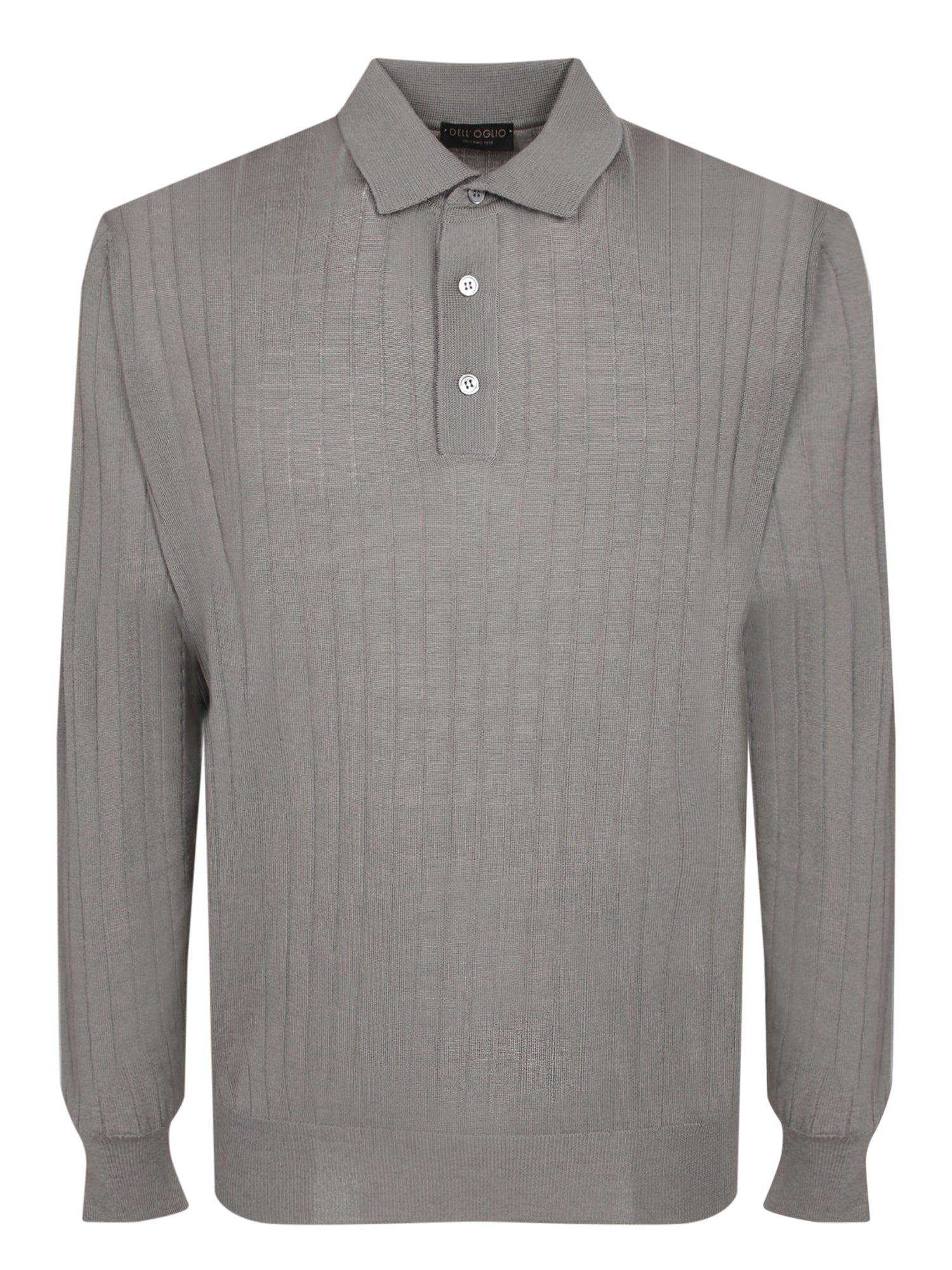 Long sleeve polo. Ribbed knit fabric. Classic collar with three-button placket.