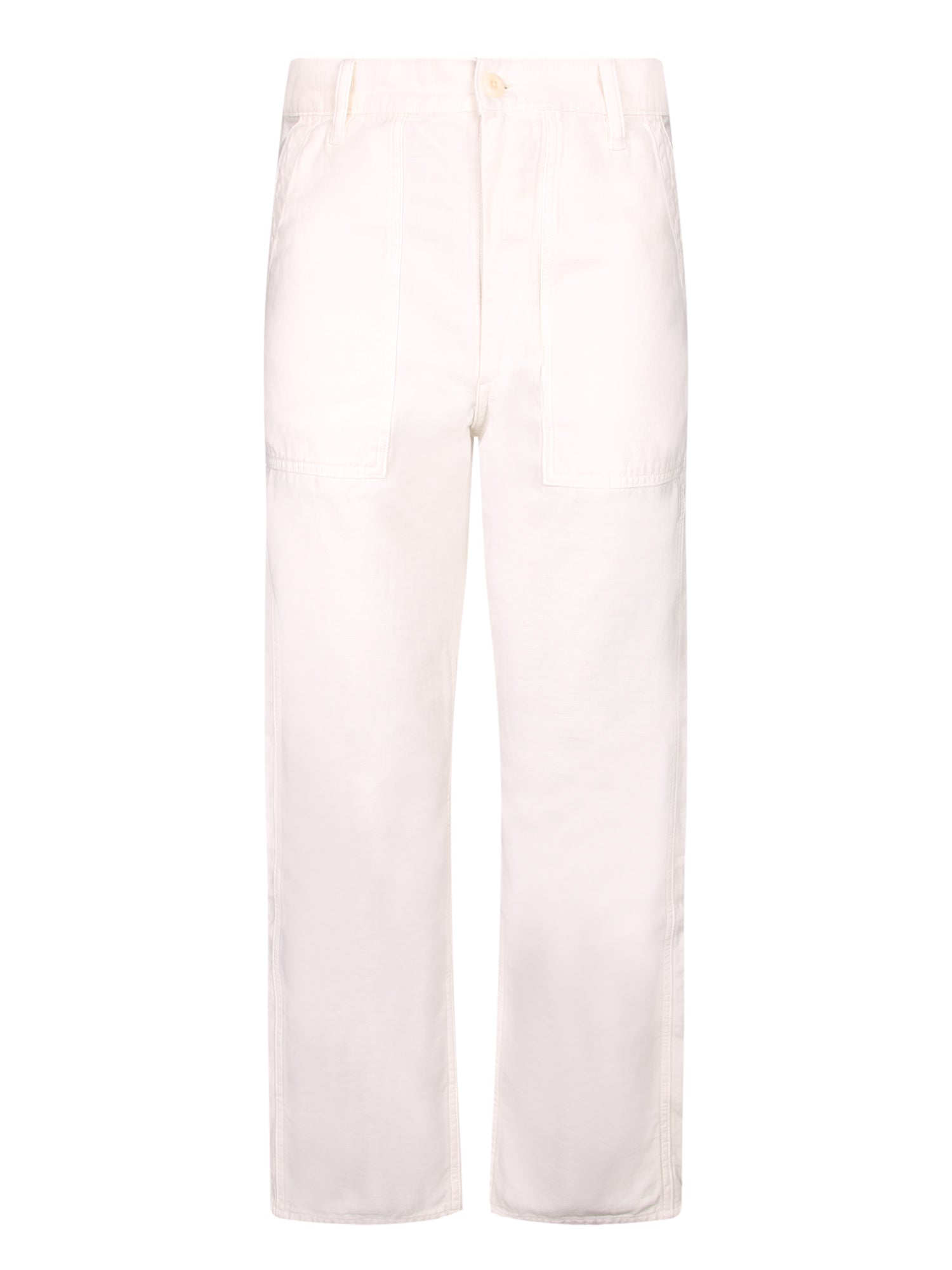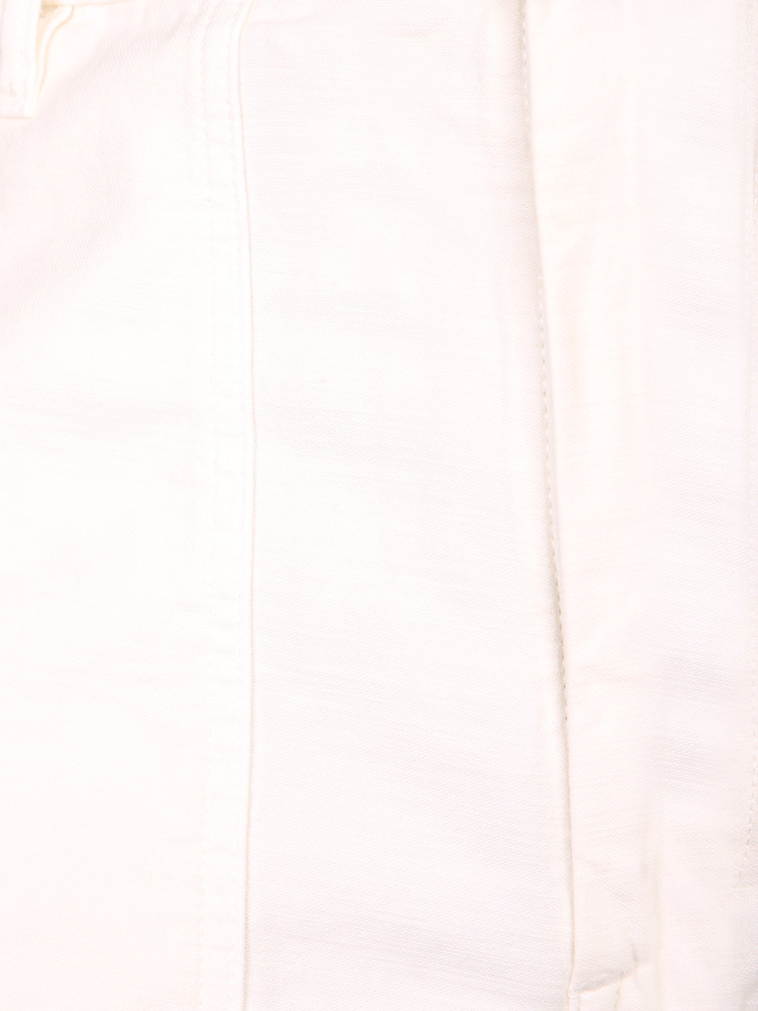 High-waisted pants, sateen fabric, cream color. Front closure with zip and button.