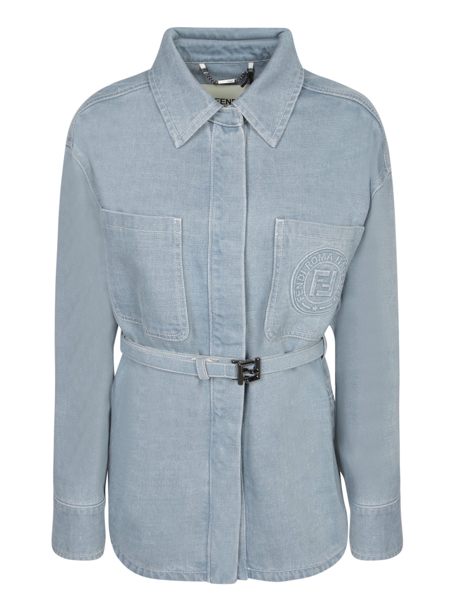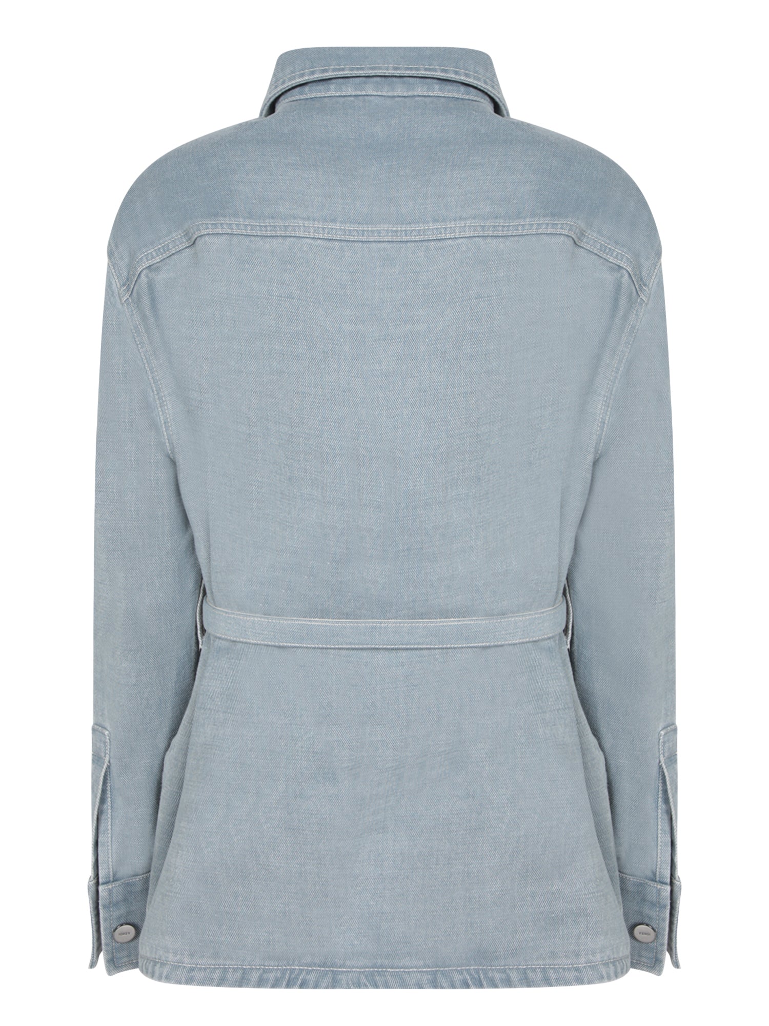 Denim jacket with belt. Classic collar. Front patch pockets.