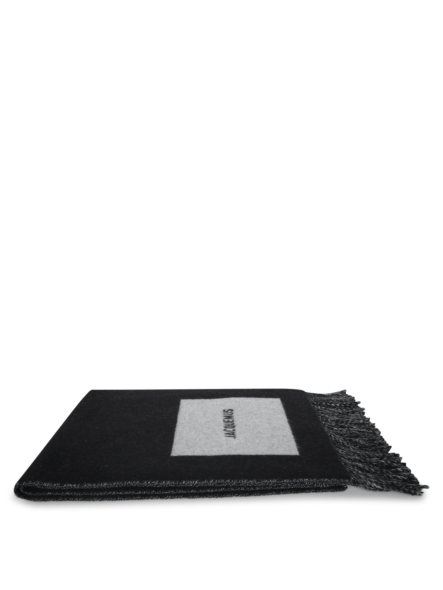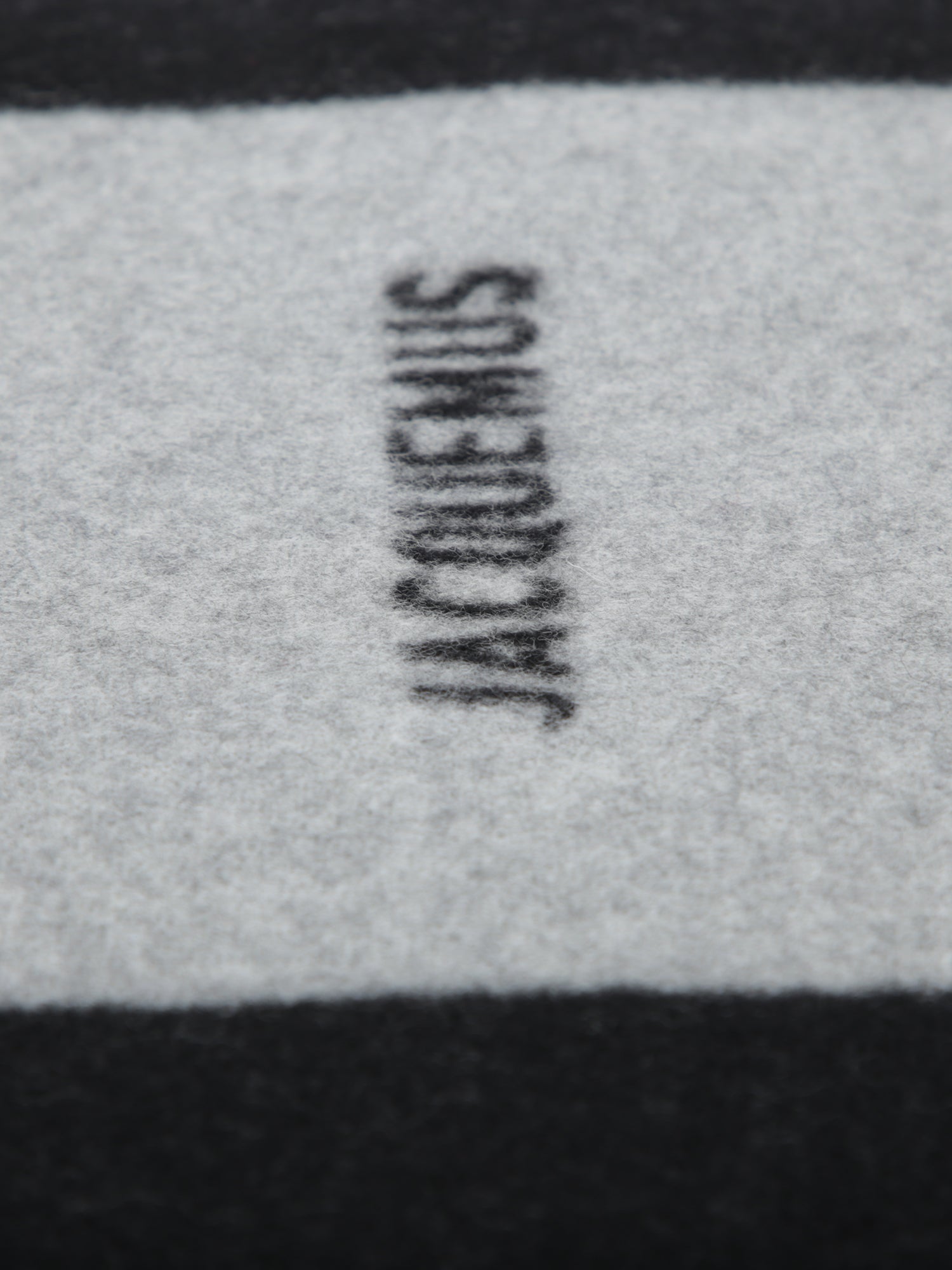 Black wool scarf with white Jacquemus logo, fringed edges.