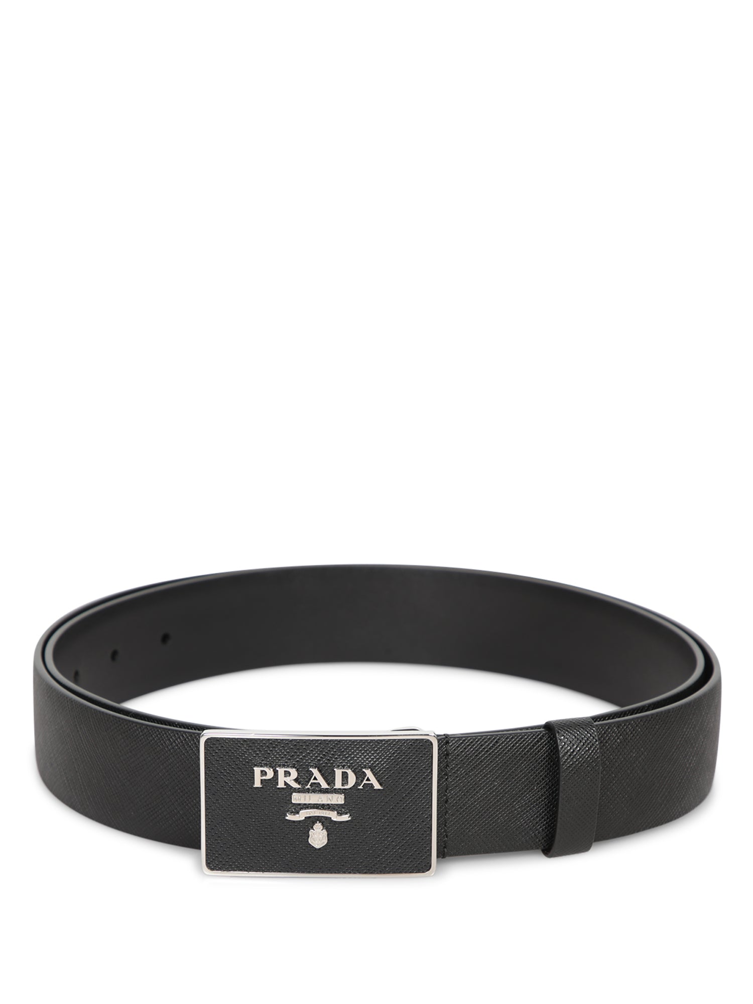 Saffiano leather belt. Metal buckle with Prada logo. Adjustable.