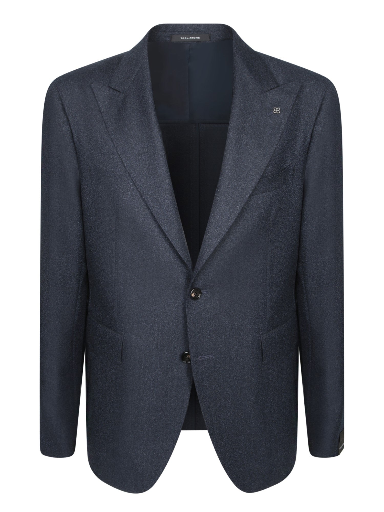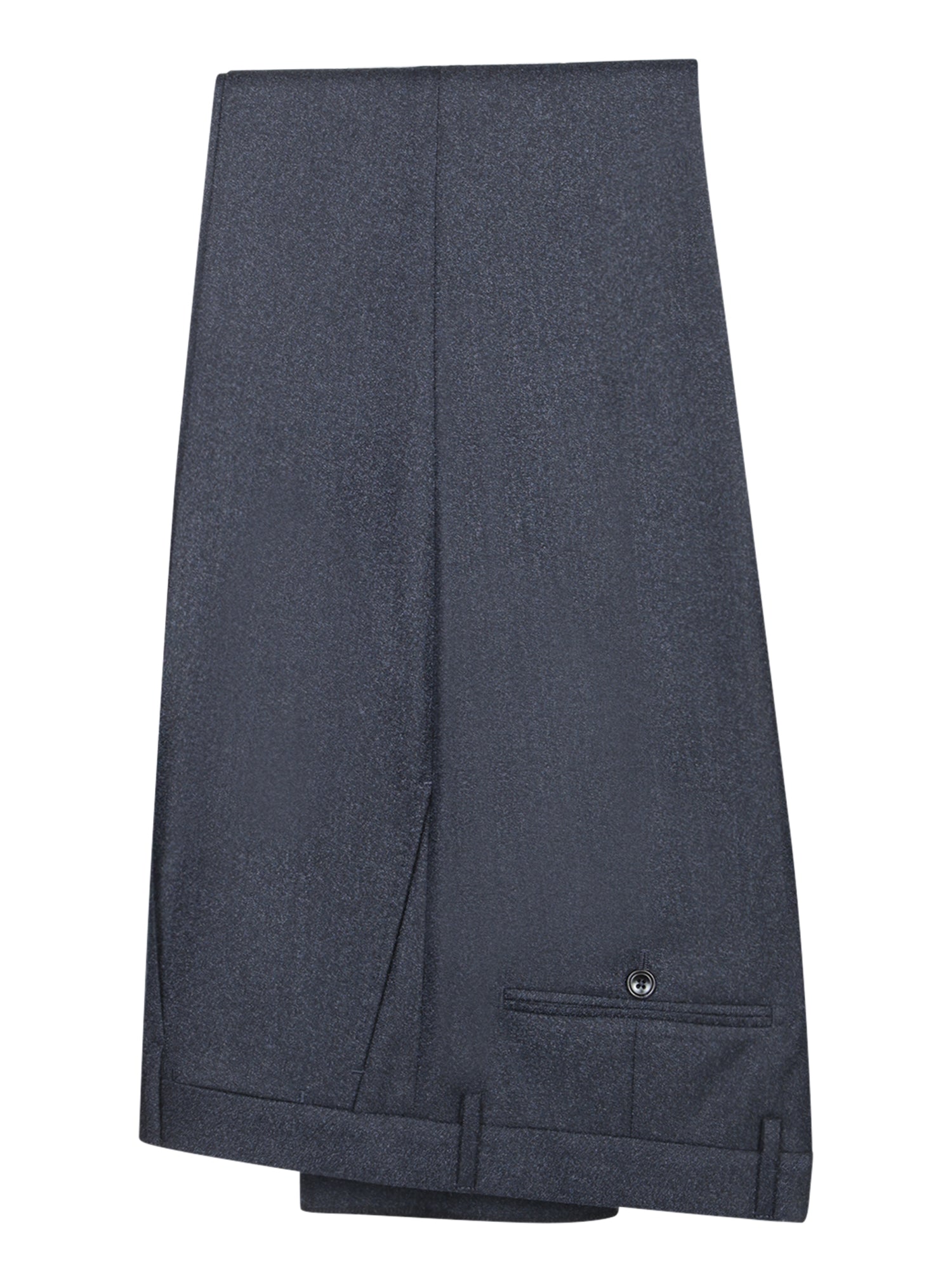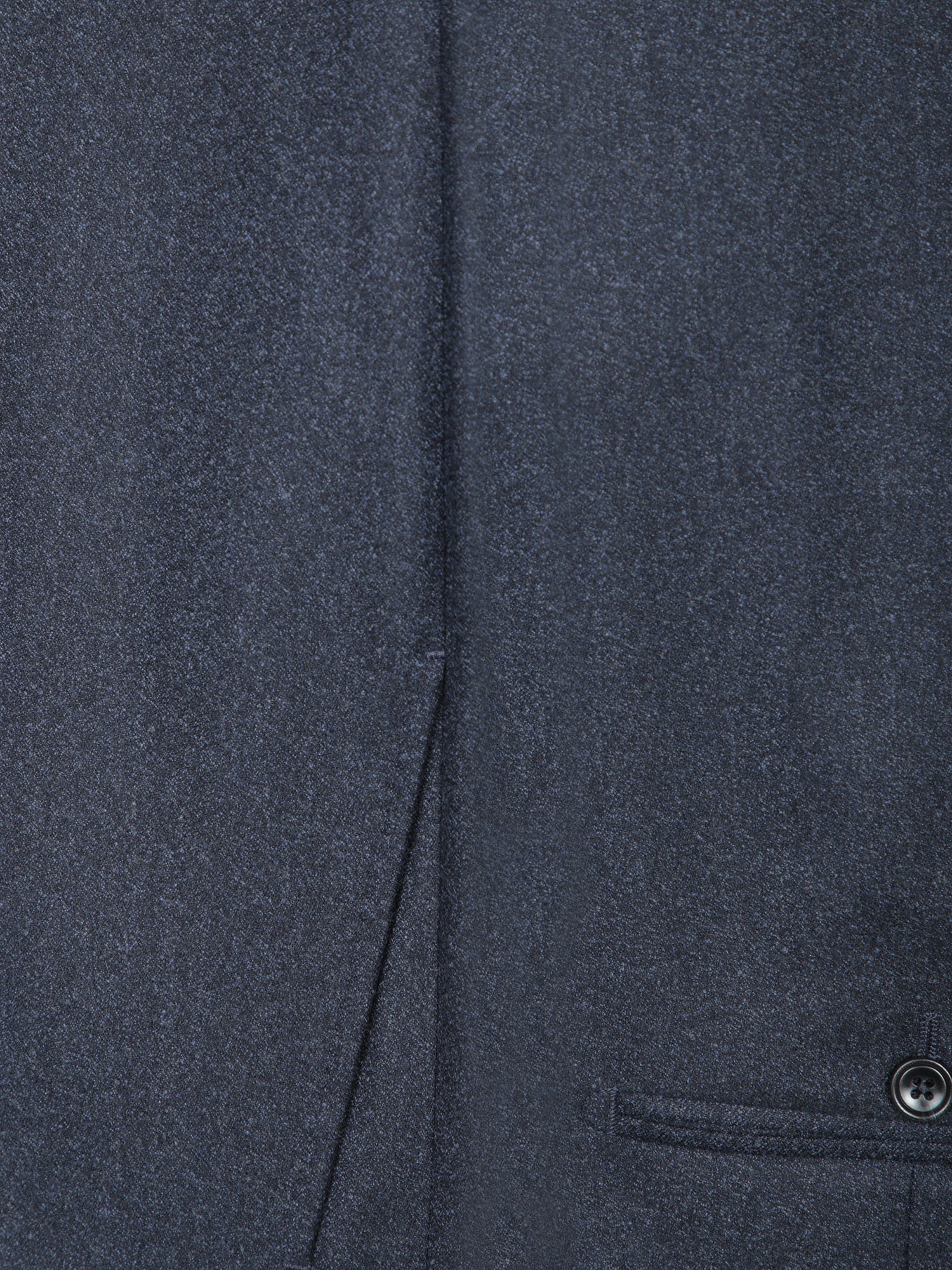 Single-breasted suit with salt-and-pepper texture, two-button closure, notch lapels, and flap pockets.