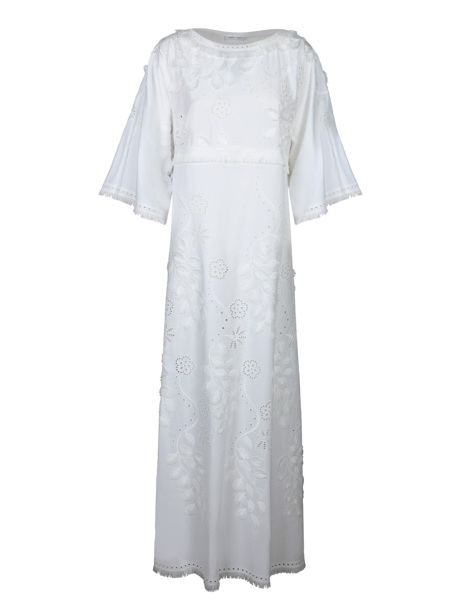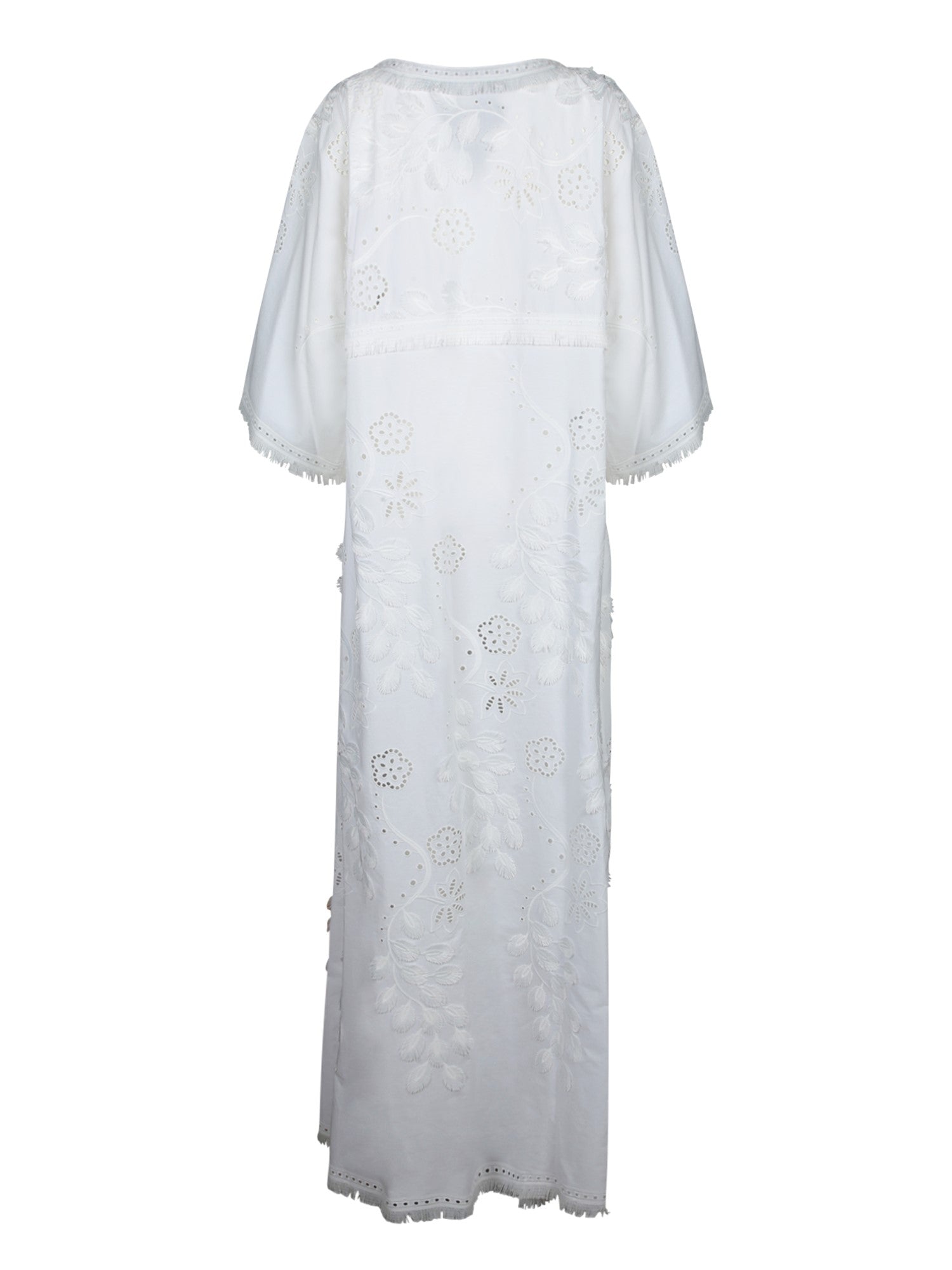 This elegant caftan dress from Alberta Ferretti features an exclusive white eyelet fabric with refined floral applications, perfect for a sophisticated and bright summer look.