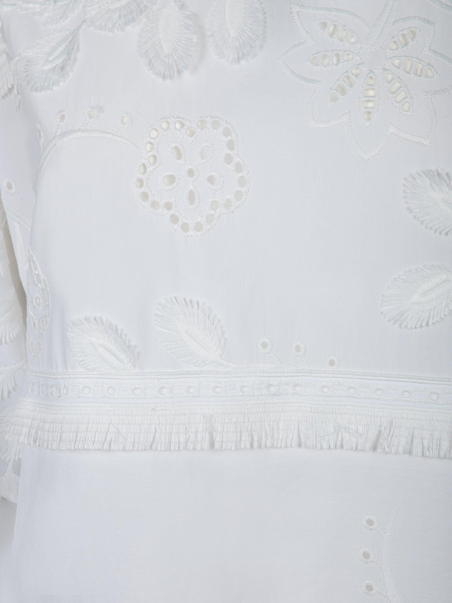 Short sleeve caftan dress in eyelet fabric with floral embroidery. Detailed stitching and scalloped hem.