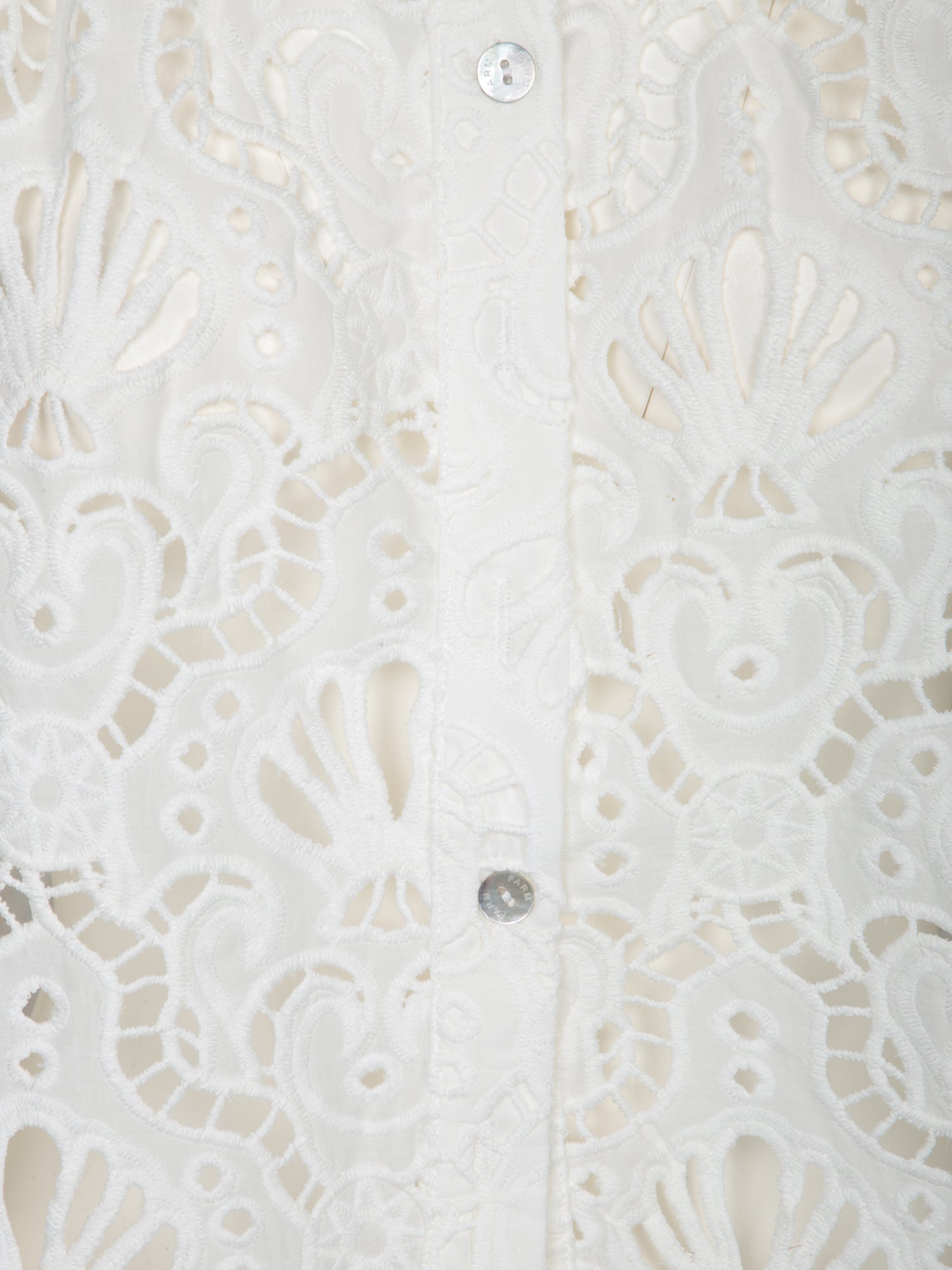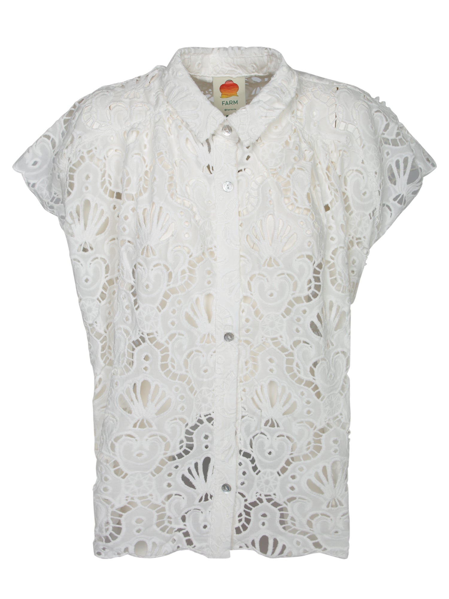 This elegant Farm Rio 'Seashell Eyelet' shirt is a masterpiece of femininity and sophistication. Its intricate lace texture and refined cut make it ideal for chic occasions or elevating everyday looks.
