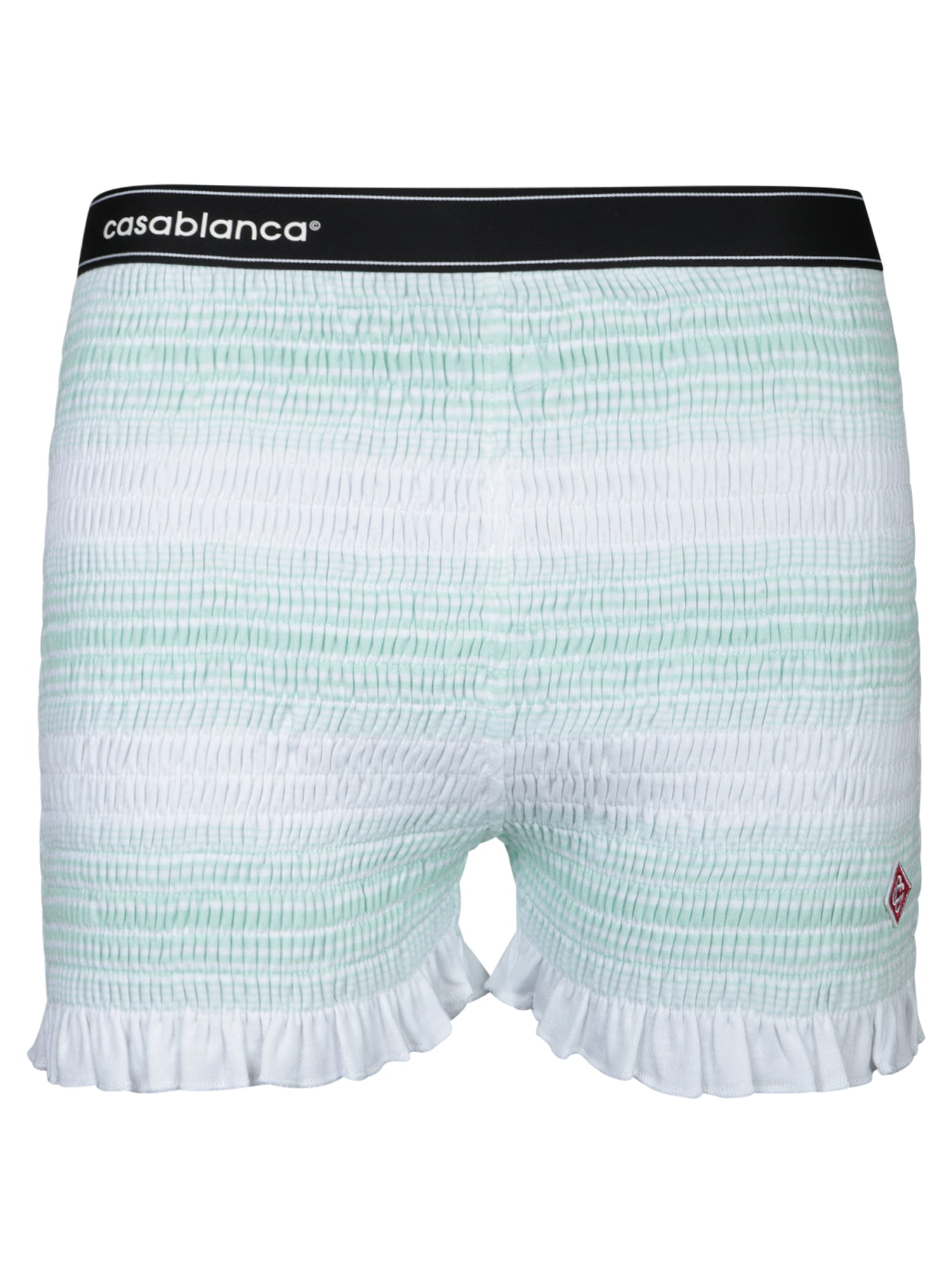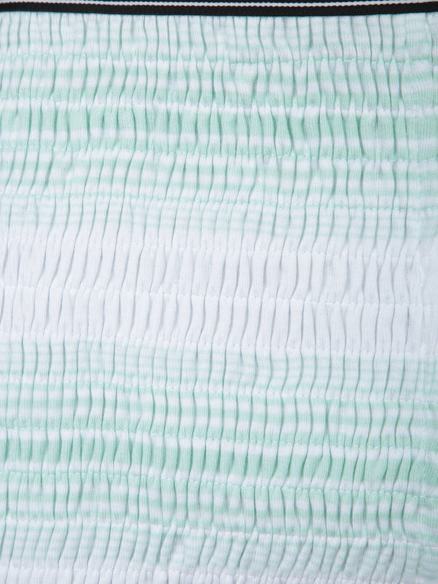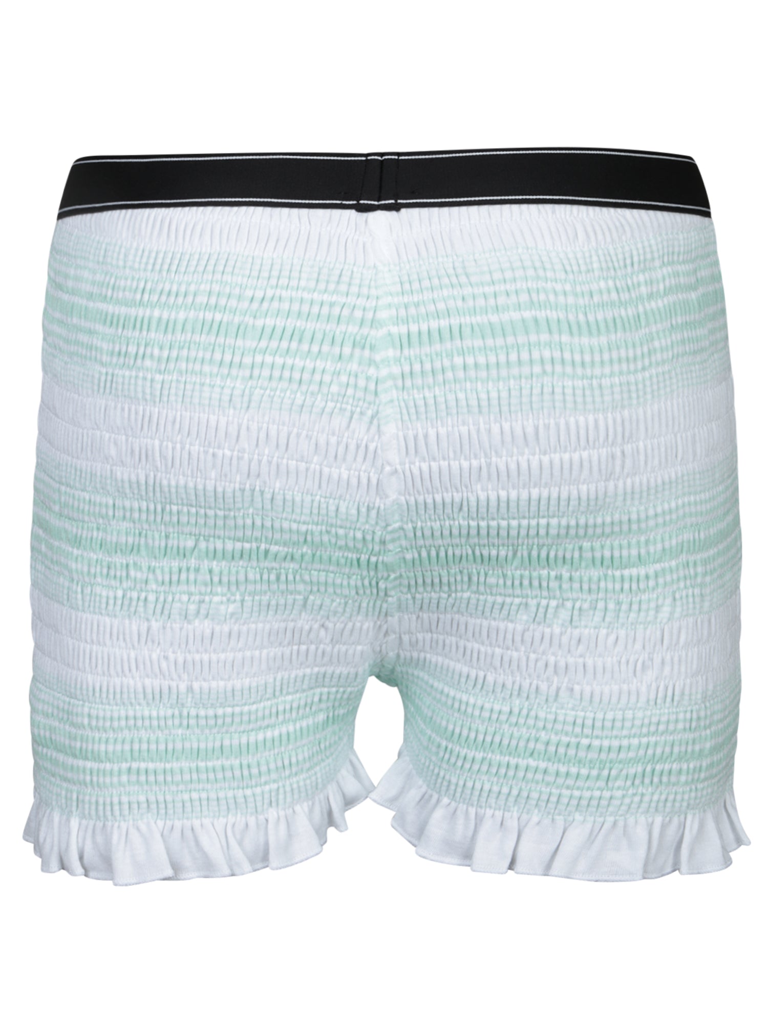 Elastic waistband, striped design, shirred detail, ruffled hem.