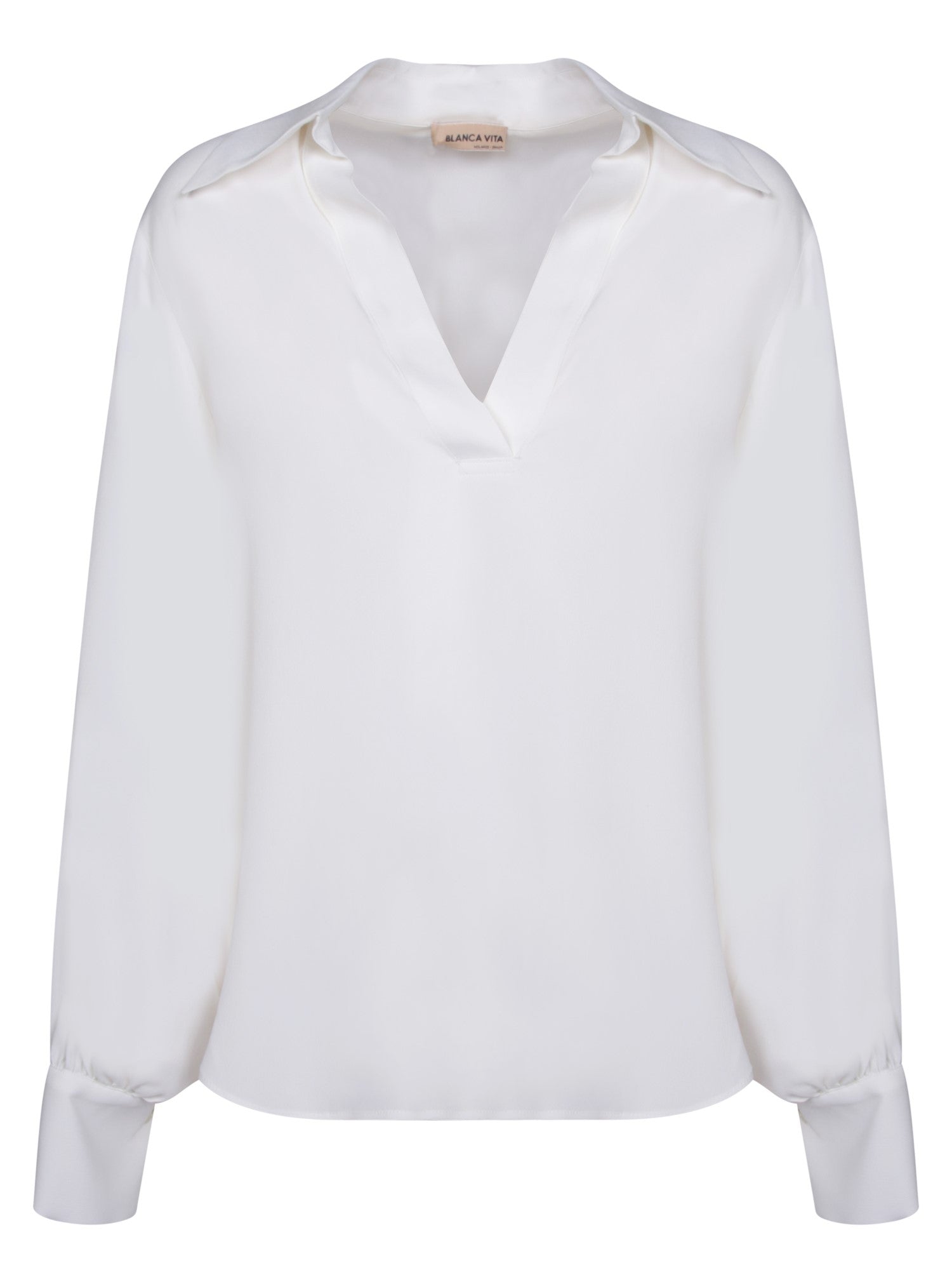 Essential elegance defines this Blanca Vita silk blend blouse, featuring a sophisticated V-neck and buttoned cuffs adding a touch of finesse.