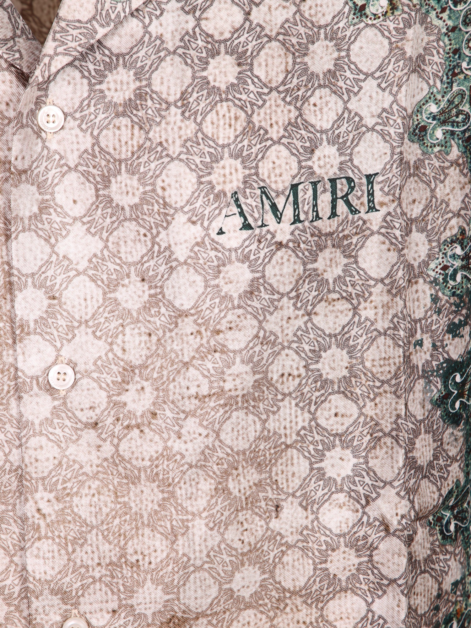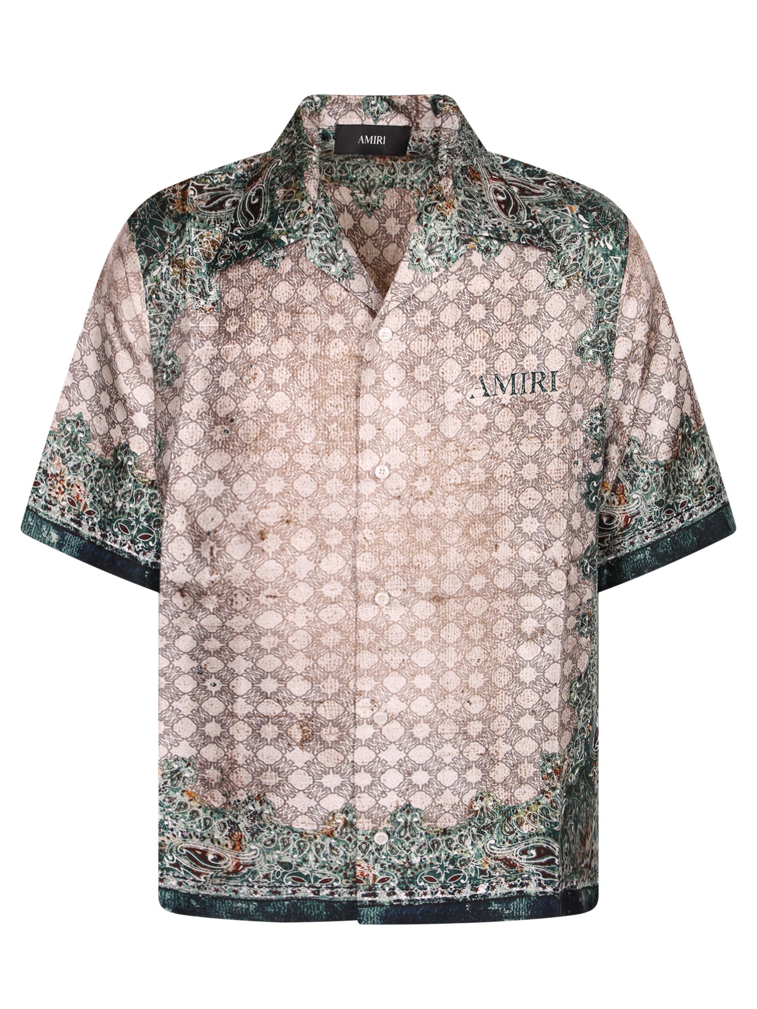 Lightweight silk shirt. Bandana pattern. Classic collar, short sleeves. AMIRI print on chest.