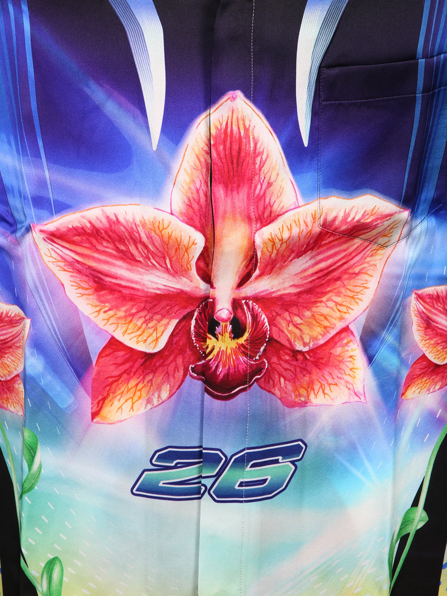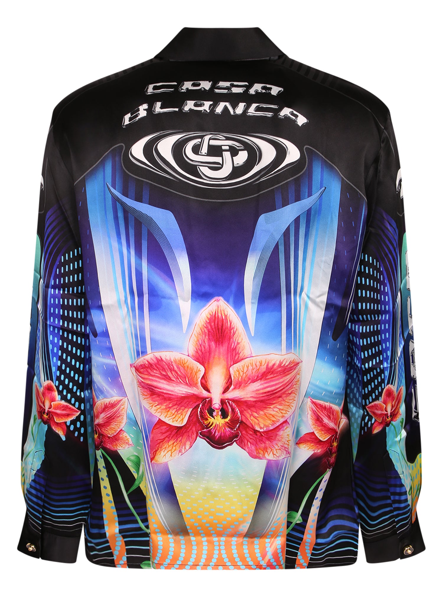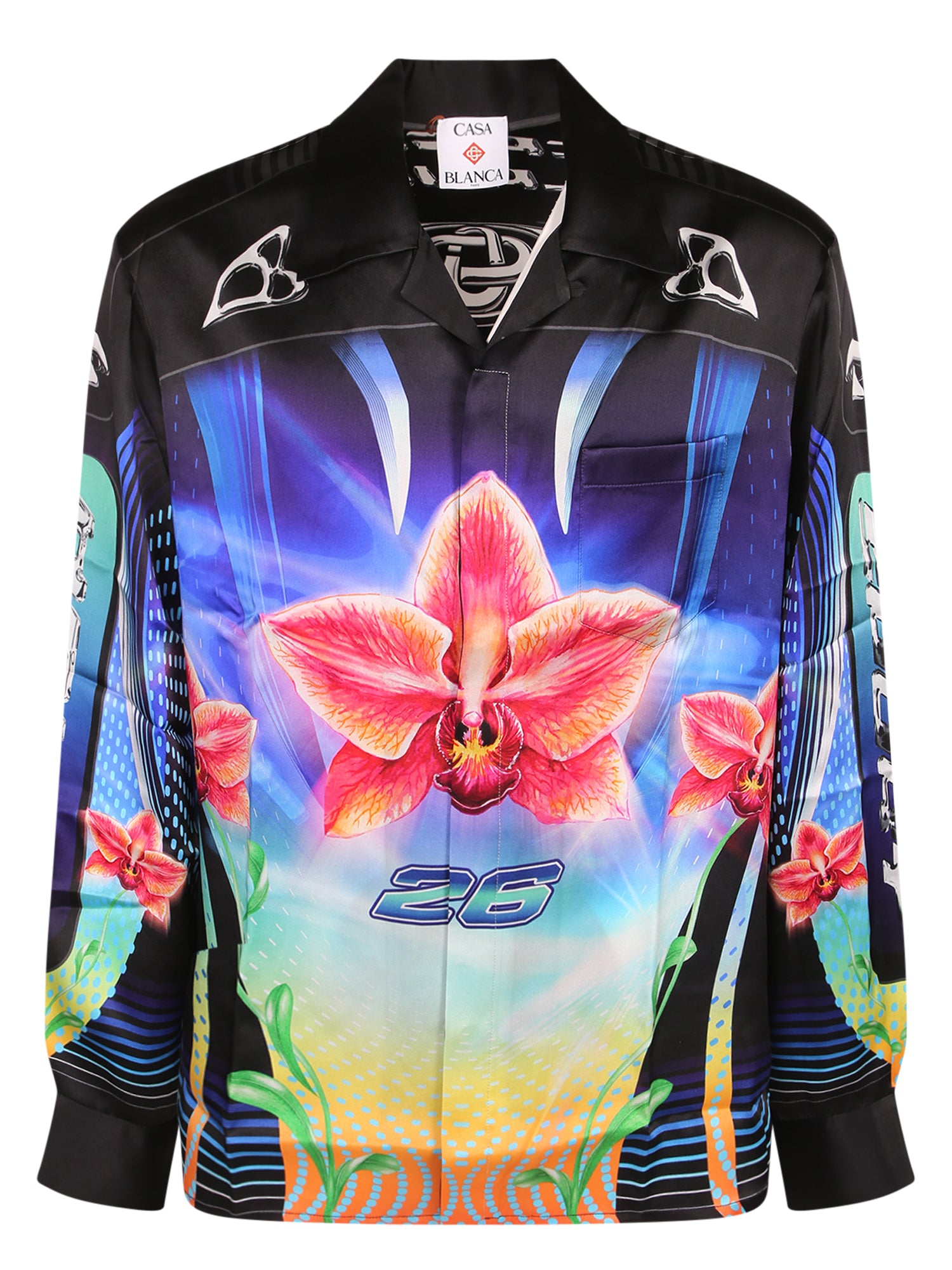 Vibrant orchid print. Long sleeves and classic collar. Smooth silk fabric.
